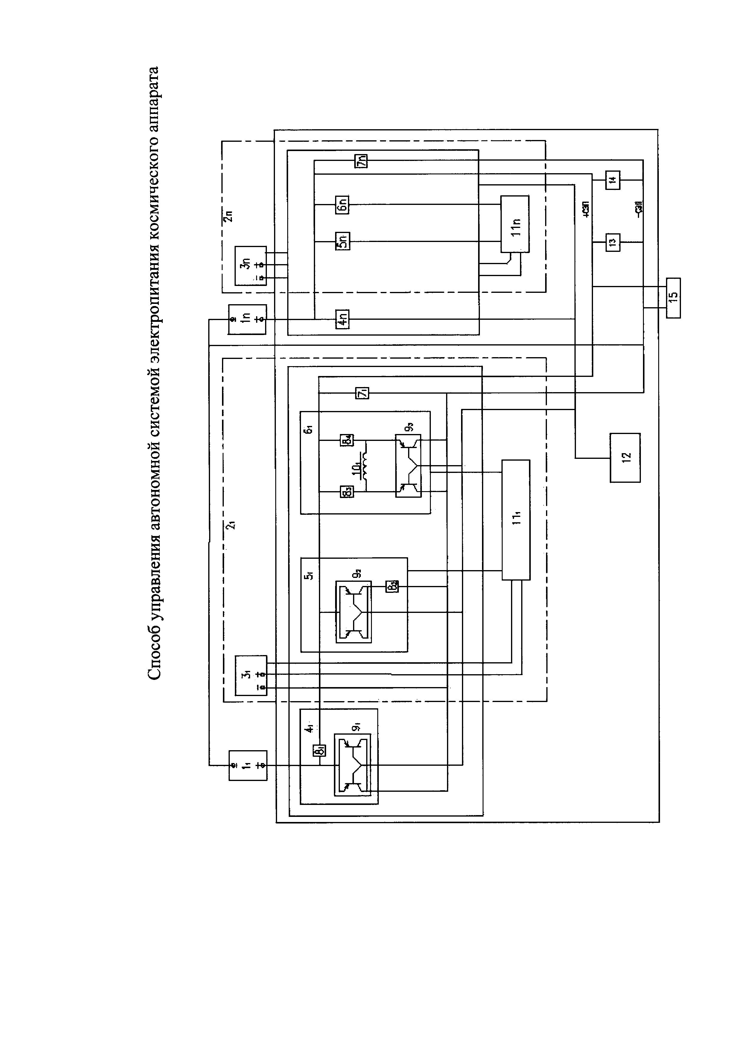 Предлагаемое изобретение относится к электротехнике, а именно к автономным системам электропитания (СЭП) космических аппаратов (КА), использующим в качестве первичного источника энергии батарею солнечную (БС), а в качестве накопителей энергии - аккумуляторные батареи (АБ). В СЭП осуществляют непрерывное единое управление регуляторами избыточной мощности (РИМ), регуляторами заряда (РЗ) и регуляторами разряда (РР) в зависимости от входного и выходного напряжений СЭП. При мощности БС больше мощности, потребляемой нагрузкой, возможны два варианта: 1-й вариант: если вся избыточная мощность не может быть использована для заряда АБ, то в данном случае РИМ обеспечивают ограничение избыточной мощности БС и стабилизацию выходного напряжения СЭП; 2-й вариант: если вся избыточная мощность может быть использована для заряда АБ, то в данном случае РЗ обеспечивают стабилизацию выходного напряжения СЭП. При мощности БС меньше мощности, потребляемой нагрузкой, недостающая мощность обеспечивается разрядом АБ, а РР обеспечивают стабилизацию выходного напряжения СЭП. В зависимости от степени заряженности АБ производят запрет или разрешение работы РЗ и РР. Известен способ управления автономной системой электропитания КА (патент РФ на изобретение №2467449, H02J 7/34, 2012, ближайший аналог), заключающийся в управлении стабилизатором напряжения, зарядными и разрядными устройствами в зависимости от входного и выходного напряжения СЭП; контроле выходного напряжения СЭП с помощью порогового датчика; контроле степени заряженности АБ; запрете на работу соответствующего зарядного устройства при достижении максимального уровня заряженности данной АБ и снятии этого запрета при снижении уровня заряженности; запрете на работу соответствующего разрядного устройства при достижении минимального установленного уровня заряженности данной АБ и снятии этого запрета при повышении уровня заряженности данной АБ; запрете работы всех разрядных устройств и прекращении управления разрядными устройствами при аварийном разряде АБ в случае потери ориентации БС на Солнце; формировании и запоминании управляющего сигнала в бортовой комплекс управления КА для отключения части бортовой аппаратуры при аварийном разряде нескольких АБ до минимального уровня заряженности; снятии запрета на работу всех разрядных устройств при аварийном разряде всех АБ до минимального уровня заряженности; запрете работы всех разрядных устройств и прекращении управления разрядными устройствами по сигналам об уровне заряженности АБ, в случае если после запоминания управляющего сигнала при аварийном разряде АБ выходное напряжение СЭП снижается до заданного порогового значения; питание оставшейся включенной части бортовой аппаратуры (БА) от БС через стабилизатор напряжения (СН) после восстановления ориентации БС на Солнце; сбросе запоминания управляющего сигнала при аварийном разряде АБ после заряда всех АБ по внешней команде; снятии запрета работы всех разрядных устройств и возобновлении управления разрядными устройствами по сигналам об уровне заряженности при заряде АБ до некоторого значения емкости. Известный способ управления СЭП имеет ряд недостатков: - через СН в рассматриваемой схеме СЭП проходит вся электроэнергия, потребляемая нагрузкой, что приводит к увеличению 