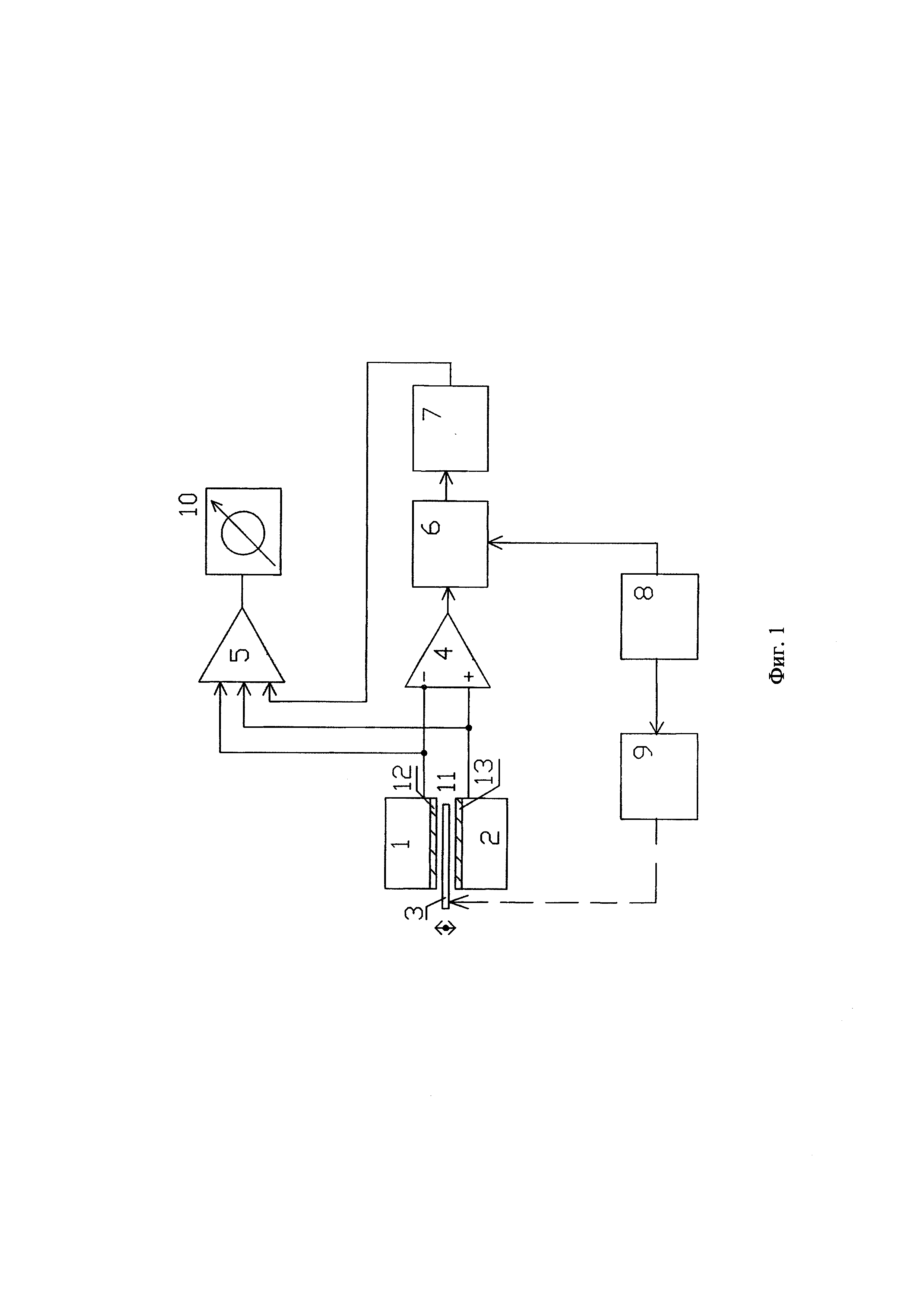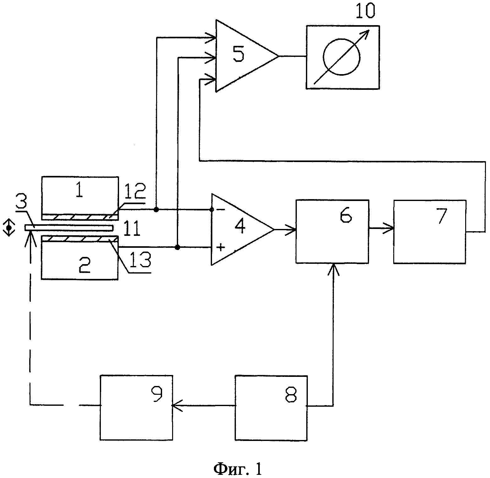 Измеритель напряженности электрического поля вибрационного типа, содержащий чувствительный и экранирующий электроды, усилитель, синхронный детектор, фильтр нижних частот, генератор, электромеханический привод, механически связанный с экранирующим электродом, и индикатор, выход генератора подключен к электромагнитному приводу и управляющему входу синхронного детектора, отличающийся тем, что в него введены второй чувствительный электрод и второй усилитель, причем чувствительные электроды установлены в одной плоскости с зазором симметрично относительно экранирующего электрода, при этом вибрирующая часть экранирующего электрода в одном крайнем положении электростатически связана с локальным участком первого чувствительного электрода, а в другом крайнем положении электростатически связана с локальным участком второго чувствительного электрода, площади локальных участков чувствительных электродов, прилегающие к зазору, установлены равными между собой и имеют значения больше нуля, но меньше полных площадей чувствительных электродов, обращенных в сторону исследуемого поля, кроме того, первый усилитель выполнен дифференциальным, а второй усилитель - суммирующим, первый и второй чувствительные электроды подключены к инвертирующему и неинвертирющему входам дифференциального усилителя, выход которого соединен с измерительным входом синхронного детектора, причем первый и второй чувствительные электроды подключены соответственно к первому и второму входам суммирующего усилителя, выход синхронного детектора через фильтр нижних частот соединен с третьим входом суммирующего усилителя, выход которого подключен к индикатору.