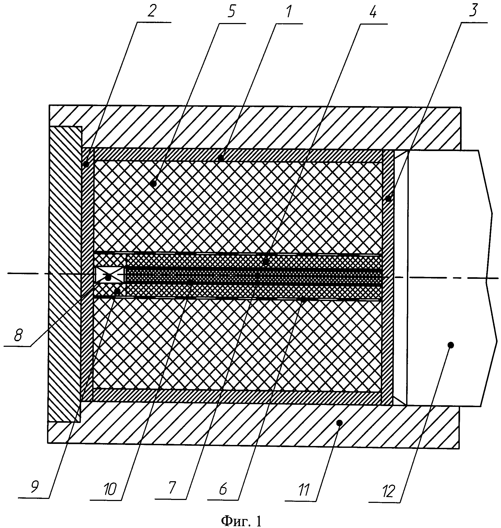 Изобретение относится к газодинамическим устройствам, используемым в ствольных баллистических установках и в установках для создания интенсивных механических нагрузок на различные объекты. Известен газодинамический источник давления (ГИД), содержащий корпус, в котором размещен полый цилиндрический пороховой заряд с воспламенителем из взрывчатого вещества и средством воспламенения, описанный в патенте Российской Федерации №2135927, F41F 1/00, опубликованный 27.08.1999 г. Недостатком данного ГИД является наличие значительного воздушного зазора для исключения передачи детонации пироксилиновому пороху, что приводит к увеличению внутреннего объема камеры, а для обеспечения необходимых параметров давления (фронта нарастания, амплитуды и общей длительности нагружающего импульса) требуется установка специальных дросселирующих устройств, что усложняет конструкцию ГИД. Ближайшим техническим решением, выбранным в качестве прототипа, является ГИД, содержащий корпус, в котором размещен газогенерирующий заряд из пороха и стержневой осевой инициирующий заряд из взрывчатого вещества, инициирующее устройство и перфорированный вкладыш, формирующий внутренний объем газогенерирующего заряда, установленные коаксиально в полости порохового заряда, описанный в патенте Российской Федерации №2357181, F41F 1/00, опубликованный 27.05.2009 г. Недостатком данного ГИД является то, что для исключения передачи детонации пироксилиновому пороху необходим значительный воздушный зазор, что приводит к увеличению внутреннего объема взрывной камеры и массы пороха, необходимого для обеспечения той же плотности заряжания, а для изменения параметров импульса давления требуется применение специальных дросселирующих устройств, что усложняет их конструкцию. Задача, решаемая предлагаемым изобретением, заключается в упрощении конструкции ГИД, в сокращении времени воспламенения порохового газогенерирующего заряда, в расширении диапазона создаваемых импульсов давления. Технический результат заключается в том, что удалось упростить конструкцию газодинамического источника давления, сократить время и увеличить надежность воспламенения порохового газогенерирующего заряда за счет исключения воздушного зазора между инициирующим зарядом ВВ и пироксилиновым порохом; расширить диапазон создаваемых импульсов давления за счет возможности варьирования соотношением компонентов ГИД и реализации различных скоростей их взрывчатого превращения. Для получения такого технического результата предлагаемый газодинамический источник давления, включающий корпус, в котором размещен газогенерирующий заряд из пороха, стержневой осевой инициирующий заряд из взрывчатого вещества и перфорированный вкладыш, установленные коаксиально в полости корпуса, и инициирующее устройство, согласно изобретению, он снабжен демпфирующим зарядом, выполненным в виде прослойки из дымного пороха, расположенным между инициирующим зарядом и перфорированным вкладышем, газогенерирующий заряд снаряжен порохом, не детонирующим в обычных условиях, при этом газогенерирующий, инициирующий, демпфирующий заряды и перфорированный вкладыш установлены без воздушного зазора. Это приводит к тому, что введение в ГИД прослойки дымного ружейного пороха обеспечивает демпфирование детонационной 