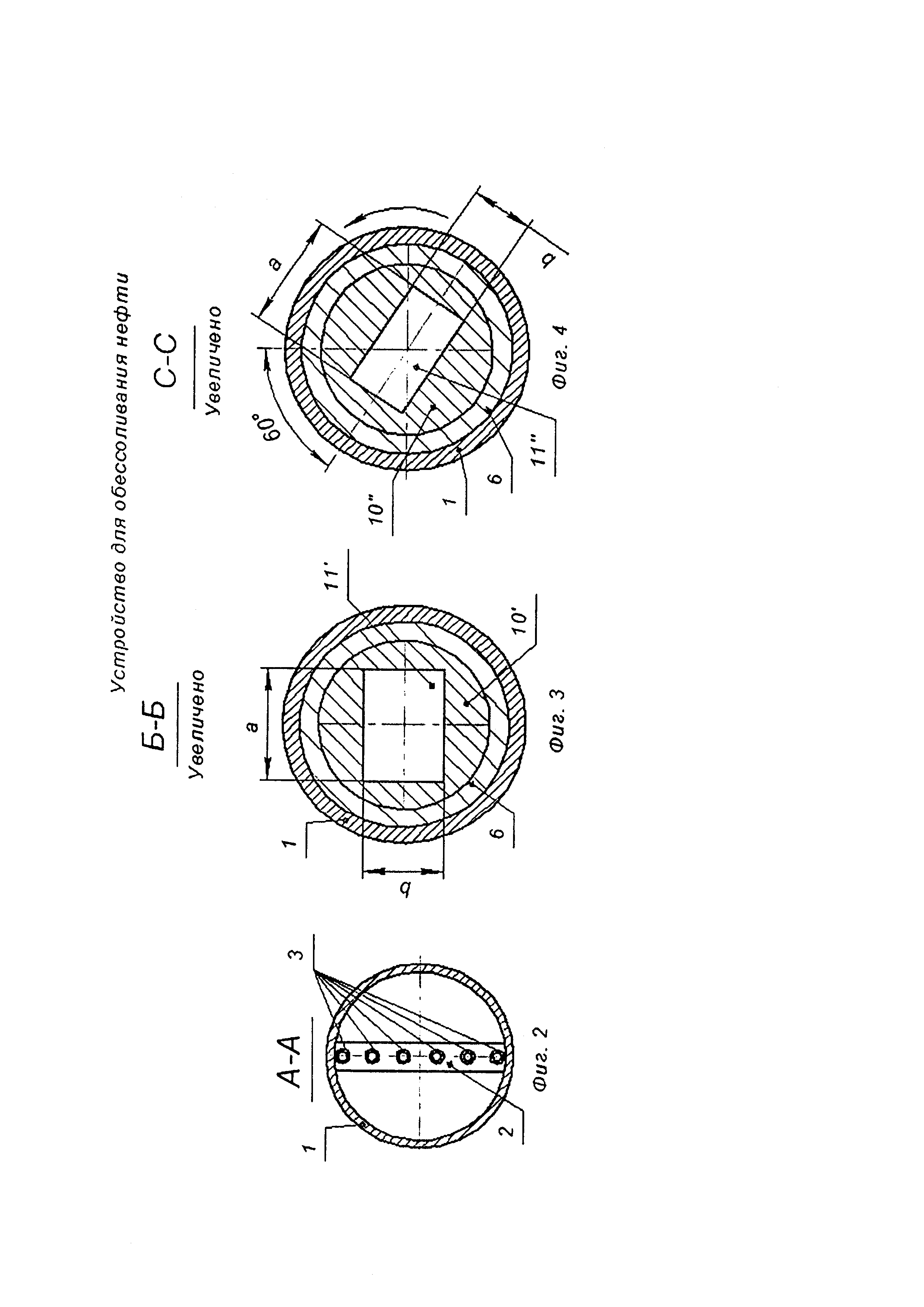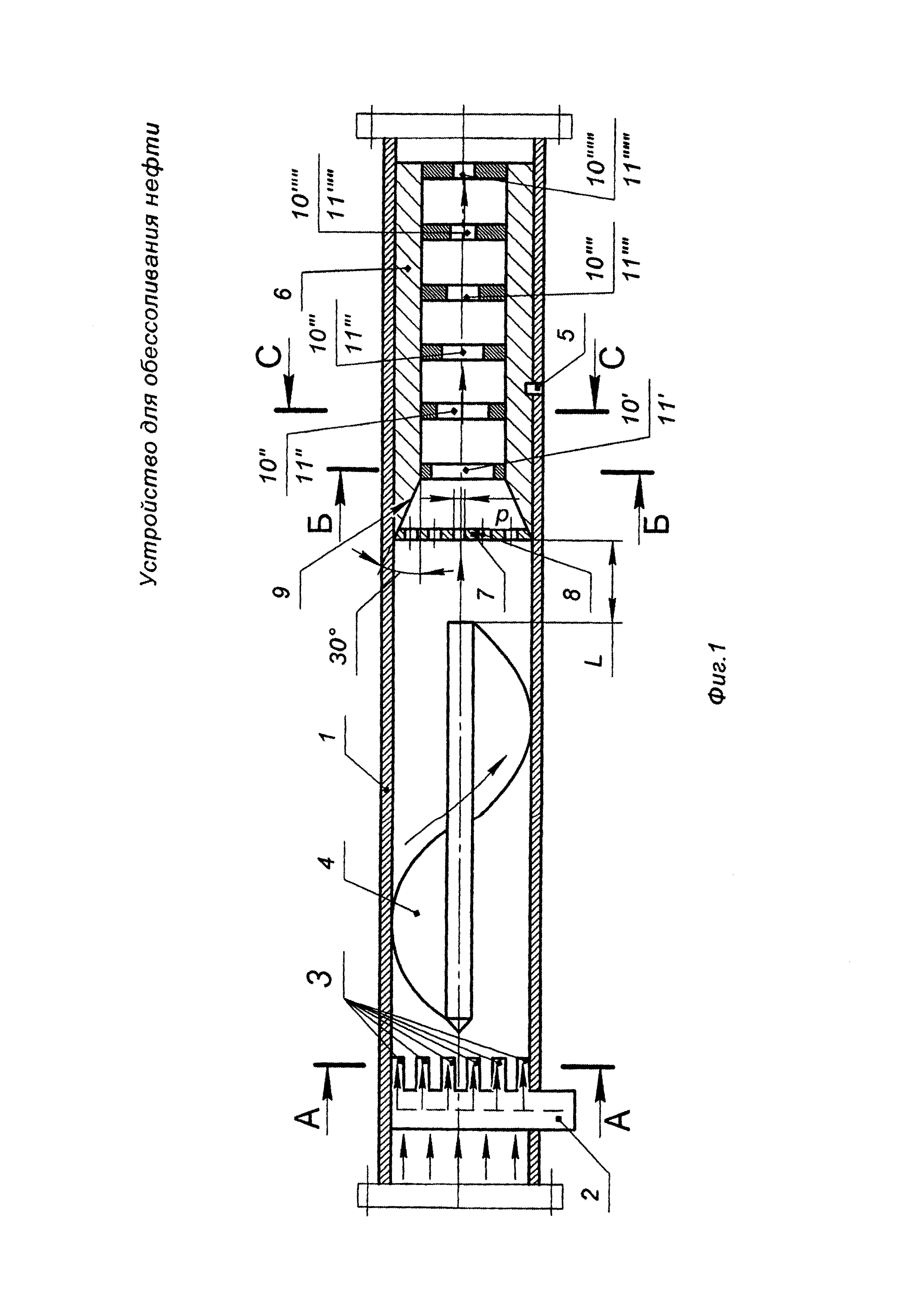 Узел обессоливания нефти, состоящий из корпуса в виде катушки с фланцевыми соединениями по краям, расположенного на участке нефтепровода, внутри корпуса находится Г-образная трубка с насадками для подачи воды под давлением, превышающим давление нефти в нефепроводе, отличающийся тем, что насадки в Г-образной трубке выполнены в виде пакета труб, вертикально сориентированных по направлению потока нефти с охватом поперечного сечения корпуса, при этом в корпусе за Г-образной трубкой установлен шнек, закручивающий поток по часовой стрелке, причем за шнеком в корпусе с возможностью фиксации и перемещения установлен полый цилиндр, снабженный решеткой с отверстиями, конусом, сужающимся по направлению потока нефти, и поперечными диафрагмами, оснащенными центральными щелевыми отверстиями, при этом каждое последующее щелевое отверстие поперечной диафрагмы смещено на угол 60° против часовой стрелки с уменьшением пропускной способности щелевых отверстий поперечных диафрагм по направлению потока.