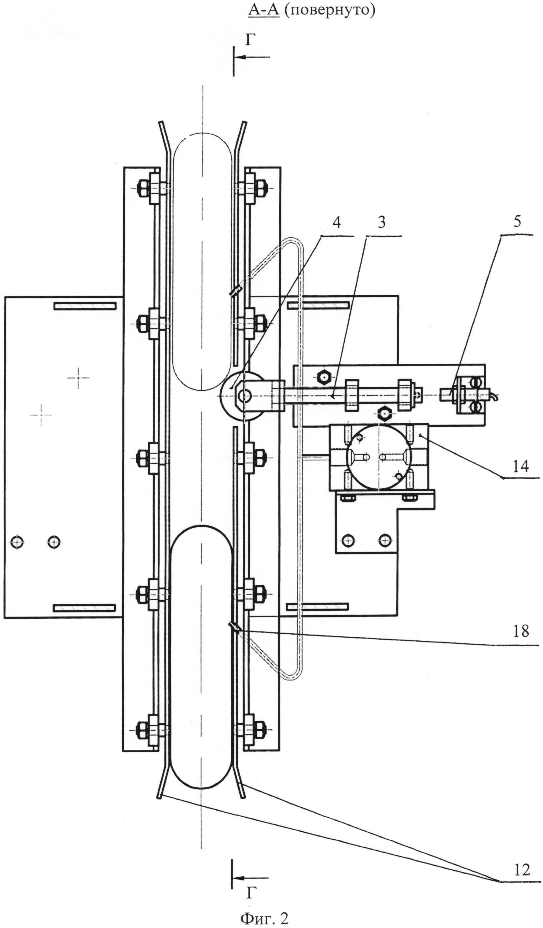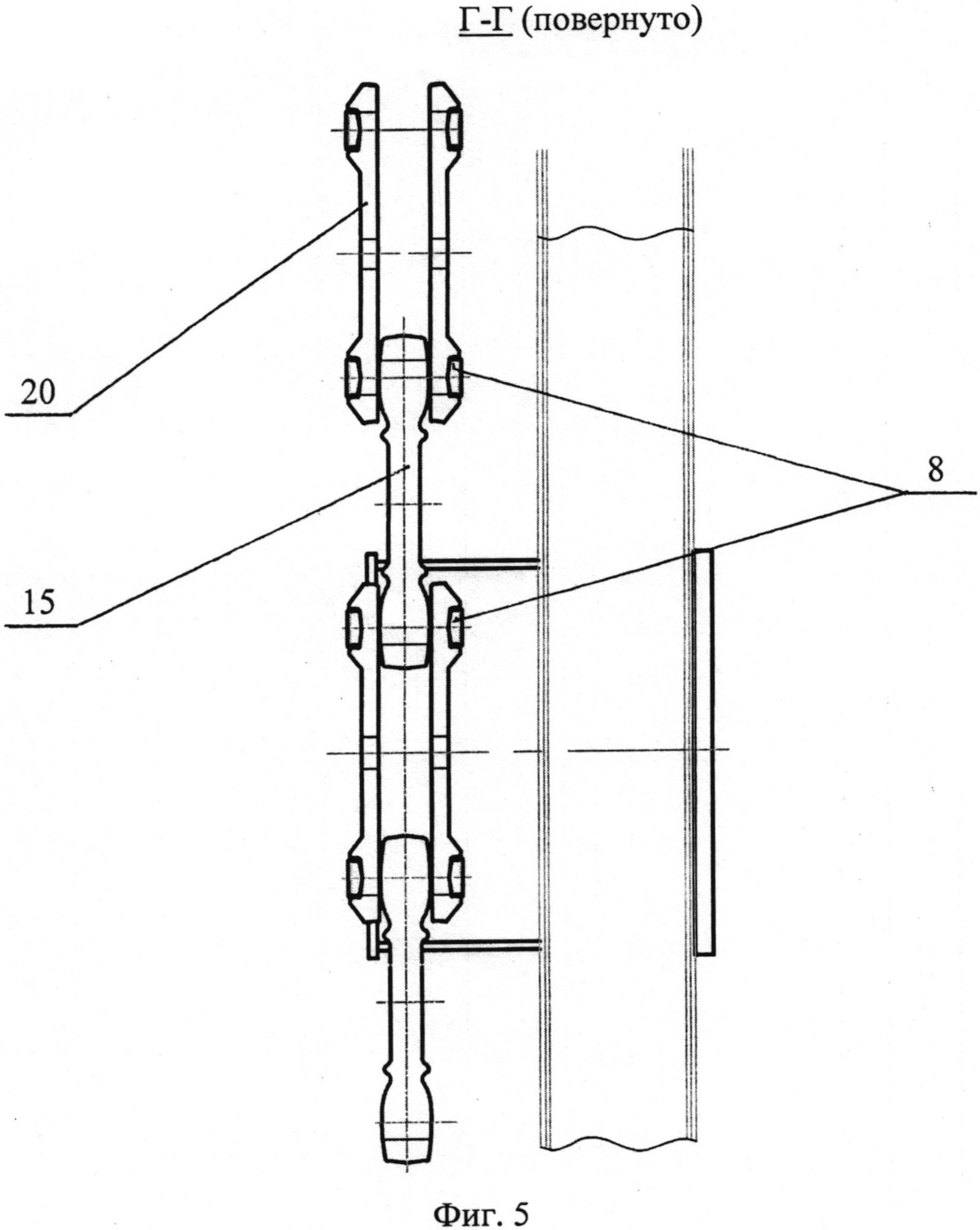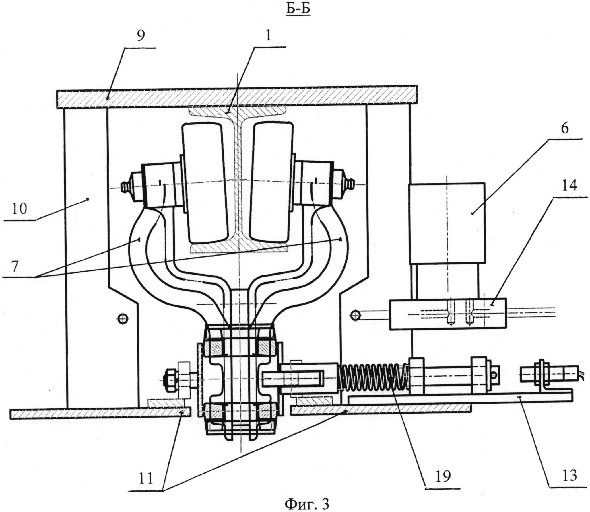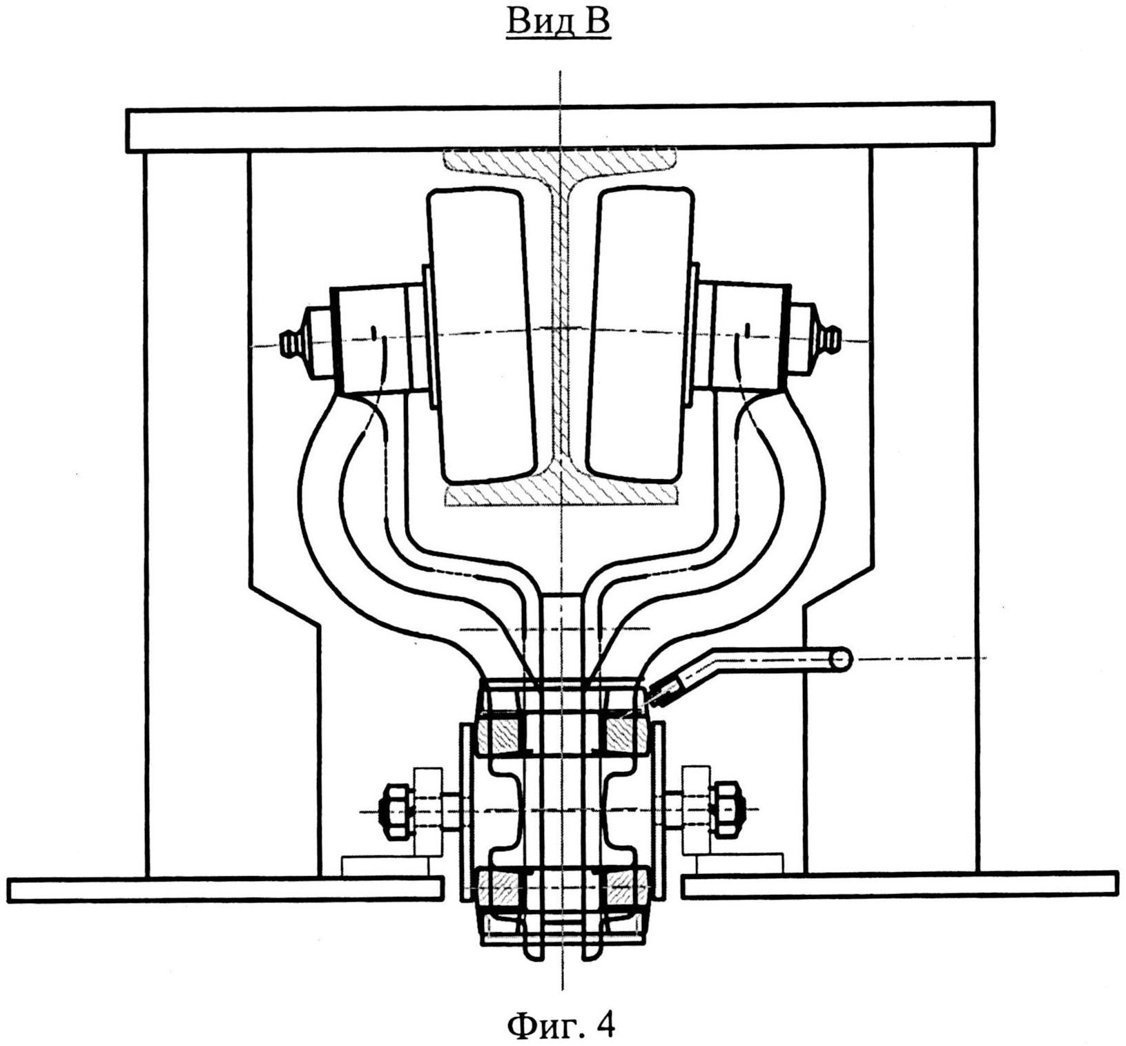 Настоящее изобретение относится к вспомогательным устройствам конвейеров, а именно к устройствам для смазки цепей, и может быть использовано для автоматической смазки шарниров тяговой цепи подвесного конвейера. Наиболее близким к заявляемому изобретению является «Устройство для смазки подшипников кареток тяговой цепи», патент SU №2306461, F16C 33/66, F16N 7/32, B65G 45/02. Данное устройство для смазки подшипников кареток тяговой цепи включает в себя трассу с расположенными на ней каретками, в которых закреплены подшипники, систему подачи смазки, состоящую из резервуара с термостойким смазочным материалом и трубопровода подачи смазочного материала с жиклерами, а также блок подготовки воздуха. На трассе, представляющей собой двутавр, установлено основание с закрепленной на нем распределительной плитой. На распределительной плите размещены конечный выключатель, связанный с электропневматическим клапаном, и два вертикально расположенных рычага. Рычаги закреплены на распределительной плите посредством винтов с возможностью свободного качения относительно этих винтов. Один из рычагов в месте крепления винтом выполнен более длинным и изогнутым с размещенным в верхней его части стержнем. Трубопровод на распределительной плите разветвляется для подвода смазочного материала к каждому из жиклеров. Жиклеры заключены в ролики и размещены в нижней части рычагов. Недостатками известного устройства являются: - отсутствие возможности осуществлять смазку шарниров тяговой цепи, что влечет за собой низкий срок службы цепи; - сложность конструкции. Заявляемое техническое решение направлено на увеличение срока службы тяговой цепи и упрощение конструкции. Технический результат достигается тем, что устройство для автоматической смазки шарниров тяговой цепи подвесного конвейера, включающее представляющую собой двутавр трассу с расположенными на ней каретками, основание с распределительной плитой, блок подготовки воздуха, систему подачи смазочного материала, состоящую из резервуара со смазкой и трубопровода подачи смазочного материала, разветвляющегося на распределительной плите для подвода смазки к каждому из жиклеров, и конечный выключатель, связанный с электропневматическим клапаном, содержит расположенную по обе стороны трассы несущую плиту, на которой посредством боковин закреплены две опорные плиты с установленными на них стабилизаторами цепи, при этом основание закреплено на одной из опорных плит и на нем посредством кронштейнов размещены конечный выключатель и связанная с ним подпружиненная ось с роликом, взаимодействующим с внутренним звеном тяговой цепи. На фиг. 1 показано устройство для автоматической смазки шарниров тяговой цепи подвесного конвейера, общий вид. На фиг. 2 - разрез А-А на фиг. 1. На фиг. 3 - разрез Б-Б на фиг. 1. На фиг. 4 - вид В на фиг. 1. На фиг. 5 - разрез Г-Г на фиг. 1. Устройство для автоматической смазки шарниров тяговой цепи подвесного конвейера состоит из трассы 1 с каретками, блока 2 подготовки воздуха и системы подачи смазки. При этом для осуществления процесса смазки в устройстве содержится подпружиненная ось 3 с закрепленным на ней роликом 4 и конечный выключатель 5, связанный с электропневматическим клапаном 6. Трасса 1 представляет собой двутавр, а каждая каретка состоит из левой и правой полукареток 7, разм