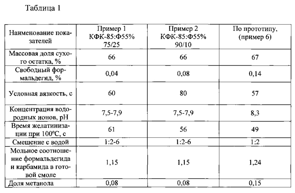 Способ получения карбамидоформальдегидной смолы путем конденсации карбамида и низкометанольного карбамидоформальдегидного концентрата в водной среде с переменным рН, включающий слабощелочную конденсацию, которую ведут при мольном соотношении карбамида к формальдегиду 1:2 и температуре 90°C, поликонденсацию реакционной массы в кислой среде до достижения вязкости реакционной массы в диапазоне 100-130 с, доконденсацию реакционной массы с дополнительным вводом карбамида при температуре 70°C и рН 7,5-8,5 до мольного соотношения карбамида к формальдегиду 1:1,15, последующее охлаждение до температуры 20-25°C и фасовку готовой смолы, отличающийся тем, что предварительно перед слабощелочной конденсацией с карбамидом в карбамидоформальдегидный концентрат вводят 55%-ный формалин при соотношении компонентов, мас. %: и выдерживают при комнатной температуре и перемешивании в течение 6 часов при рН 7,3-7,8, после введения карбамида ведут слабощелочную конденсацию в течение 0,5 часа при рН 7,1-7,3, а кислую стадию поликонденсации осуществляют при рН 4,7-4,9 и температуре 96-98°C.карбамидоформальдегидный концентрат 75-90 формалин 25-10,