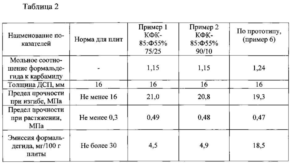 Изобретение относится к способу получения карбамидоформальдегидной смолы, используемой в качестве связующих и клеев, в частности, для изготовления фанеры, древесно-стружечных и древесно-волокнистых плит. Способ получения карбамидоформальдегидной смолы путем конденсации карбамида и низкометанольного карбамидоформальдегидного концентрата в водной среде с переменным pH включает несколько стадий. Предварительно перед слабощелочной конденсацией в карбамидоформальдегидный концентрат вводят 55%-ный формалин при соотношении компонентов, мас. %: карбамидоформальдегидный концентрат 75-90 мас. %, формалин 25-10 мас. %, и выдерживают при комнатной температуре и перемешивании в течение 6 часов при pH 7,3-7,8. После чего вводят карбамид и проводят слабощелочную конденсацию при мольном соотношении карбамида к формальдегиду 1:2, в течение 0,5 часа при pH 7,1-7,3 и температуре 90°C. Стадию поликонденсации реакционной массы проводят в кислой среде при pH 4,7-4,9 и температуре 96-98°C до достижения вязкости реакционной массы в диапазоне 100-130 с. Доконденсацию реакционной массы с дополнительным вводом карбамида проводят при температуре 70°C и pH 7,5-8,5 до мольного соотношения карбамида к формальдегиду 1:1,15. После чего готовую смолу охлаждают до температуры 20-25°C и фасуют. Полученная карбамидоформальдегидная смола на основе низкометанольного карбамидоформальдегидного концентрата с содержанием свободного формальдегида до 0,04% и метанола до 0,08% позволяет снизить эмиссию формальдегида из изделий, изготовленных с ее использованием. 2 табл.