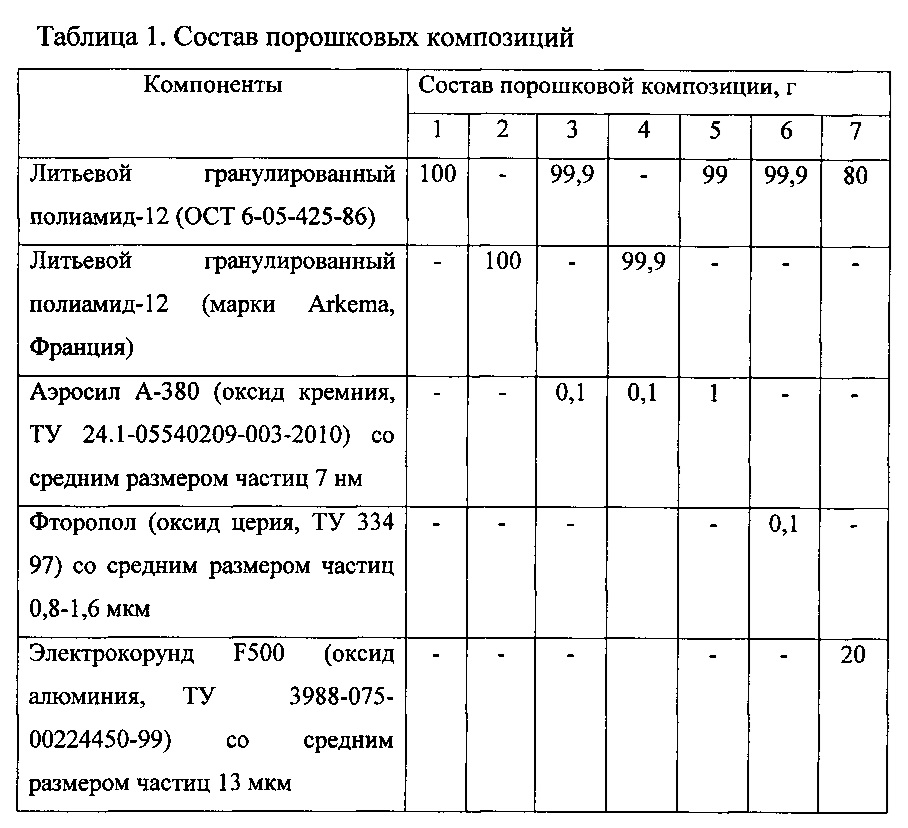 Группа изобретений относится к области порошковых термопластичных материалов на основе полиамидов. Порошковая композиция может быть использована в качестве расходного материала для аддитивного синтеза изделий методом селективного лазерного сплавления (СЛС), порошкового связующего и компонента порошковых покрытий. Известна порошковая полимерная композиция, содержащая 40-50% оксида алюминия и 60-50% полиамида-12 для СЛС марки Duraform. Способ получения данной композиции заключается в растворении порошкового полиамида-12 для СЛС марки Duraform в присутствии порошка Al2O3 с размером частиц ≈0,3 мкм при температуре 140°C в течение 15 минут в 9-кратном массовом избытке диметилсульфоксида (ДМСО) с последующим охлаждением раствора. При охлаждении раствора в осадок выпадает композиция, которую фильтруют, промывают этанолом и сушат в течение 24 часов при 80°C. Полученную композицию можно использовать в технологии СЛС. Порошковая композиция имеет размеры частиц от 2 до 105 мкм, имеющих разницу между пиками плавления и кристаллизации 26,6-27,3°C (статья «Preparation and indirect selective laser sintering of alumina/PA microspheres» K. Shahzad, J. Deckers, S. Boury, B. Neirinck, J.-P. Kruth, J. Vleugels // Ceramics International, 38, 2012, c. 1241-1247). Недостатком описанной композиции и способа ее изготовления является использование в качестве исходного сырья дорогостоящего порошкового полиамида-12 марки Duraform. Известна порошковая композиция на основе алифатических полиамидов, в структуре которых содержатся фрагменты, содержащие более 8 углеродных атомов между амидными группами в цепи: нейлон-6/12, нейлон-11, нейлон-12. В качестве наполнителя композиция содержит от 0,01 до 30 мас.% TiO2. Способ получения порошковой композиции основан на растворении полиамидов или их смесей в этаноле, содержащем бутанон-2 и 1% воды, в течение 5 часов при температуре 145°C с последующим осаждением композиции при температуре 109°C. Способ обеспечивает получение порошков для аддитивного синтеза изделий методом СЛС с насыпной плотностью 0,433-0,463 г/см3 и количеством частиц с размером в диапазоне 32-100 мкм не менее 92% (US 7148286 B2, 12.12.2006). Наиболее близким аналогом предложенной полимерной порошковой композиции является композиция, применяемая в технологии СЛС, содержащая полиамид-12 или полиамид-1010, или полиамид-1212 и неорганические наполнители, представляющие собой порошки соединений, таких как: Al2O3, TiO2, ZrO2, SiO2, ZnO, CeO2, BN, B12C3 в количестве 1-60% от массы композиции. Способ получения порошковой композиции-прототипа заключается в растворении полиамида в присутствии неорганического наполнителя в пятикратном массовом избытке раствора этанола, содержащего бутанон-2 и воду, в течение 5 часов при температуре 145-155°C, кристаллизации порошковой композиции при температуре 130-110°C в течение 40-120 минут и дальнейшей отгонке растворителя при пониженном давлении. Способ позволяет получать порошки с насыпной плотностью 0,3-0,5 г/см3 и размером частиц в диапазоне 12-90 мкм (US 8232333 B2, 31.07.2012). К недостаткам описанных выше методов можно отнести сложность аппаратурного оформления процесса. Температура кипения этанола при нормальном давлении составляет ≈78°C. Таким образом, для нагрева его в конденсированном состоянии до температур 145-155°C требуется повышенное давление. На основании литературных данных (А. Гордон, Р. Форд // Спутник химика. - М.: Мир, 1976 г.), нагрев этилового спирта до температуры 145-155°C возможен при давлении н