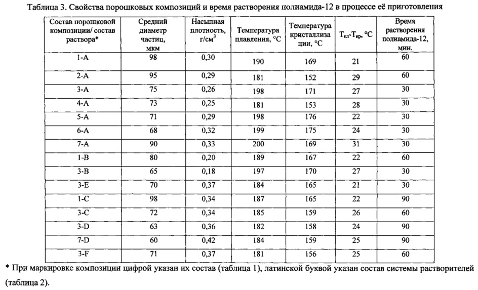 Группа изобретений относится к порошковым термопластичным материалам на основе полиамидов, которые могут быть использованы в качестве расходного материала для аддитивного синтеза изделий методом селективного лазерного сплавления, порошкового связующего и компонента порошковых покрытий. Порошковую полимерную композицию получают растворением полиамида-12 в присутствии неорганического наполнителя, последующей кристаллизацией порошковой полимерной композиции из полученного раствора и отгонкой растворителя при пониженном давлении. Перед растворением полиамид-12 и неорганический наполнитель смешивают посредством экструзии. Полученный гранулят растворяют в системе полярный апротонный растворитель/спирт, содержащей 70-95 мас.% полярного апротонного растворителя и 5-30 мас.% спирта, с температурой кипения компонентов системы не менее 150°C. Композиция, полученная данным способом, содержит 60-99.9 мас.% полиамида-12 и 0,1-40 неорганического оксида. Способ обеспечивает снижение времени растворения полиамида-12 до менее 2 часов при получении полимерной композиции со средним размером частиц 60-72 мкм, насыпной плотностью 0,34-0,42 г/сми с максимумом интенсивности (пиком) температуры плавления не менее 180°C, а также исключение технологических стадий при повышенном давлении. 2 н. и 2 з.п. ф-лы, 3 табл., 5 пр.
