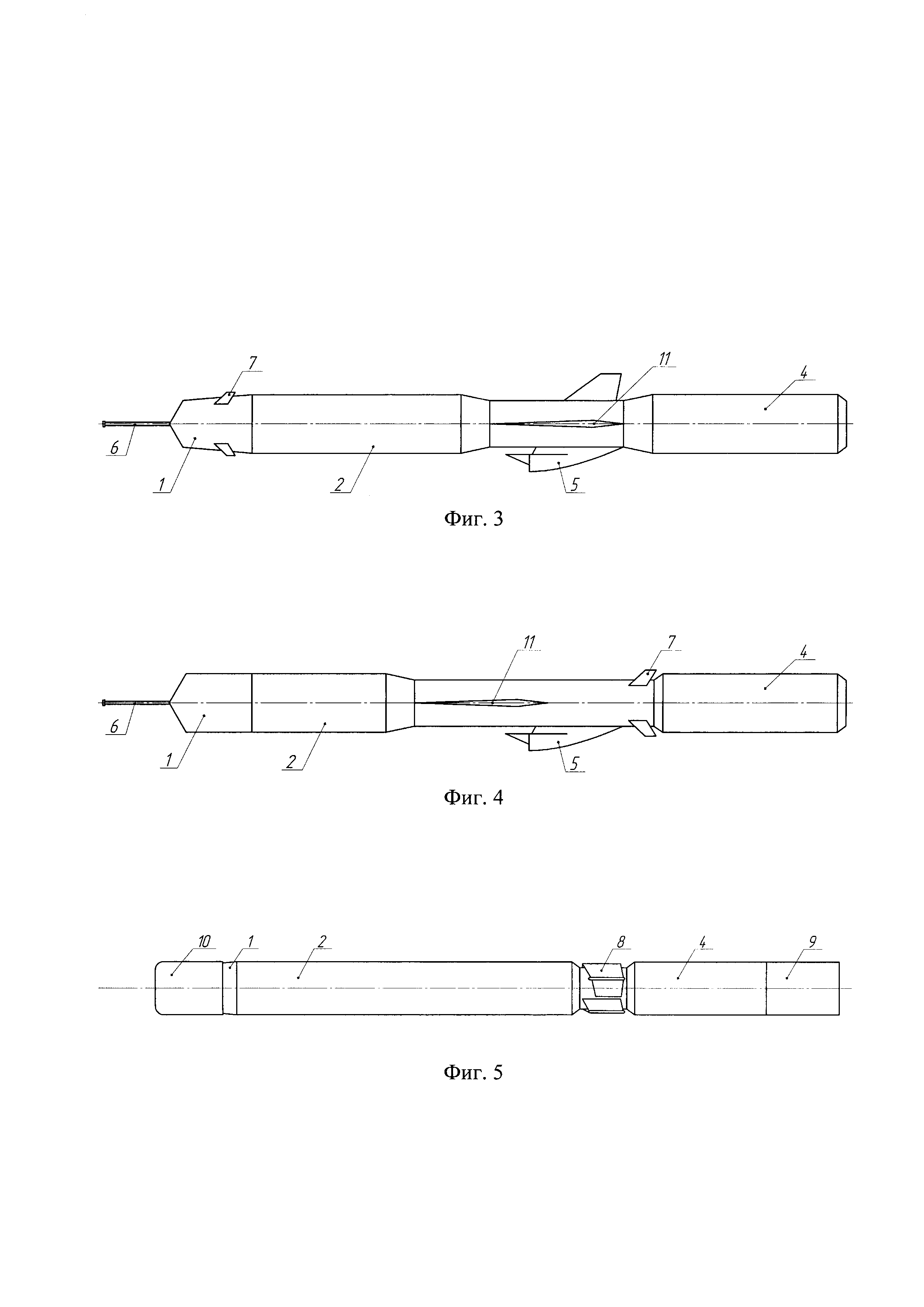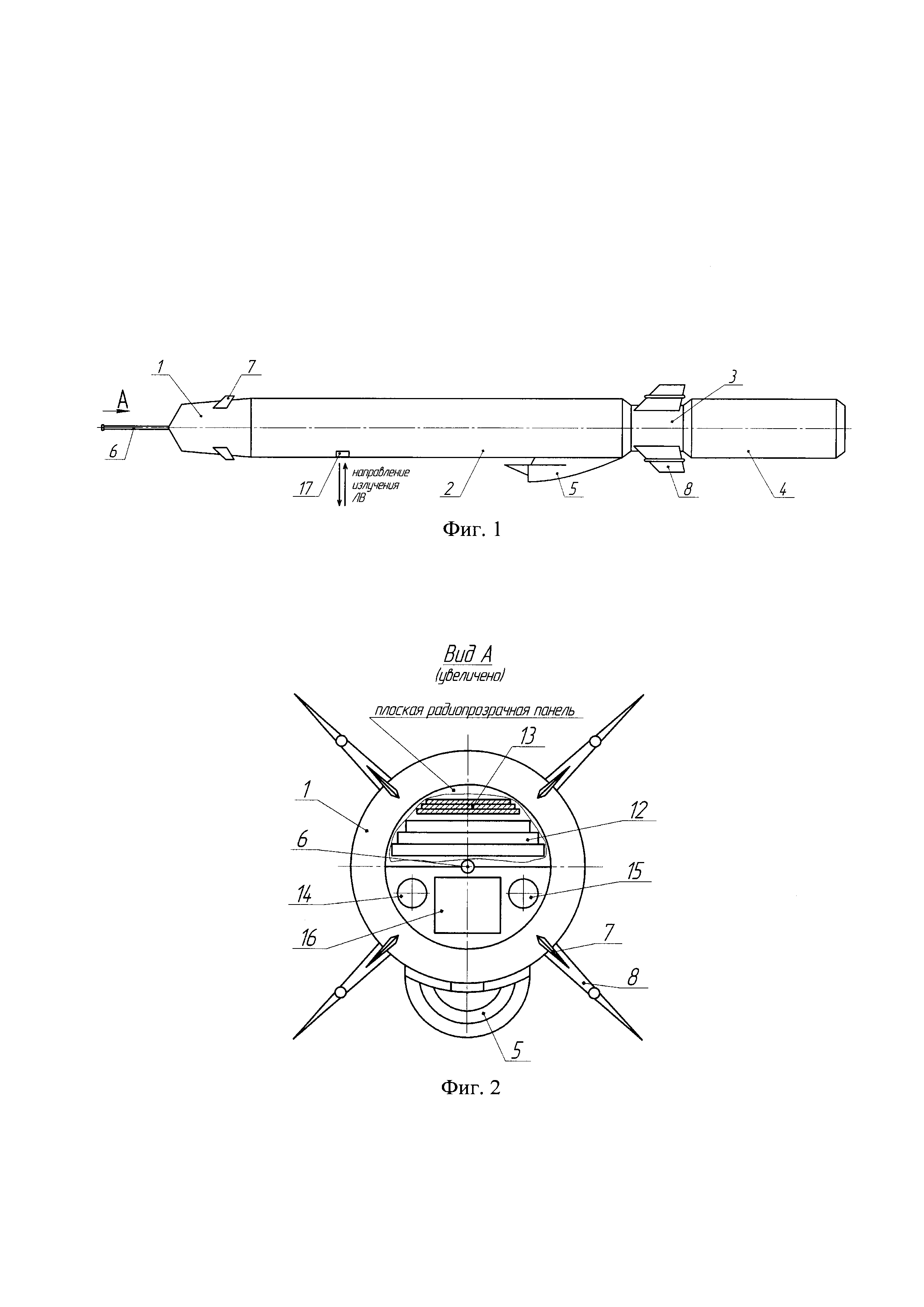 Изобретение относится к управляемому ракетному оружию (УРО), а более конкретно - к крылатым и аэробаллистическим ракетам с прямоточными воздушно-реактивными двигателями (ПВРД). Известны изделия УРО, оснащенные ПВРД, а также твердотопливными стартово-разгонными ступенями (СРС) для предварительного набора скорости и запуска ПВРД - см., например, С.М. Ганин, А.В. Карпенко, В.В. Колногоров, Г.Ф. Петров «Беспилотные летательные аппараты», СПб., сборник «Невский бастион», изд-во «ГАНГУТ», 1999 г., стр. 22-25 (изделия «Буря», «Буран», П-20С), стр. 115 (изделие зенитного ракетного комплекса 2К11 «Круг»). Известны также реактивные снаряды, оснащенные вкладными (интегрированными) в камеру сгорания ГТВРД стартово-разгонными ступенями - см., например, А.В. Карпенко «Отечественные тактические ракетные комплексы», СПб., сборник «Невский бастион», изд-во «ГАНГУТ», 1999 г., стр. 10-12 (изделия «034», «036», «036А» ракетного комплекса «Вихрь»), Известно сверхзвуковое противокорабельное изделие УРО «Яхонт» с ПВРД и интегрированной СРС, обеспечивающее минометный старт из транспортно-пускового контейнера (ТПК) с наземных, надводных и подводных носителей, а также бесконтейнерный старт с авиационных носителей, программный с возможностью разворотов полет на малой либо большой/малой высоте в зону цели по данным системы инерциальной навигации (СИН) и радиовысотомера (РВ), поиск и селекцию цели типа «надводный корабль» (НК) посредством системы конечного наведения (СКН) - см., например, Л.Е. Макаров, В.А. Поляченко, М.А. Хомяков, А.В. Благов и др. «60 лет самоотверженного труда во имя мира» (Федеральное государственное унитарное предприятие «НПО машиностроения»), М., изд. дом «Оружие и технологии», 2004 г., стр. 87-90, 231-236 (ближайший аналог). Однако принятая конструктивно-компоновочная схема сверхзвуковой ракеты (CP) - ближайшего аналога с лобовым воздухозаборником (ВЗ) приводит к невозможности использования всей площади миделя CP для размещения антенных устройств (АУ) и визиров каналов СКН; кроме того, при маршевом сверхзвуковом полете CP только по маловысотным траекториям крыло является избыточным; кроме того, не предусмотрен старт изделия из торпедных аппаратов (ТА) подводных лодок (ПЛ). Технической задачей предлагаемого изобретения является повышение эффективности селекции НК в сложной помеховой обстановке за счет увеличения поперечного сечения головного отсека CP для размещения не менее двух каналов СКН при одновременном увеличении апертуры антенных и визирных устройств каналов, а также соответствующая оптимизация аэродинамической схемы CP с учетом старта из ТА ПЛ и реализуемых траекторий полета, дополнительно: снижение демаскирующих признаков изделия на траектории маршевого полета и участка самонаведения (СН). Указанная техническая задача решается для CP, включающей цилиндрический фюзеляж (в составе головного, центральных и хвостового отсеков), ПВРД и нерегулируемый ВЗ, бортовую аппаратуру системы управления в составе СИН, СКН, высотомера и обеспечивающих систем (электропитания, терморегулирования, силовых коммутаций рулевых приводов и т.п.), аэродинамические рули, утопленную в камере сгорания ПВРД твердотопливную СРС, следующим образом: передняя панель головного отсека фюзеляжа выполнена в виде клина с углом развала плоскостей 60°…170° в тангажной плоскости и с аэродинамическо