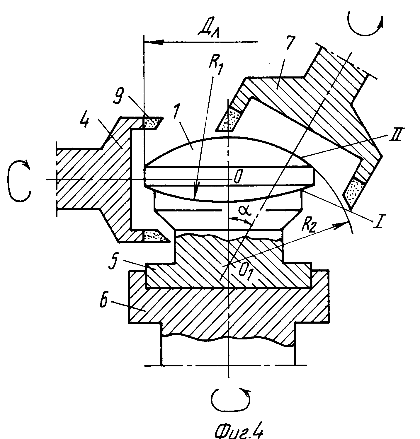 выключенной осевой подачи алмазного инструмента 4. Возможен вариант кругления, при котором обрабатываемую линзу 1 после формирования первой исполнительной поверхности I приклеивают к