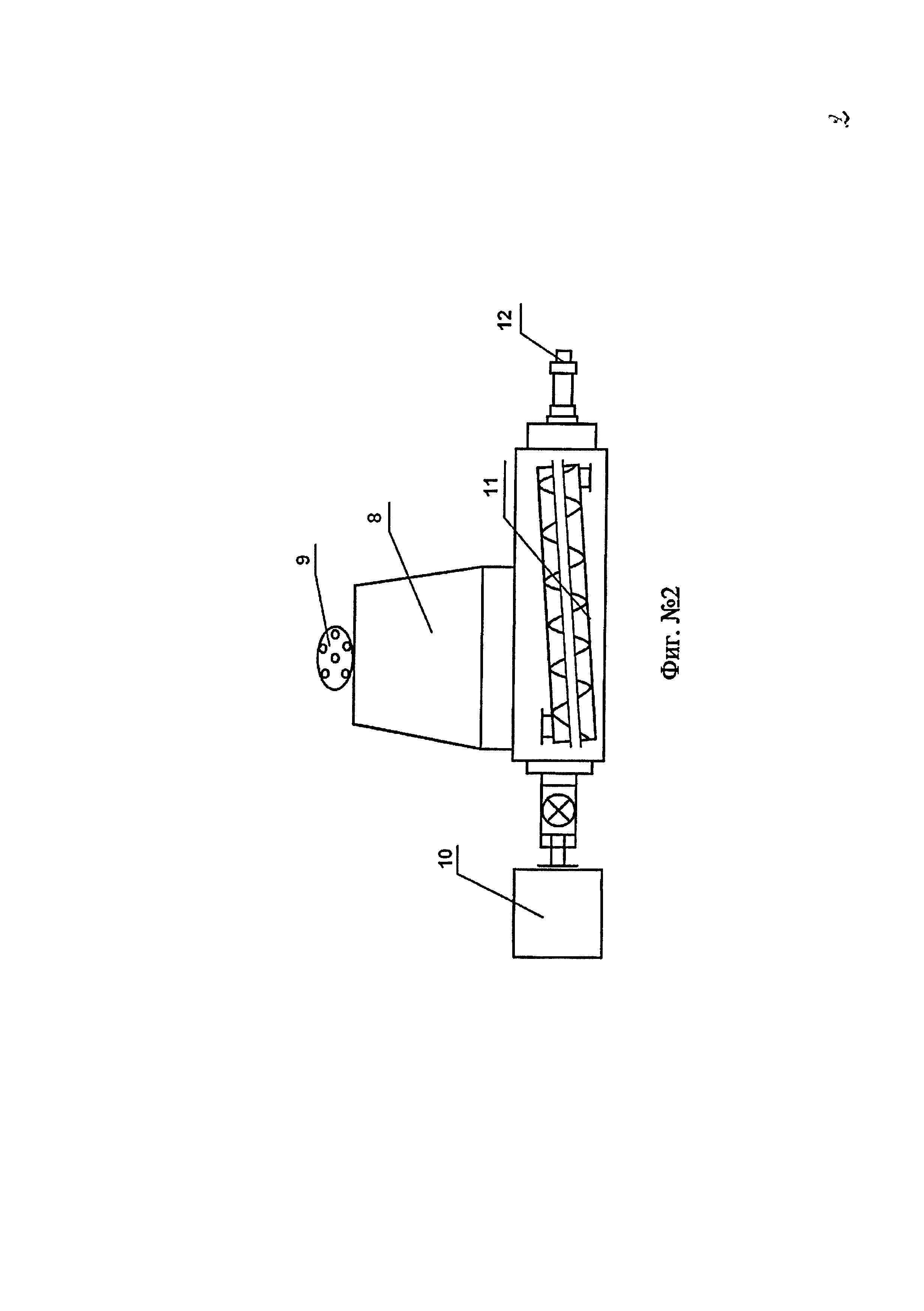 Предлагаемое изобретение относится к области изготовления зарядов из смесевого ракетного твердого топлива (СРТТ) по технологии с применением вертикальных смесителей планетарного типа (ВСПТ) со съемными мешалками. Согласно изобретению топливная масса, приготовленная в вертикальном смесителе планетарного типа (ВСПТ) со съемными мешалками, выдавливается из передвижной чаши ВСПТ через вакуумный нагнетательный аппарат (ВНА) шнекового типа с имеющейся на входе последнего камерой для вакуумирования с фильерой, разделяющей поток массы на струи, откуда масса нагнетается в пресс-форму. Анализ патентной литературы показывает, что в производстве зарядов из СРТТ широкое распространение получили способы и оборудование, включающие применение ВСПТ со съемными передвижными чашами. Формование зарядов из передвижных съемных чаш осуществляется выдавливанием топливной массы в вертикально расположенную пресс-форму сверху в корпус двигателя или снизу. В обоих случаях не исключается вероятность образования воздушных дефектов. В патенте РФ №2167135 приоритет от 04.08.1999 г., взятом авторами за прототип, описан способ заполнения из ВСПТ пресс-форм топливной массой снизу. Качество зарядов по монолитности обеспечивалось за счет ступенчатого извлечения мешалок и удаления воздуха из-под поршня гидравлической системы вытеснения через систему каналов. В процессе реализации данного способа изготовления зарядов выявился ряд недостатков: - в процессе извлечения мешалок не исключается капсуляция воздуха даже при ступенчатом опускании съемной чаши; - в процессе смешения топливной массы в ВСПТ может происходить подсос и последующая капсуляция воздуха через негерметичности в узлах смесителя, например сливного затвора. Закапсулированный воздух затем в процессе формования попадет в пресс-форму, что приводит к образованию воздушных дефектов в изделиях. Технической задачей изобретения является разработка способа, при котором для исключения попадания воздушных включений в пресс-форму при подаче топливной массы из передвижной чаши ВСПТ предлагается пропускать массу, выдавливаемую из чаши ВСПТ, через вакуумный нагнетательный аппарат (ВНА) шнекового типа с имеющейся на входе последнего камерой для вакуумирования, откуда масса нагнетается в пресс-форму. На фиг. 1 изображена технологическая схема с использованием ВНА, включающая в себя дозирование компонентов в смеситель ВСПТ 1 из устройств 2 и 3, смешение топливной массы, отсоединение передвижной съемной чаши 4, подсоединение ее к поршневой гидравлической системе вытеснения 5, выгрузку топливной массы через ВНА шнекового типа 6 в пресс-форму 7 снизу или сверху. Технологическая задача решается тем, что позволяет исключить попадание воздушных дефектов из чаши ВСПТ в пресс-форму и обеспечить требуемое давление для формования зарядов с малым проходным входным сечением пресс-формы. Конструкция ВНА позволяет осуществлять вакуумирование топливной массы в вакуумной камере объемом 50-100 л и создавать необходимый напор (2-10 МПа) в шнековом аппарате. Конструкция ВНА показана на фиг 2. ВНА содержит вакуумную камеру 8 с фильерой 9, разделяющей поток массы на струи, редуктор 10, шнек 11 и формующую головку 12. Отличием данного изобретения от прототипа является использование на входе в вакуумный нагнетательный аппа