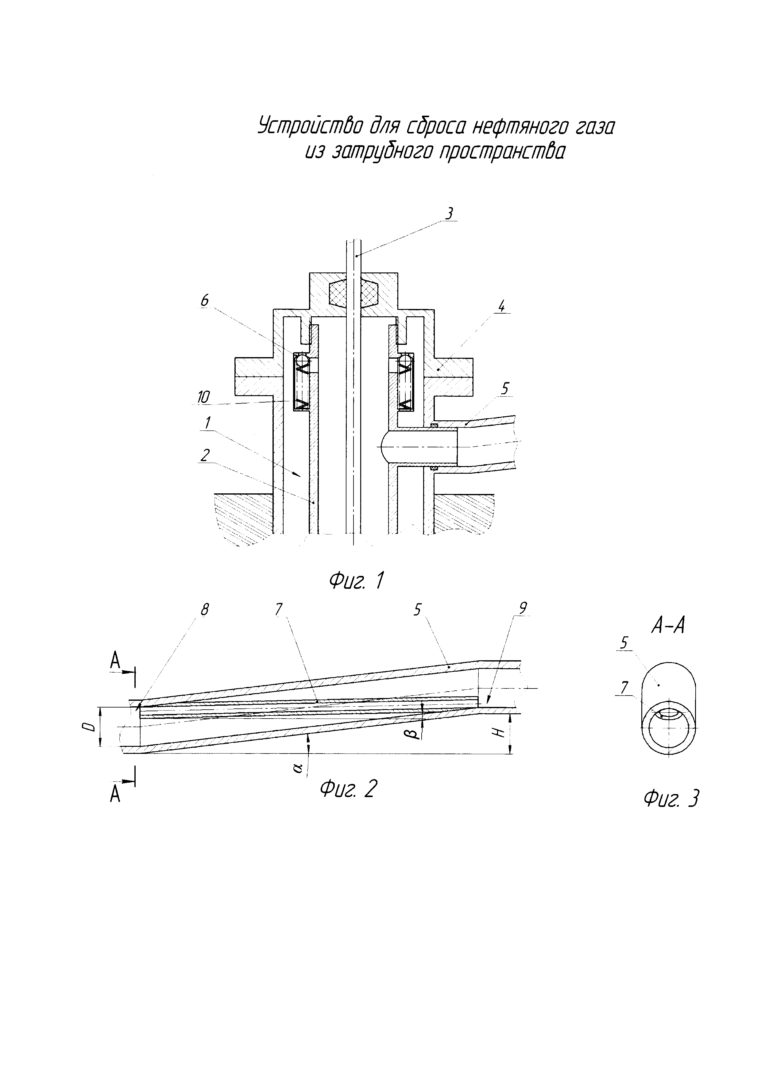 1. Устройство для сброса нефтяного газа из затрубного пространства, содержащее лифтовую колонну, насосную установку, устьевую запорную арматуру, отводящий продукцию патрубок, сообщенный с лифтовой колонной, и обратный клапан, отличающееся тем, что обратный клапан с регулируемым открыванием для обеспечения необходимого уровня жидкости в затрубном пространстве сообщен с лифтовой колонной выше соединения лифтовой колонны с отводящим патрубком, который за пределами устьевой арматуры изготовлен восходящим от устьевой запорной арматуры на высоту не менее внутреннего диаметра отводящего патрубка, причем сброс нефтяного газа предусмотрен через лифтовую колонну с использованием соответствующего хода плунжера штангового насоса или остановки и последующего запуска электропогружного насоса. 2. Устройство для сброса нефтяного газа из затрубного пространства по п. 1, отличающееся тем, что отводящий патрубок изнутри снабжен газоотводной трубкой, восходящей от устьевой запорной арматуры с меньшим углом, чем отводящий патрубок, и соединяющей верхнюю зону отводящего патрубка около устьевой запорной арматуры с нижней зоной отводящего патрубка после подъема.