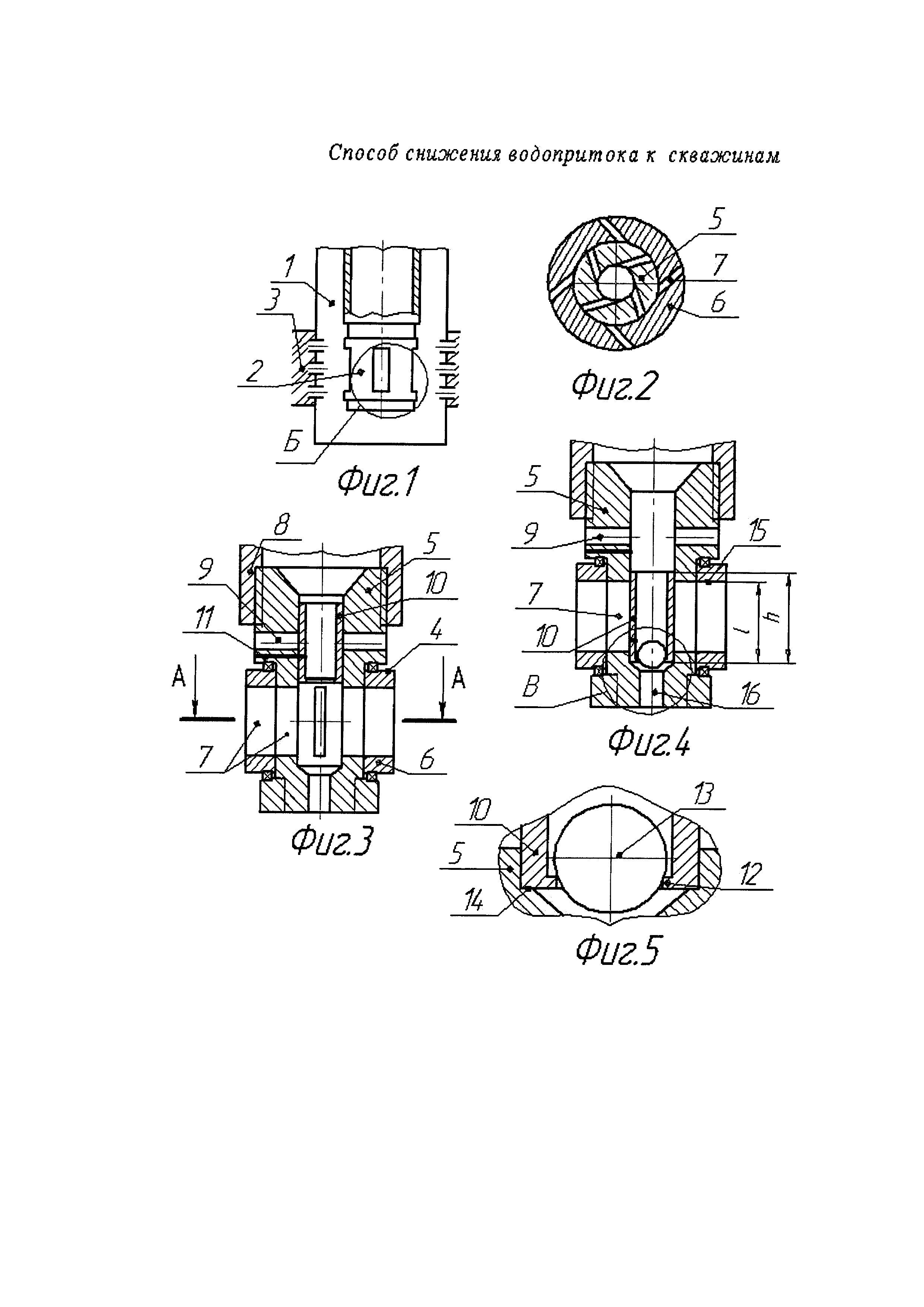 Способ снижения водопритока к скважинам, включающий выбор добывающей скважины, закачку малосольной воды в течение не менее пяти суток в нагнетательную скважину, перевод этой скважины на закачку сточной или пластовой воды с расходом до проведения мероприятия, циклы закачки малосольной воды в нагнетательную скважину повторяют при росте обводненности добывающей скважины на 10-30% относительно обводненности после проведения предыдущего цикла закачки, при этом объем закачки малосольной воды в каждом последующем цикле увеличивают, отличающийся тем, что выбирают несколько добывающих скважин, расположенных на расстояниях не более 500 м от нагнетательной скважины, закачку малосольной воды в нагнетательную скважину осуществляют в импульсном режиме и при работающих выбранных скважинах, после чего отключают устройство для импульсной закачки жидкости в пласт 3 и нагнетательную скважину переводят на закачку сточной или пластовой воды, циклы закачки малосольной воды в нагнетательную скважину повторяют при отключенном устройстве для импульсной закачки жидкости и при росте обводненности, хотя бы в одной добывающей скважине, на 10-30% относительно обводненности после проведения предыдущего цикла закачки, причем в качестве устройства для импульсной закачки жидкости в пласт применяют гидравлический вибратор золотникового типа, содержащий полый ствол и золотник с щелевыми прорезями, причем для отключения гидравлического вибратора в его стволе над золотником просверлены радиальные отверстия, сообщающие между собой полости ствола и скважины, а в полость ствола напротив радиальных отверстий и над щелевыми прорезями, с фиксацией от осевого перемещения, установлен полый шток, выполненный с кольцевым выступом на нижнем конце внутренней стенки и с возможностью перекрытия щелевых прорезей ствола при перемещении его вниз под радиальные отверстия ствола, причем полый шток перемещают по полости ствола вниз давлением сточной или пластовой воды, закачиваемой в пласт после сброса в скважину шарика, наружный диаметр которого выбран меньше внутреннего диаметра полого штока и больше внутреннего диаметра кольцевого выступа этого штока.