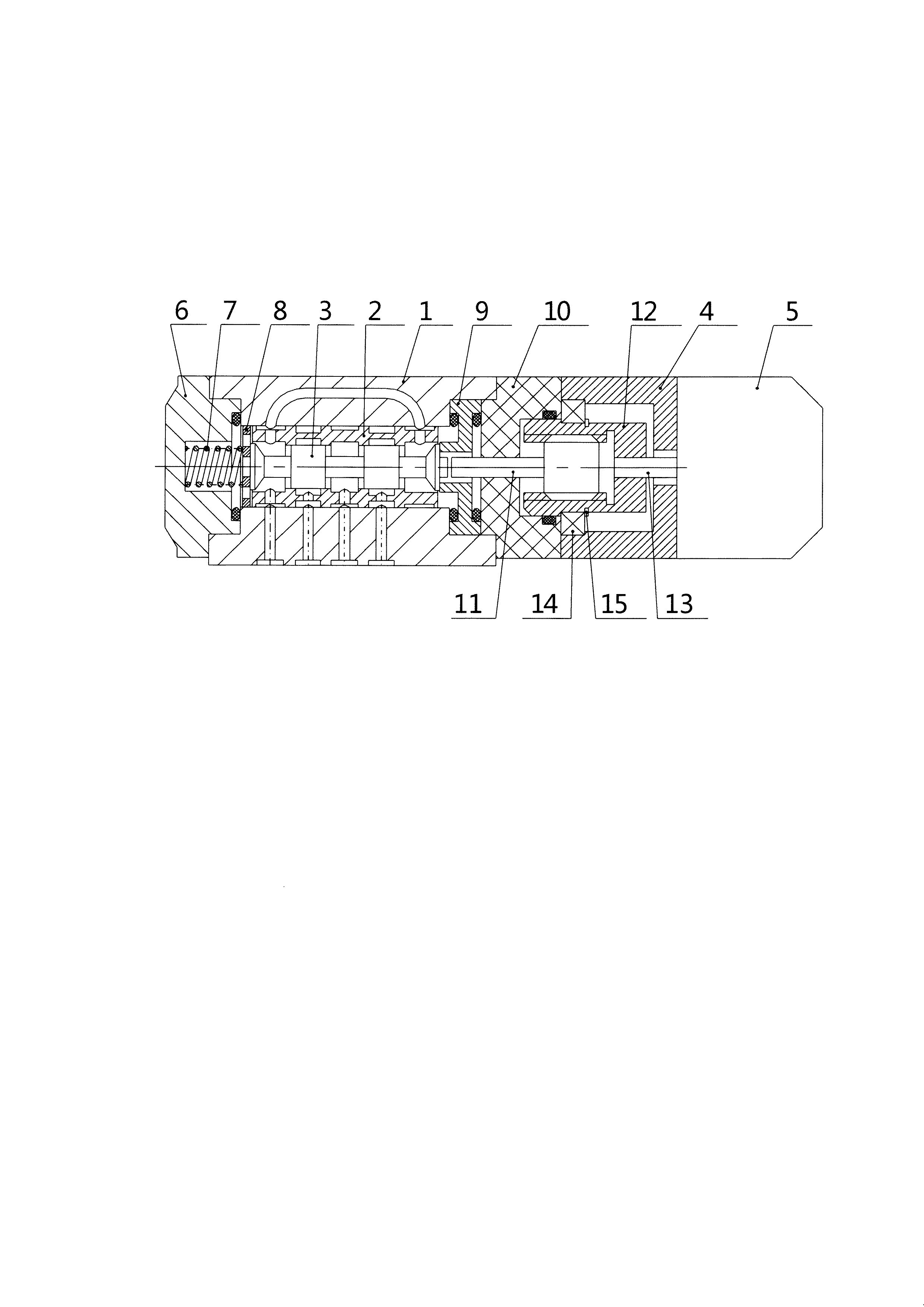 Изобретение относится к области машиностроительной гидравлики, в частности к управляющим гидравлическим аппаратам с пропорциональным управлением, и может быть использовано в различных электрогидравлических приводах стационарных систем и мобильных машин. Аналогом является цифровой управляющий гидрораспределитель с корпусом, золотниками, задающим шаговым электродвигателем, винтовой парой, узлом контроля положения золотника, выпускавшиеся по ТУ 2.024.6170-89 Шилутским заводом «Гидропривод», - см. Свешников В.К. Станочные гидроприводы: справочник. 5-е изд., перераб. и доп. М.: Машиностроение, 2008. Недостатком аналога является сложность конструкции и низкая надежность. Наиболее близким по технической сущности является цифровой управляющий гидрораспределитель (см. Патент RU 2505716 C1., МПК F15B 13/044, опуб. 27.01.2014), содержащий корпус, гильзу, золотник, переднюю и заднюю боковые крышки, цифровой шаговый электродвигатель, предварительно сжатую пружину с двумя шайбами, тянущим винтом и стопорным кольцом. Шаговый электродвигатель расположен в передней боковой крышке перпендикулярно к оси золотника и имеет на своем валу манжету и эксцентрик, который через подшипник взаимодействует с торцовыми поверхностями кольцевой канавки, выполненной на золотнике, а угол поворота эксцентрика ограничен фиксатором и не превышает 90 градусов. Входной импульсный электрический сигнал, поступающий на цифровой шаговый электродвигатель, вызывает поворот его вала на угол, определяемый числом поданных импульсов. Вместе с валом поворачивается эксцентрик, и через шарикоподшипник перемещает в осевом направлении золотник, сжимая пружину. Направление смещения определяется направлением поворота вала шагового электродвигателя. При смещении влево пружина сжимается одной шайбой, а при смещении вправо - второй шайбой, причем люфт между золотником и пружиной устраняется за счет соответствующей регулировки тянущего винта, а самопроизвольный поворот винта исключается за счет сил трения в фрикционном кольце. В аварийной ситуации отключается шаговый электродвигатель, развиваемый им крутящий момент падает, и пружина устанавливает золотник в нейтральную (безопасную) позицию. Этот возврат возможен лишь при ограниченном угле поворота шагового электродвигателя (±45°). Недостатками такого решения являются: ограничение угла поворота эксцентрика и соединенного с ним вала шагового электродвигателя значением менее 90 градусов, что приводит к снижению быстродействия системы или росту потребляемой шаговым электродвигателем мощности; применение дополнительного устройства контроля перемещения золотника, которое снижает надежность конструкции. Техническая задача направлена на улучшение динамических показателей распределителя. Технический результат заключается в упрощении конструкции и увеличении ресурса гидрораспределителя. Это достигается тем, что известный цифровой управляющий гидрораспределитель содержащий корпус с передней и задней крышками, гильзу установленную внутри корпуса и соосно размещенным в ней золотником, на передней боковой крышке установлен цифровой шаговый электродвигатель, пружину, стопорное кольцо, подшипник и шайбу, снабжен упором, изолирующей вставкой с отверстием, винтом толкателем, гайкой, при этом к задней боковой крышке прижат один ко