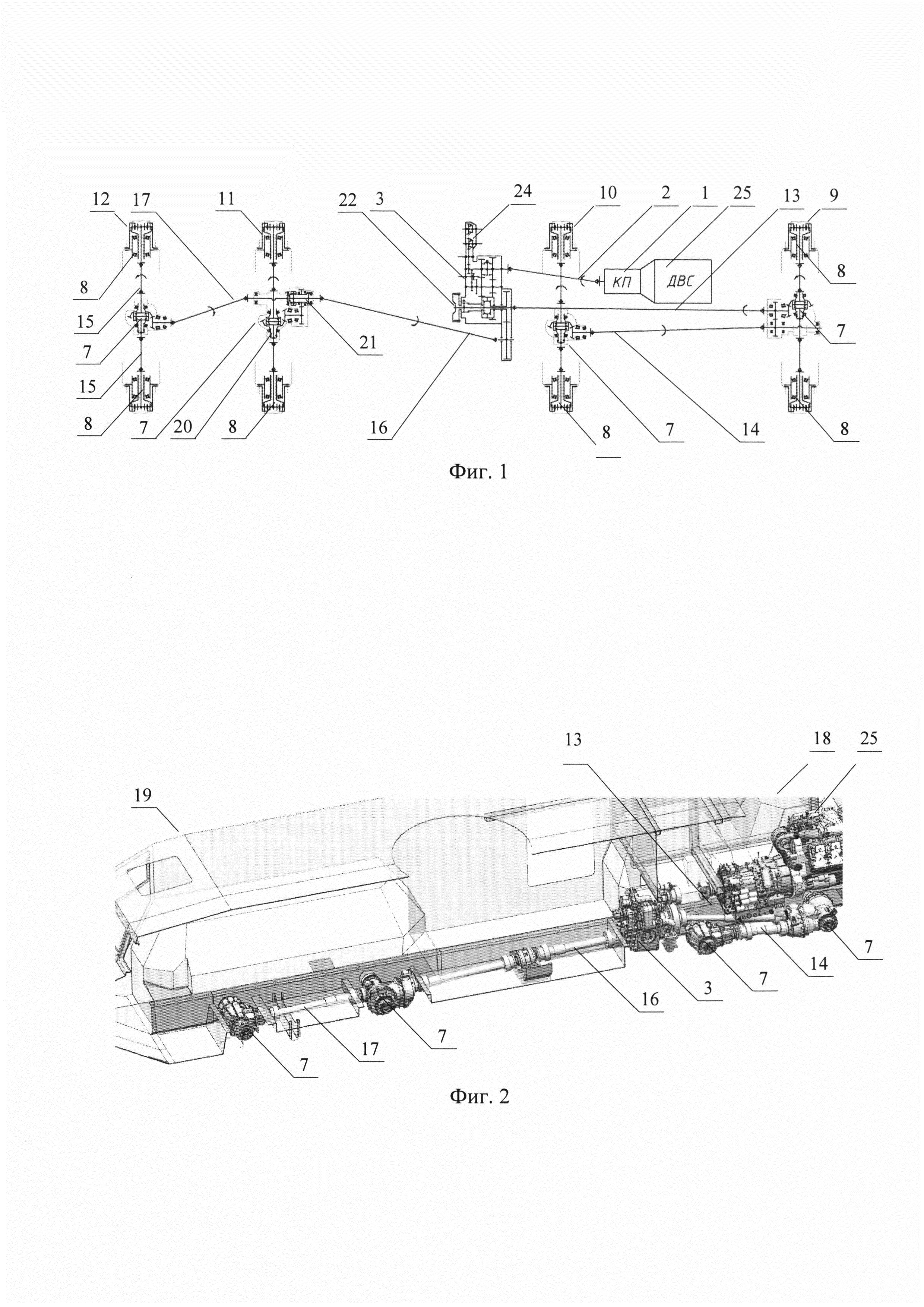 Область техники, к которой относится изобретение Изобретение относится к транспортным средствам и может быть использовано в трансмиссиях многоосных полноприводных колесных транспортных средств. Уровень техники Из уровня техники известна трансмиссия полноприводного колесного транспортного средства по патенту РФ на изобретение №2333113 (МПК В60K 17/04, В60K 17/28, B62D 63/02; опубл. 10.09.2008, заявка №2005133264 от 31.10.2005). Она содержит основную раздаточную коробку, выходные валы которой карданными передачами связаны с дифференциалами переднего и заднего ведущих мостов, каждый из которых имеет картер. При этом колесные валы от дифференциалов пропущены через отверстия в вертикальных стенках лонжеронов и через конечные передачи связаны с колесами. Она выполнена с третьим ведущим мостом, расположенным между передним и задним ведущими мостами, и дополнительной раздаточной коробкой, выходные валы которой связаны карданными передачами с дифференциалами третьего и заднего ведущих мостов для привода колес, а входной вал - с выходным валом основной раздаточной коробки привода дифференциала переднего ведущего моста. Картер каждого ведущего моста прикреплен к нижней поверхности отдельной поперечины прямоугольной формы рамы. Основная раздаточная коробка расположена между передним и третьим ведущими мостами и прикреплена к лонжеронам в зоне средней поперечины ниже верхней поверхности лонжеронов. Дополнительная раздаточная коробка размещена между третьим и задним ведущим мостами и прикреплена к нижней поверхности дополнительной поперечины, соединенной с лонжеронами и продольная ось которой расположена под углом к лонжеронам, отличным от прямого. При этом оси входного и выходных валов дополнительной раздаточной коробки расположены под углом к осям входного и выходных валов основной раздаточной коробки. Все мосты выполнены одинаковыми по конструкции и габаритам. Дифференциалы переднего и третьего мостов смещены к одному лонжерону, а дифференциал заднего моста смещен к другому лонжерону. Известное изобретение позволяет улучшить эксплуатационные характеристики за счет использования стандартного оборудования, возможностей по компоновочному построению серии машин различного назначения за счет расположения всех кинематических узлов ниже верхней поверхности лонжеронов рамы, снизить массу рамы за счет использования поперечин в качестве опор для кинематических узлов и обеспечить долговечность привода за счет рационального расположения карданных передач в диапазоне оптимальных расчетных угловых смещений. Но известная трансмиссии полноприводного колесного транспортного не содержит конструкционных элементов, обеспечивающих уменьшение габаритов указанной трансмиссии, и поэтому в полной мере не расширяет эксплуатационные возможности транспортного средства. Известно другое техническое решение «Трансмиссия трехосного транспортного средства» по патенту РФ на полезную модель №9419 (МПК В60K 17/34; опубл. 16.03.1999, заявка №98112939 от 08.07.1998). Трансмиссия трехосного транспортного средства ближайшего аналога содержит коробку передач, раздаточную коробку, состоящую из корпуса и расположенных в нем валов и зубчатых колес, карданные передачи и ведущие мосты привода колес. Ведущее зубчатое колесо раздаточной коробки имеет зацепление с первым з