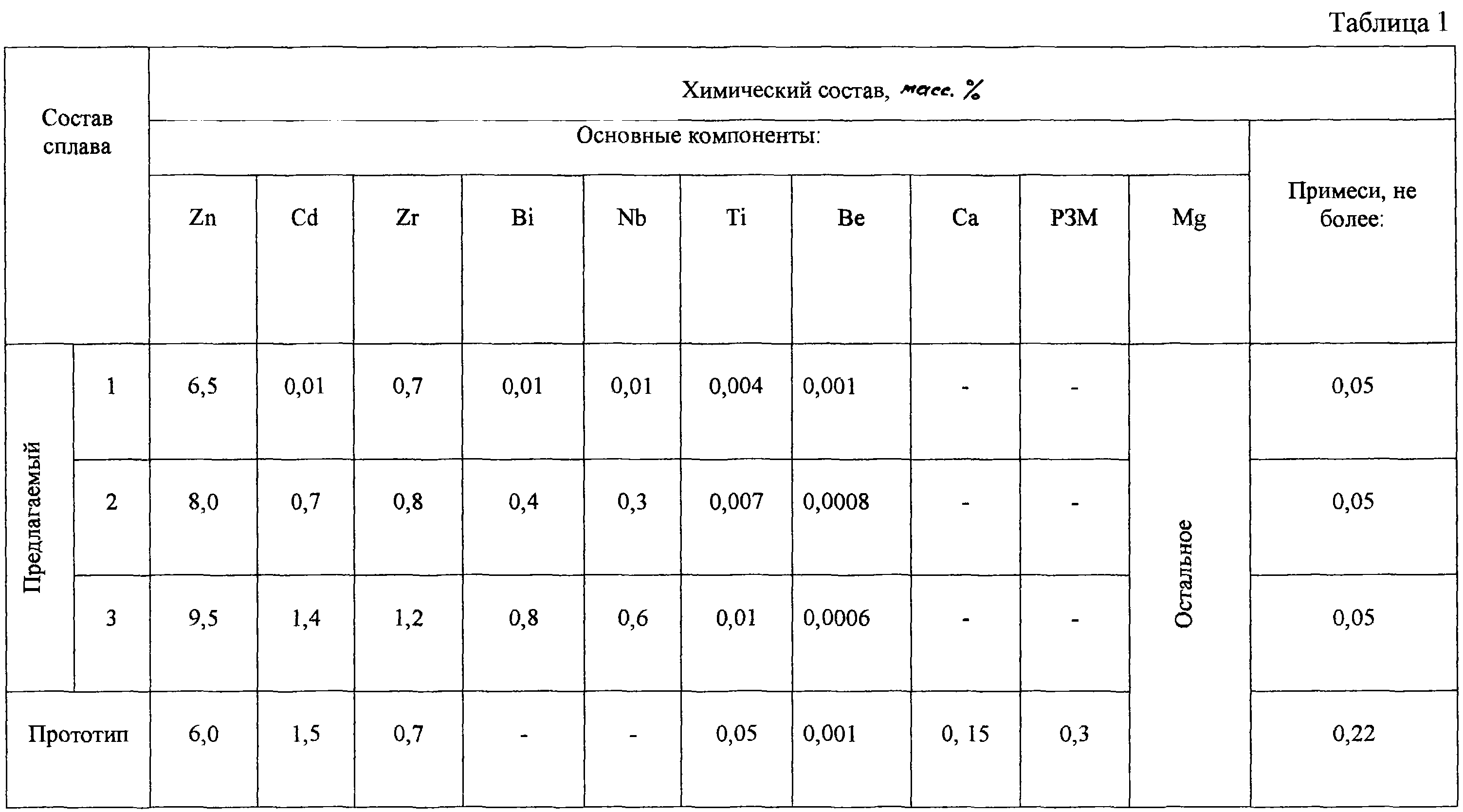 близким аналогом, взятым за прототип, является литейный сплав на основе магния следующего химического состава, мас.%: Zn 5-7 Zr 0,6-1,1 Cd 0,1-3 Be ≤0,05 Mg Остальное Сплав может дополнительно содержать, мас.%: Ti ≤0,1 Са ≤0,3 РЗМ