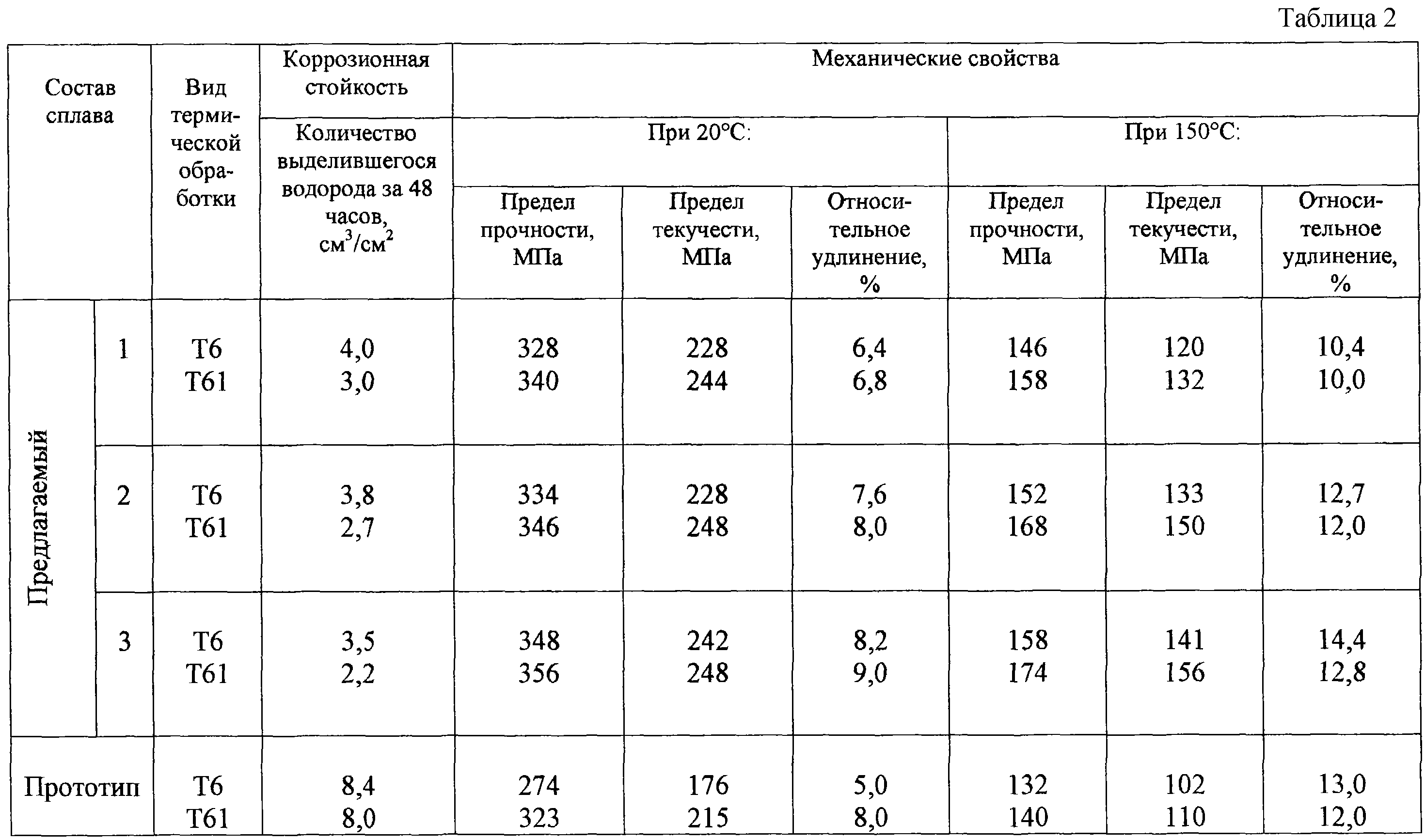 сплава и сплава-прототипа приводятся в таблице №2. Анализ данных таблиц №1 и №2 показывает, что предлагаемый сплав превосходит сплав-прототип по следующим характеристикам: При температуре 20°С: по пределу прочности на 10-20%, по пределу текучести на 15-25%. При температуре 150°С: по пределу прочности на 11-20%, по пределу текучести на
