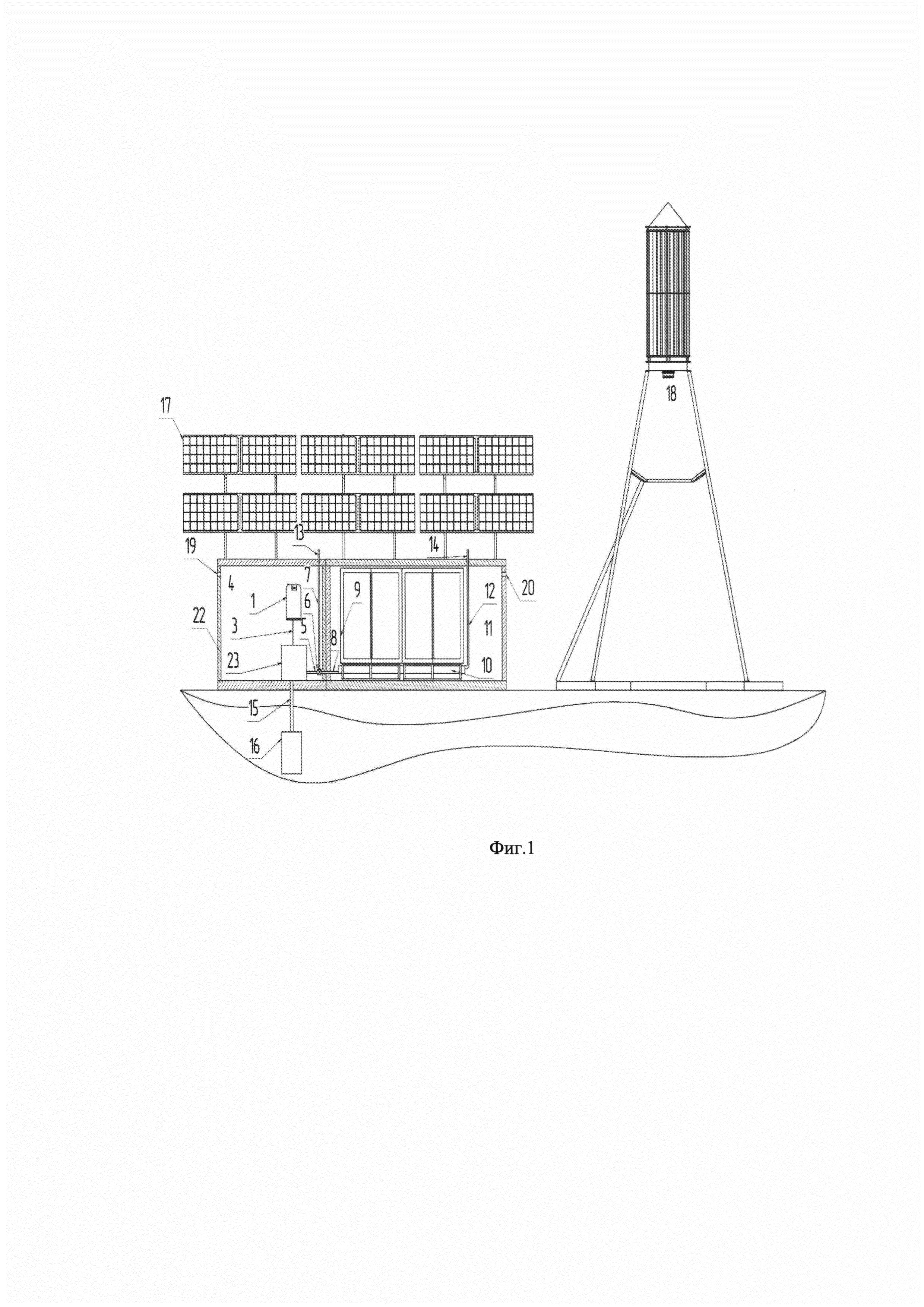 Область техники Изобретение относится к малой энергетике, а именно к области автономных систем энергоснабжения предназначенных для объектов, удаленных от центрального энергоснабжения. Средствами генерации и накопления энергии в данной установке являются: - Солнечные батареи; - Ветрогенератор; - Топливные генераторы; - Аккумуляторные батареи; - Емкости для хранения топлива для топливного элемента. Уровень техники Из существующего уровня техники известна гибридная автономная контейнерная электростанция (РФ Патент №162099) которая содержит солнечные панели, ветрогенераторы, аккумуляторные батареи, контроллер системы управления и распределительный щит управления, станция выполнена с обеспечением мобильности и дополнительно снабжена дизель-генераторной установкой со шкафом управления ДГУ и топливным баком. Недостатком данной модели является наличие дизель-генератора, что значительно снижает автономность энергетической установки, так как работа дизель-генератора связана с частыми техническими обслуживаниями. Известен мобильный генератор электроэнергии (США Патент №US8854794), содержащий телескопическую стрелу, выдвижную опорную ногу и основание. Телескопическая стрела содержит два конца. Ветряная турбина прикреплена ко второму концу телескопической стрелы. Первый конец телескопической стрелы и первая выдвижная опорная стойка прикреплены к основанию. Электрический генератор имеет подвижную панель солнечных батарей, которая может храниться в основании и размещаться в рабочем месте. Две двери, каждая из которых оснащена солнечными панелями. Мобильный генератор электроэнергии может дополнительно содержать аккумуляторную батарею в электрической связи с солнечными батареями для хранения электроэнергии. Недостатком данной модели является то, что при эксплуатации в экстремально низких температурах, не будет обеспечен температурный режим необходимый для работы аккумуляторных батарей, так же недостатком служит отсутствие резервного источника энергии, который бы обеспечил энергоснабжение в случае дефицита энергии идущей от возобновляемых источников. Известна автономная энергетическая установка (РФ патент №162244), содержащая первичный источник энергии в виде солнечных батарей или ветрогенератора, вторичный источник энергии в виде топливного генератора на топливных элементах, который размещен на теплопроводящей подложке, в которую встроен нагревательный элемент, топливные картриджи, аккумуляторную батарею, блок управления установкой, термодатчик помещенные в термоизолированный корпус при этом патрубок отвода газа (пара) топливного генератора снабжен нагревательным элементом, размещенным вблизи наружного края патрубка. В данном техническом решении топливный генератор охлаждается воздухом посредством вентилятора, при этом тепло, снимаемое с теплообменника генератора выводится в полость термоизолированного корпуса. Недостатком данной системы является то, что нагрев патрубка выпускной трубки выводящей конденсат из топливного элемента производится за счет электрической энергии с использованием резисторов большой мощности. Отказ данного устройства с возможным коротким замыканием в сочетании с глубоким разрядом аккумуляторных батарей, а так же низкой температурой окружающей среды может привести