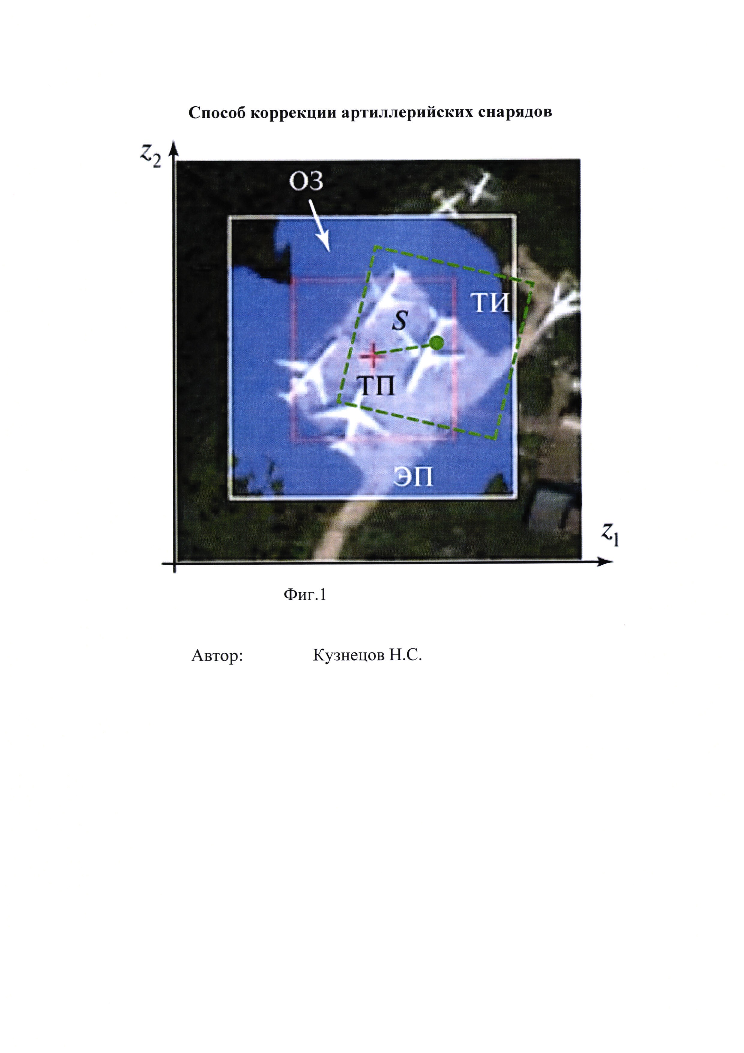 Изобретение относится к артиллерийским боеприпасам и может быть использовано для коррекции управляемых артиллерийских снарядов. Известны способы коррекции артиллерийских снарядов, заключающиеся в том, что поражаемый объект облучают от источника лазерного излучения и по зоне максимальной интенсивности отраженного излучения корректируют траекторию снаряда. Выполняют так называемую «подсветку» объекта. При этом отраженное излучение принимают с помощью оптики. Такие снаряды известны под шифром «Сантиметр» и «Краснополь» (Каллистов А.А. Научно-исследовательский машиностроительный институт (НИМИ): Страницы истории, события, люди (1932-2002). - М.: ЦЭИ «Химмаш», 2002. - 236 с.: ил.). Недостатком этих технических решений является сложность безопасного поиска и облучения цели на территории, занятой противником. Известен способ коррекции снаряда, заключающийся в том, что перед выстрелом в память снаряда вводятся электронные координаты объекта. В процессе полета снаряд через глобальную систему навигации, например GPS, получает информацию о траектории его движения, и, за счет тормозных устройств во взрывателе, осуществляет коррекцию полета снаряда (Кузнецов Н.С. Некоторые перспективные направления работ в ОАО «НЛП «Дельта» // Научно-технический сборник ГНЦ РФ ФГУП «ЦНИИХМ им. Д.И. Менделеева» Боеприпасы - 2014, №2, с. 9-11). Недостатком такого способа коррекции является то, что под воздействием радиоэлектронных помех система GPS не работает. С целью обеспечения качественного повышения эффективности применения ствольной артиллерии при стрельбе с закрытых позиций штатными управляемыми боеприпасами из штатных орудий предлагается перед нанесением удара проводить разведку расположения целей противника на местности снарядами-разведчиками, имеющими баллистические характеристики, идентичные боевым снарядам, и на основе этих данных проводить коррекцию параметров стрельбы при нанесении огневого удара без использования системы «подсветки». Коррекция траектории полета управляемого снаряда осуществляется за счет введения изображения местности с «целью-объектом» в память снаряда в виде полетного задания, и наведения этого снаряда на цель на основе сопоставления данных фактической регистрации изображения местности в зоне цели самим снарядом с изображением полетного задания. Для получения достоверных данных о зоне попадания снарядов при стрельбе по заданным целям снаряд-разведчик имеет баллистические характеристики, идентичные боевым снарядам. На высоте примерно 1000 м от уровня местности модули снаряда-разведчика с помощью дистанционного взрывателя и вышибного заряда выбрасываются из корпуса снаряда и опускаются на зону планируемого поражения боевыми снарядами при заданных параметрах стрельбы. Измерительный модуль выполняет несколько фотографий местности и передает полученные изображения в цифровом виде на модуль-ретранслятор, который, в свою очередь, по специальной радиолинии передает информацию на удаленную станцию приема. В измерительном модуле используется оптика с регистратором на ПЗС-матрице. Она обеспечивает разрешение на местности на хуже 0,3 м при высоте съемки с модуля 500 м. На основании полученных фотоизображений выбирается зона объекта поражения и принимается решение о корректировке огня артиллерийским подразделе