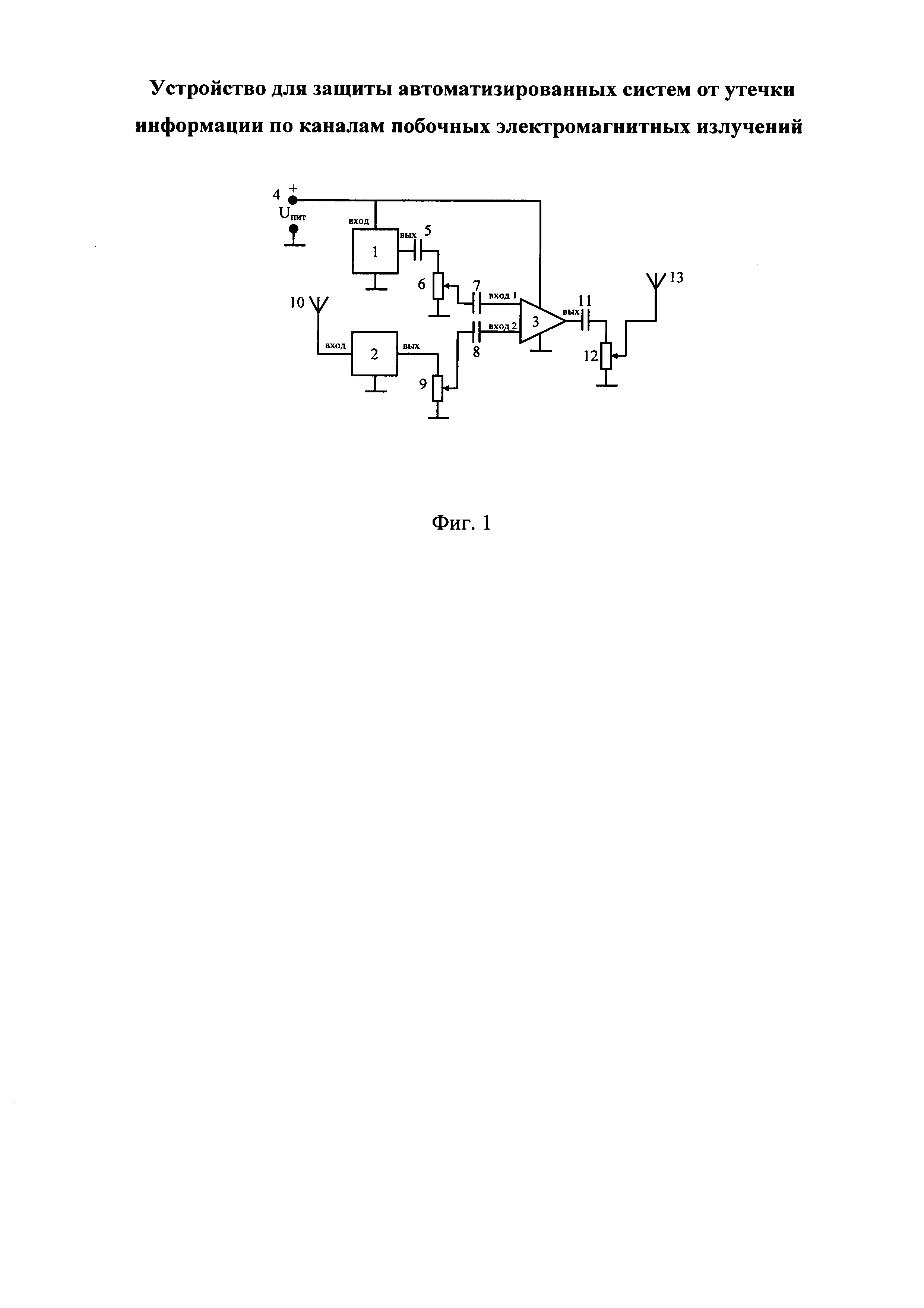 Устройство для защиты автоматизированных систем от утечки информации по каналам побочных электромагнитных излучений, содержащее генератор шумового сигнала, усилитель, отличающееся тем, что дополнительно содержит блок детектирования тактовой частоты автоматизированной системы, к входу которого подключена узконаправленная антенна, а его выход через первый разделительный конденсатор и резистор с переменным сопротивлением подключен ко второму входу усилителя мощности, к первому входу которого через второй разделительный конденсатор и резистор с переменным сопротивлением подключен генератор шумового сигнала, а выход усилителя через третий разделительный конденсатор и резистор с переменным сопротивлением соединен с широконапраленной антенной, при этом усилитель находится в нелинейном режиме усиления.