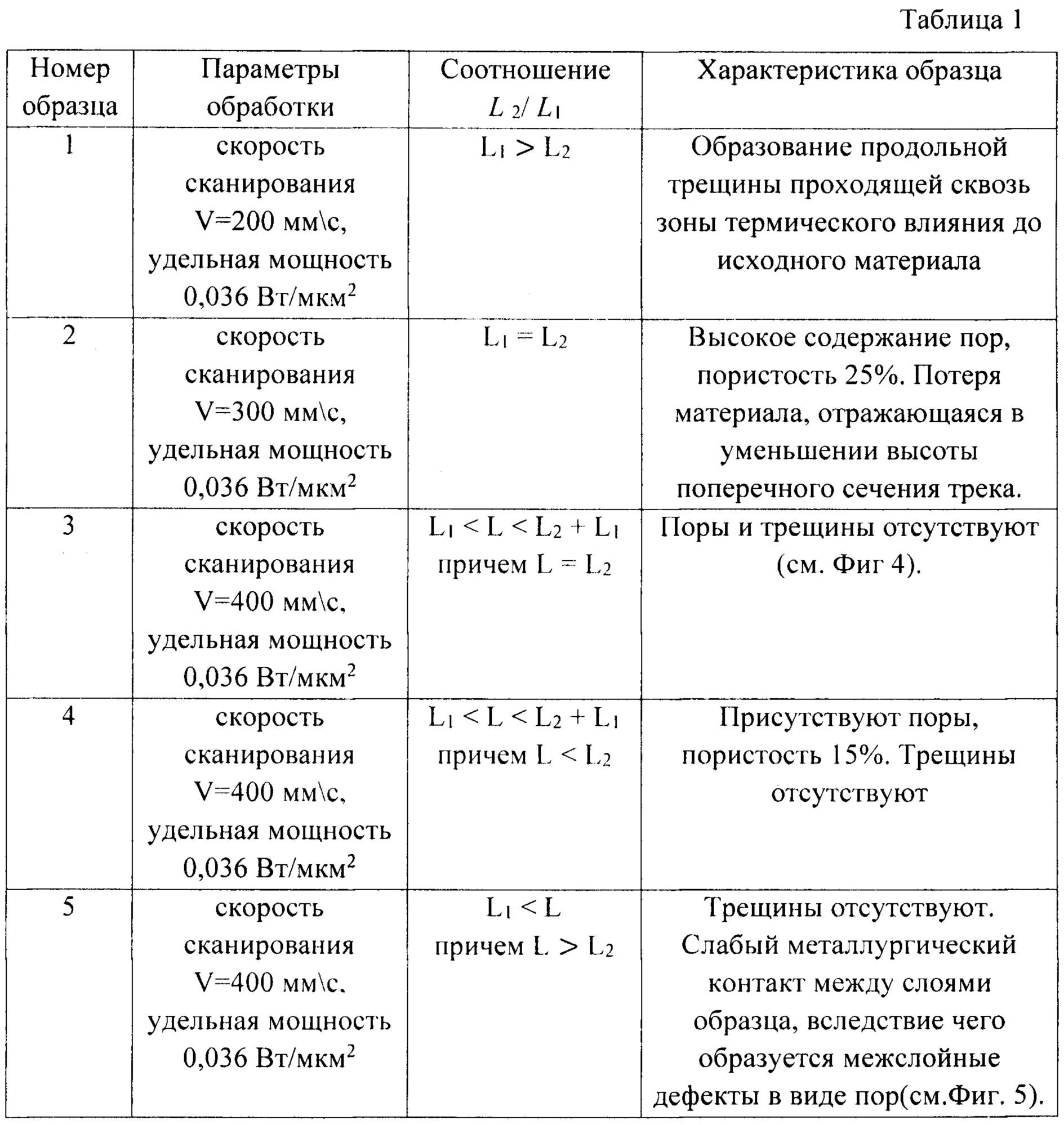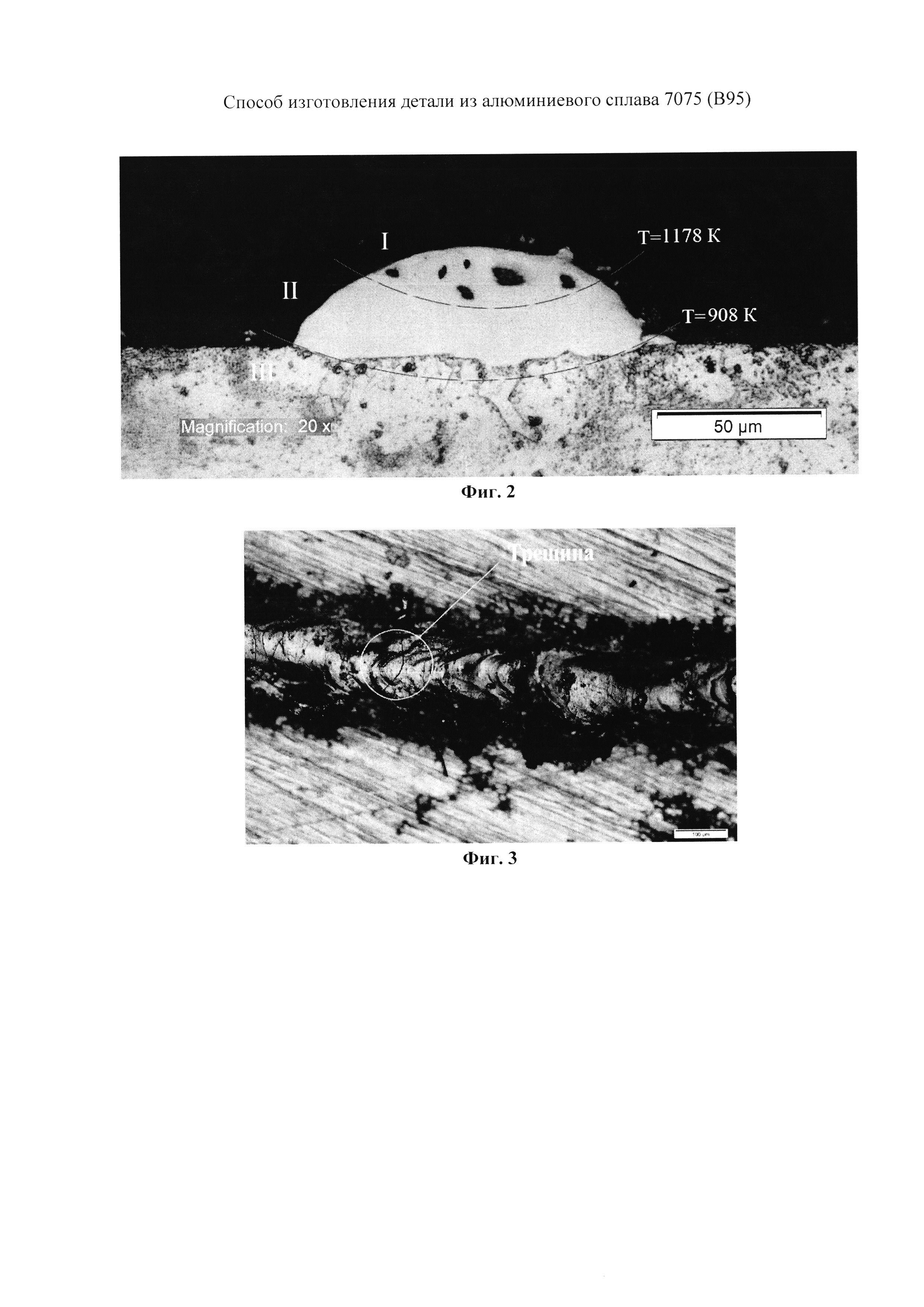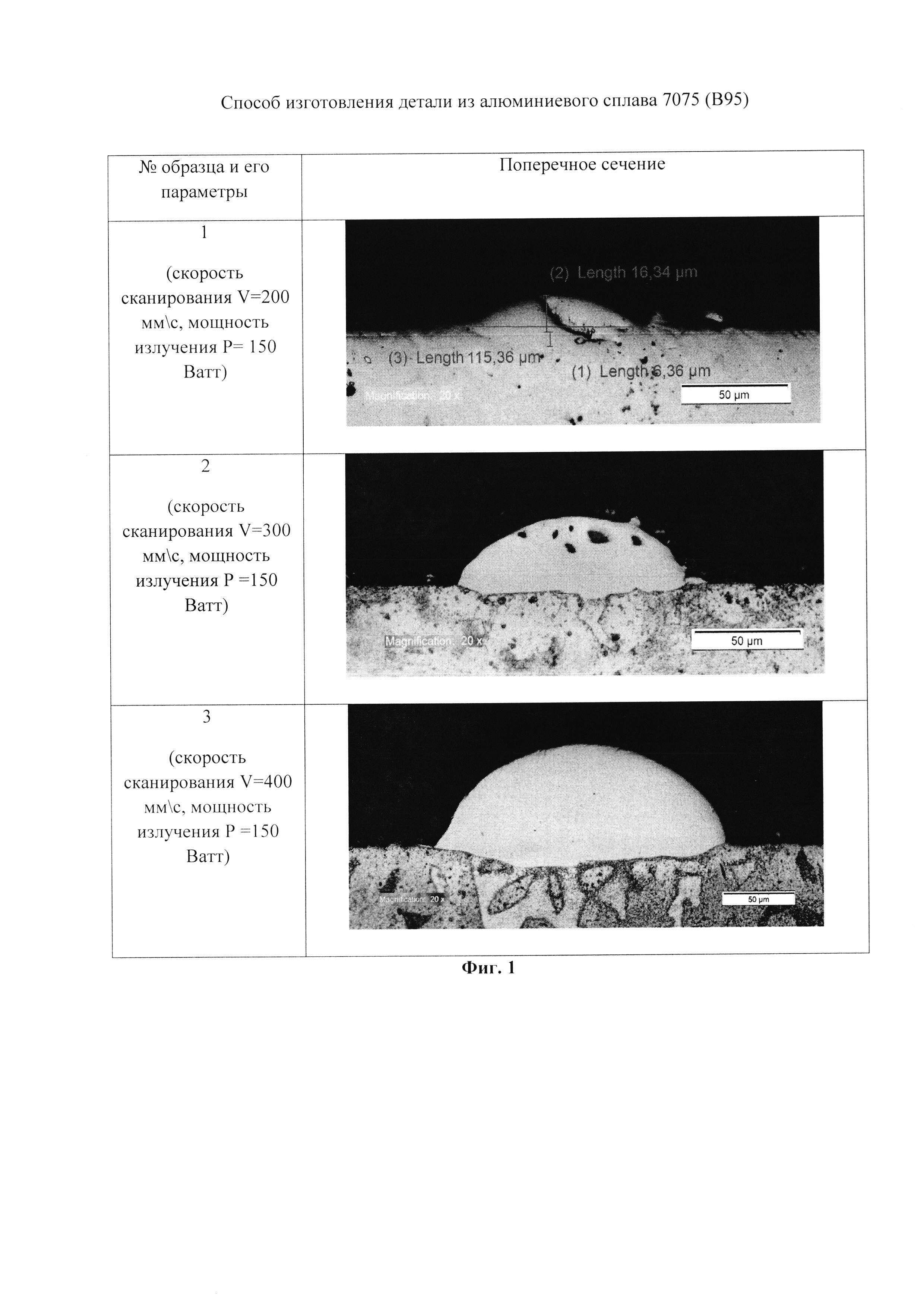 1. Способ послойного изготовления детали из порошка алюминиевого сплава 7075 или В95, включающий формирование порошка для селективного лазерного плавления из алюминиевого сплава 7075 или В95 и формообразование детали послойным селективным лазерным плавлением порошка на заданных режимах, отличающийся тем, что предварительно изготавливают экспериментальные фрагменты слоев с различными скоростями сканирования и удельными мощностями лазерного излучения с формированием в каждом фрагменте зоны кипения, зоны плавления и зоны исходного материала, измеряют толщину упомянутых зон, при этом послойное селективное лазерное плавление ведут при скорости сканирования и удельной мощности лазерного излучения, обеспечивающих наибольшее значение отношения толщины зоны плавления к толщине зоны кипения, а толщину наносимого слоя порошка L задают из условия L1<L<L2+L1, где L1 - толщина зоны кипения, L2 - толщина зоны плавления. 2. Способ по п.1, отличающийся тем, что L=L2.