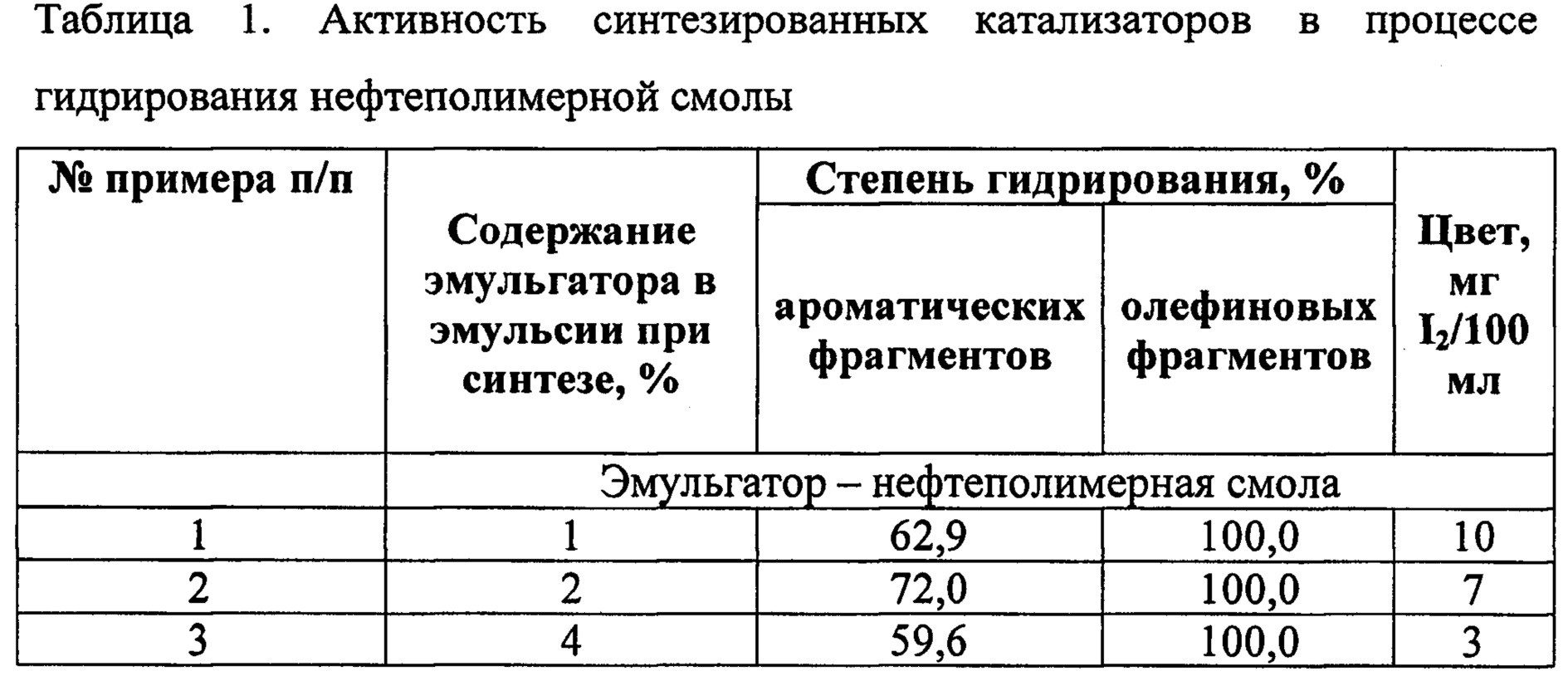 1. Способ получения катализатора гидрирования нефтеполимерных смол, включающий растворение прекурсора катализатора - гексагидрата нитрата никеля и тетрагидрата парамолибдата аммония - в воде, введение в растворитель полученного водного раствора прекурсора катализатора, получение эмульсии и синтез катализатора ex situ при повышенной температуре и давлении водорода из эмульсии в присутствии сульфидирующего агента - элементной серы, отличающийся тем, что в качестве растворителя используют декалин, в который предварительно вводят эмульгатор - нефтеполимерную или инденкумароновую смолу в количестве от 1 до 6% маc. в расчете на декалин, затем вводят водный раствор прекурсора катализатора с мольным отношением Mo/Ni 1/0.25-1/2, взятый в количестве, обеспечивающем содержание воды в эмульсии не более 2% мас., диспергируют, вводят в указанную эмульсию элементную серу до мольного отношения S/Mo в катализаторе 2/1-4/1, проводят синтез катализатора и удаляют декалин с выделением полученного катализатора. 2. Способ гидрирования нефтеполимерной смолы в присутствии полученного ненанесенного нанодисперсного сульфидного катализатора при повышенной температуре и давлении водорода, отличающийся тем, что вначале нефтеполимерную смолу растворяют в циклогексане, или бензоле, или их смеси до ее концентрации в растворе от 20 до 40% мас. и вводят в нее катализатор, полученный способом по п. 1, при его содержании от 1 до 3% мас. в расчете на молибден от нефтеполимерной смолы, причем гидрирование нефтеполимерной смолы ведут не менее трех циклов работы катализатора в отсутствие его регенерации.