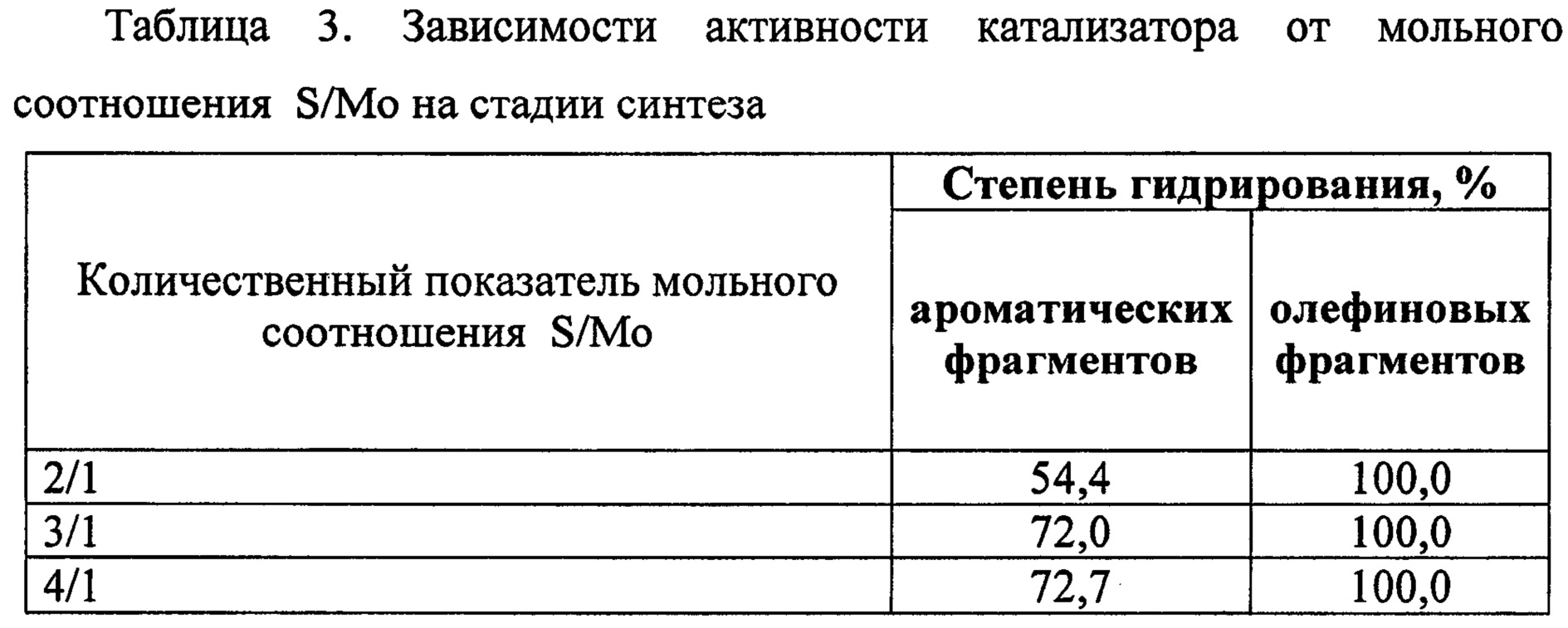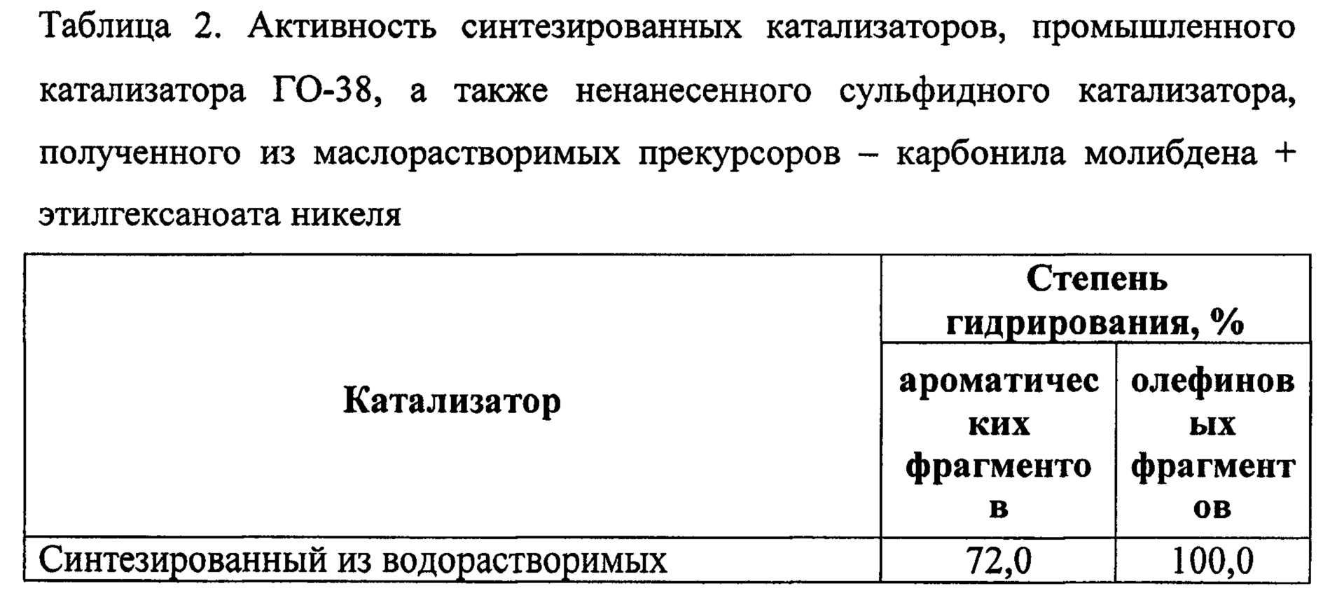 Изобретение относится к процессам получения светлых нефтеполимерных смол гидрированием при повышенной температуре при давлении водорода в присутствии катализатора и может быть использовано для получения компонентов адгезивов и клеев-расплавов, цветных асфальтобетонов, а также в пищевой и полиграфической промышленности. Нефтеполимерные смолы получают из отходов пиролизного производства. Гидрирование позволяет не только улучшить цвет нефтеполимерных смол, но и исключить токсичность и запах, повышает устойчивость к воздействию кислорода воздуха и ультрафиолетового излучения. В результате повышается стабильность всех характеристик НПС и расширяется спектр областей применения. В процессе гидрирования могут использоваться сульфидные [1, 2] и металлические [3, 4] катализаторы, либо процесс может осуществляться в две стадии на сульфидных и платиновых/палладиевых катализаторах [5]. Общий недостаток всех нанесенных катализаторов применительно к процессу гидрирования высокомолекулярных соединений - ограничение диффузии макромолекул в поры, в результате чего в реакции принимают участие только внешние, расположенные на поверхности, активные центры [6]. Кроме того, возможно блокирование пор и дезактивация катализатора по причине затруднения диффузии молекул из пор [7, 8]. Также наблюдается ограничение адсорбции полимерных цепей на поверхности вследствие конформационных ограничений и затруднение диффузии молекул из пор, что может привести к деструкции цепей, закупориванию пор и, как следствие - дезактивации катализатора. В связи с этой проблемой привлекательным является катализ гидрирования нефтеполимерных смол в дисперсной фазе ненанесенными наноразмерными частицами сульфидов металлов, широко известный применительно к процессам гидроконверсии нефтяных остатков. Несмотря на видимые преимущества, данные катализаторы в процессах гидрирования нефтеполимерных смол мало изучены. В публикации [9] рассмотрена возможность гидрирования НПС на сульфидных ненанесенных катализаторах, синтезируемых ex situ из маслорастворимых прекурсоров. Продемонстрирована возможность рециркуляции катализатора. Степень гидрирования ароматических колец достигает 46%. При высокой активности этих катализаторов и ее стабильности при рециркуляции можно отметить их недостаток - высокую стоимость маслорастворимых прекурсоров. Наиболее близкими к предложенному изобретению по технической сущности и достигаемому результату являются способ получения катализатора гидрирования нефтеполимерных смол и способ гидрирования нефтеполимерных смол в его присутствии, описанные в патенте [10], где предложено синтезировать сульфидные никель(кобальт)-молибден-вольфрамовые катализаторы из триметаллических прекурсоров ex situ. Катализатор гидрирования нефтеполимерных смол получают ex situ осаждением из прекурсора, включающего раствор неорганической соли неблагородного металла группы VIII - железа, кобальта, никеля или их смеси, и неорганической соли металла группы VIB - хрома, молибдена, вольфрама или их смеси, в воде, карбоновой кислоте или спирте. Такими соединениями могут быть нитрат никеля и парамолибдата аммония, а также их гекса- и тетрагидраты. К полученным водным растворам могут добавлять спирт, а также углеводородное масло и серу как сульфидирующий аг