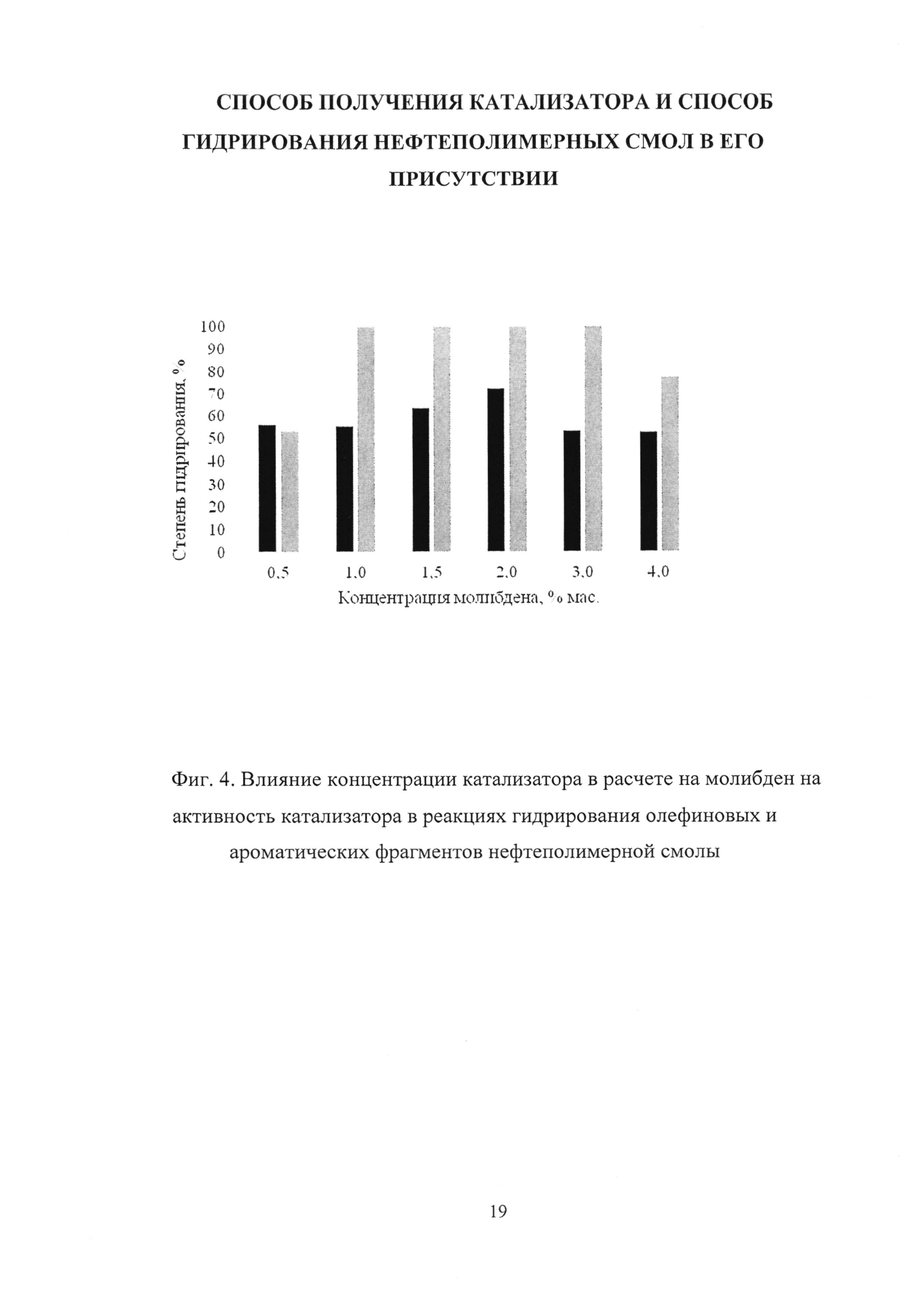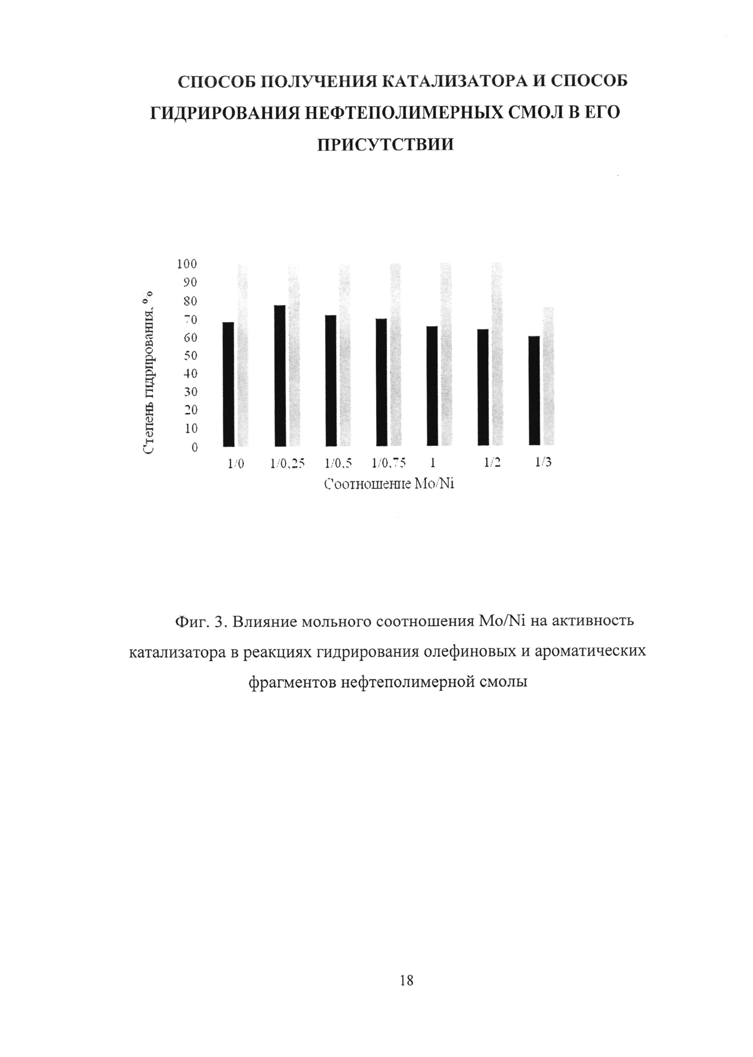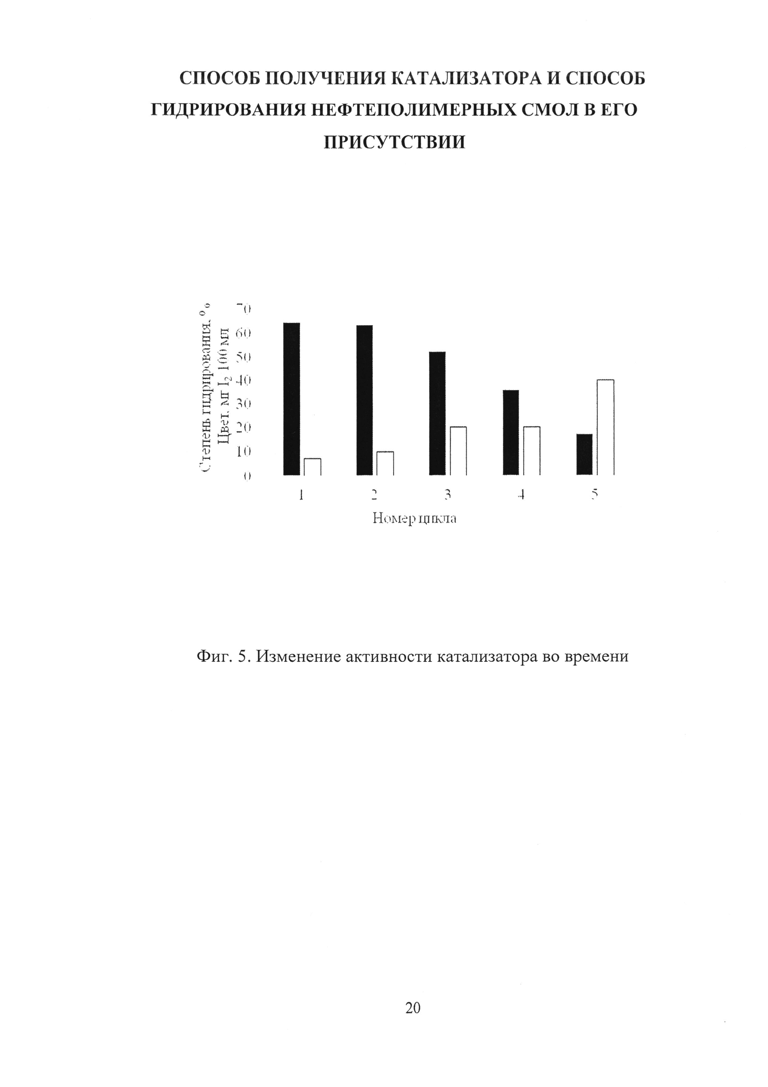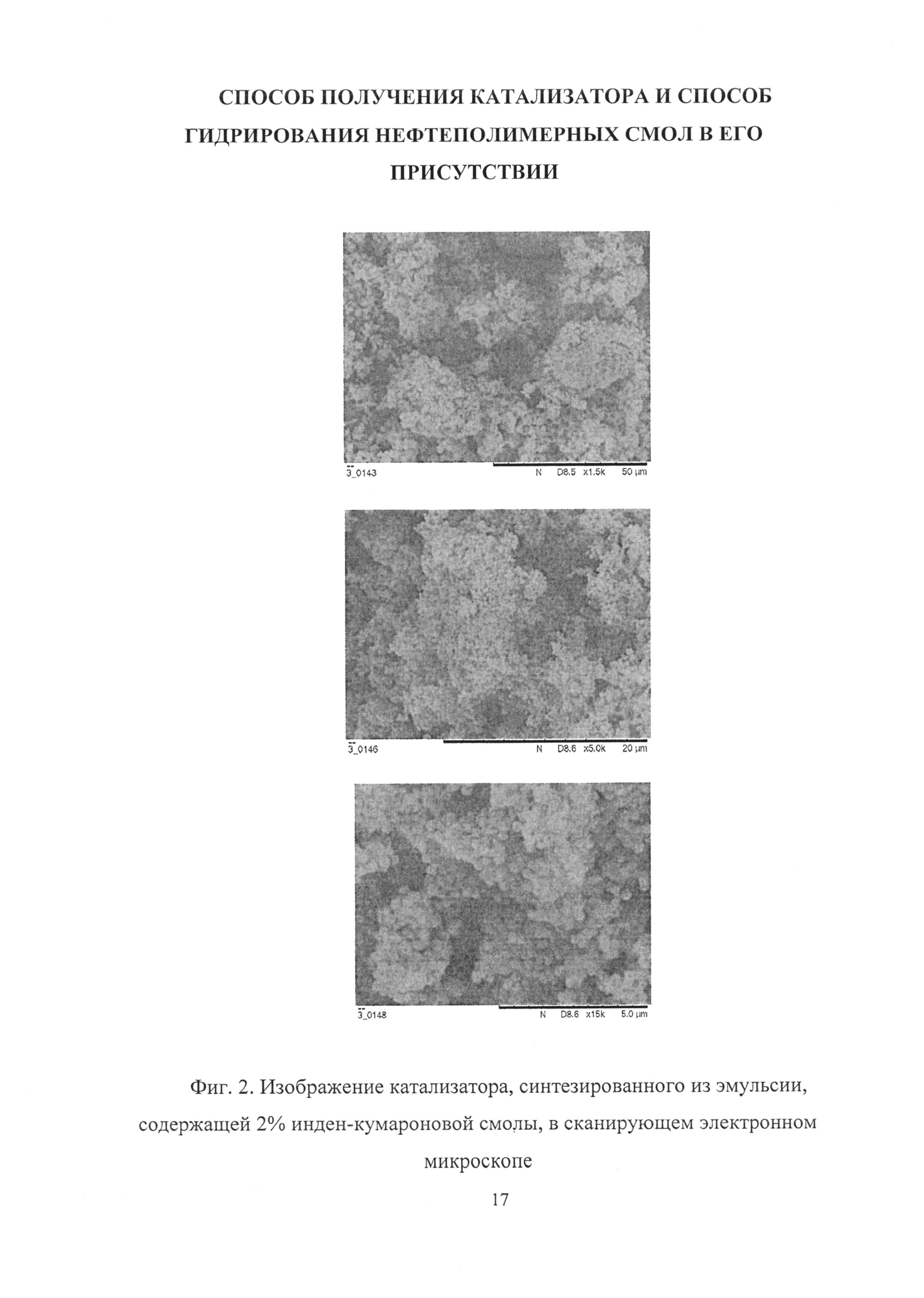 Изобретение относится к процессам получения светлых нефтеполимерных смол гидрированием при повышенной температуре при давлении водорода в присутствии катализатора и может быть использовано для получения компонентов адгезивов и клеев-расплавов, цветных асфальтобетонов, а также в пищевой и полиграфической промышленности. По способу получения катализатора гидрирования нефтеполимерных смол прекурсор катализатора - гексагидрат нитрата никеля и тетрагидрат парамолибдата аммония - растворяют в воде. Водный раствор прекурсора катализатора с мольным отношением Mo/Ni 1/0.25-1/2 вводят в декалин, в который предварительно введен эмульгатор - нефтеполимерная или инденкумароновая смола в количестве от 1 до 6% мас. Получают эмульсию водного раствора прекурсора катализатора с содержанием воды не более 2% мас. Затем в эмульсию вводят сульфидирующий агент - элементную серу до мольного отношения S/Mo в катализаторе 2/1-4/1, проводят синтез катализатора и удаляют декалин с выделением полученного катализатора. По способу гидрирования нефтеполимерной смолы вначале нефтеполимерную смолу растворяют в циклогексане, или бензоле, или их смеси до концентрации от 20 до 40% мас. Затем в нее вводят полученный катализатор при его содержании от 1 до 3% мас. в расчете на молибден от нефтеполимерной смолы и ведут гидрирование последней при повышенной температуре и давлении водорода при работе катализатора в отсутствие его регенерации не менее трех циклов. Технический результат - повышение степени гидрирования ароматических и олефиновых фрагментов при невысокой стоимости прекурсоров катализаторов, повышение стабильности катализатора при сохранении его активности без регенерации, улучшение цвета нефтеполимерной смолы. 2 н.п. ф-лы, 2 табл., 17 пр., 5 ил.