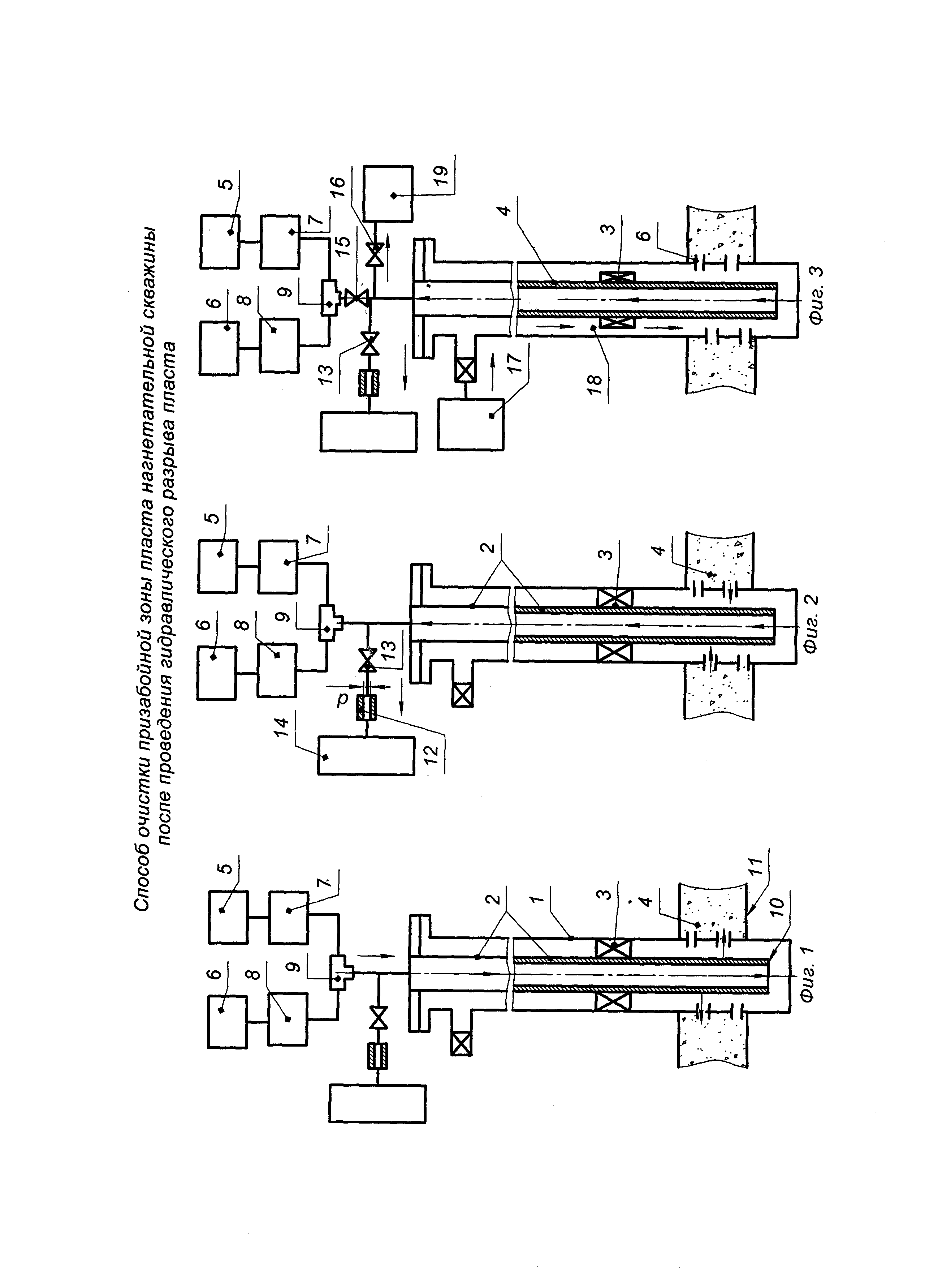 Изобретение относится к нефтедобывающей промышленности, а именно к способам очистки призабойных зон низкопроницаемых пластов в нагнетательных скважинах после проведения в них гидравлического разрыва пласта (ГРП). После проведения ГРП в скважину спускают колонну НКТ с пакером, производят замену скважинной жидкости на пену и посадку пакера над пластом, последовательно производят закачку в три цикла путем надавливания на пласт водогазовой смесью - пеной. Давление закачки пены в пласт с каждым циклом надавливания увеличивают ступенчато с равномерным шагом до значения, не превышающего в последнем цикле надавливания давления ГРП. Каждый цикл надавливания состоит из трех технологических операций, заключающихся в закачке пены в пласт по колонне НКТ до давления, соответствующего каждому циклу с последующим стравливанием давления через колонну НКТ с открытием крана на устьевой арматуре и изливом отработанной пены через штуцер. Проходной диаметр штуцера уменьшают с увеличением давления в каждом цикле надавливания на пласт пеной, причем с каждой технологической операцией сброс давления от давления закачки производят ступенчато с равномерным шагом до атмосферного в последней технологической операции. По окончании каждого цикла надавливания производят распакеровку, замену штуцера на больший проходной диаметр и обратную промывку скважины, далее производят посадку пакера для проведения следующего цикла. Повышается эффективность очистки, снижаются потери приемистости низкопроницаемых пластов, расширяются функциональные возможности способа независимо от наличия близкорасположенной добывающей скважины. 3 ил.