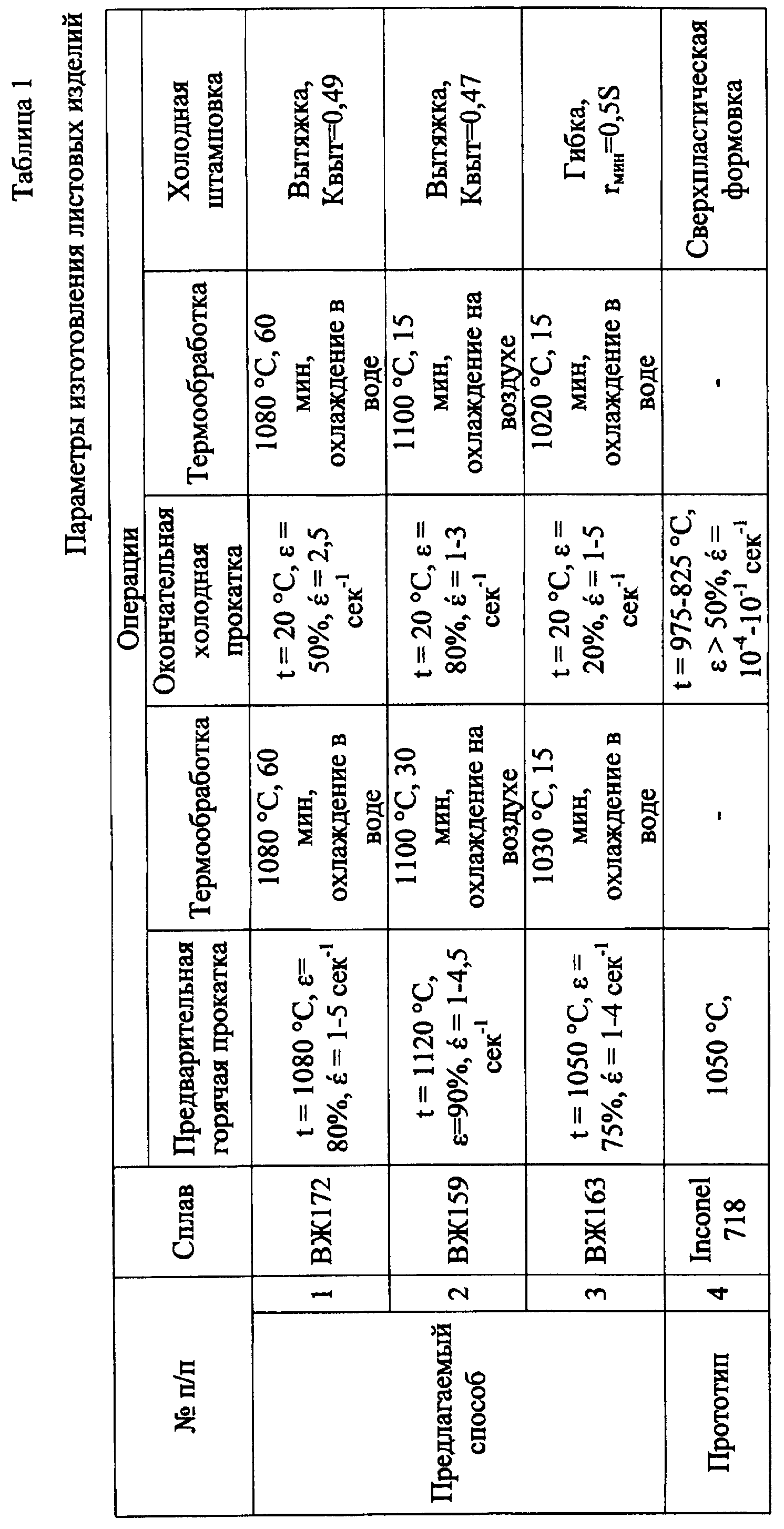 Способ получения листовых изделий из никелевых жаропрочных сплавов, включающий отливку слитка, деформационную обработку слитка, предварительную горячую прокатку и окончательную прокатку, формовку листовых изделий, отличающийся тем, что предварительную горячую прокатку проводят со степенью деформации не менее 70% и скоростью деформации 1-5 с-1 при Тпрγ'+30÷100°С, окончательную прокатку проводят в холодную со степенью деформации за проход 5-20%, с суммарной степенью деформации 20-80%, после предварительной горячей прокатки и окончательной холодной прокатки дополнительно проводят термообработку при Тпрγ'+30÷80°С и выдержке 15-60 мин с последующим быстрым охлаждением, а формовку листовых изделий осуществляют холодной штамповкой.