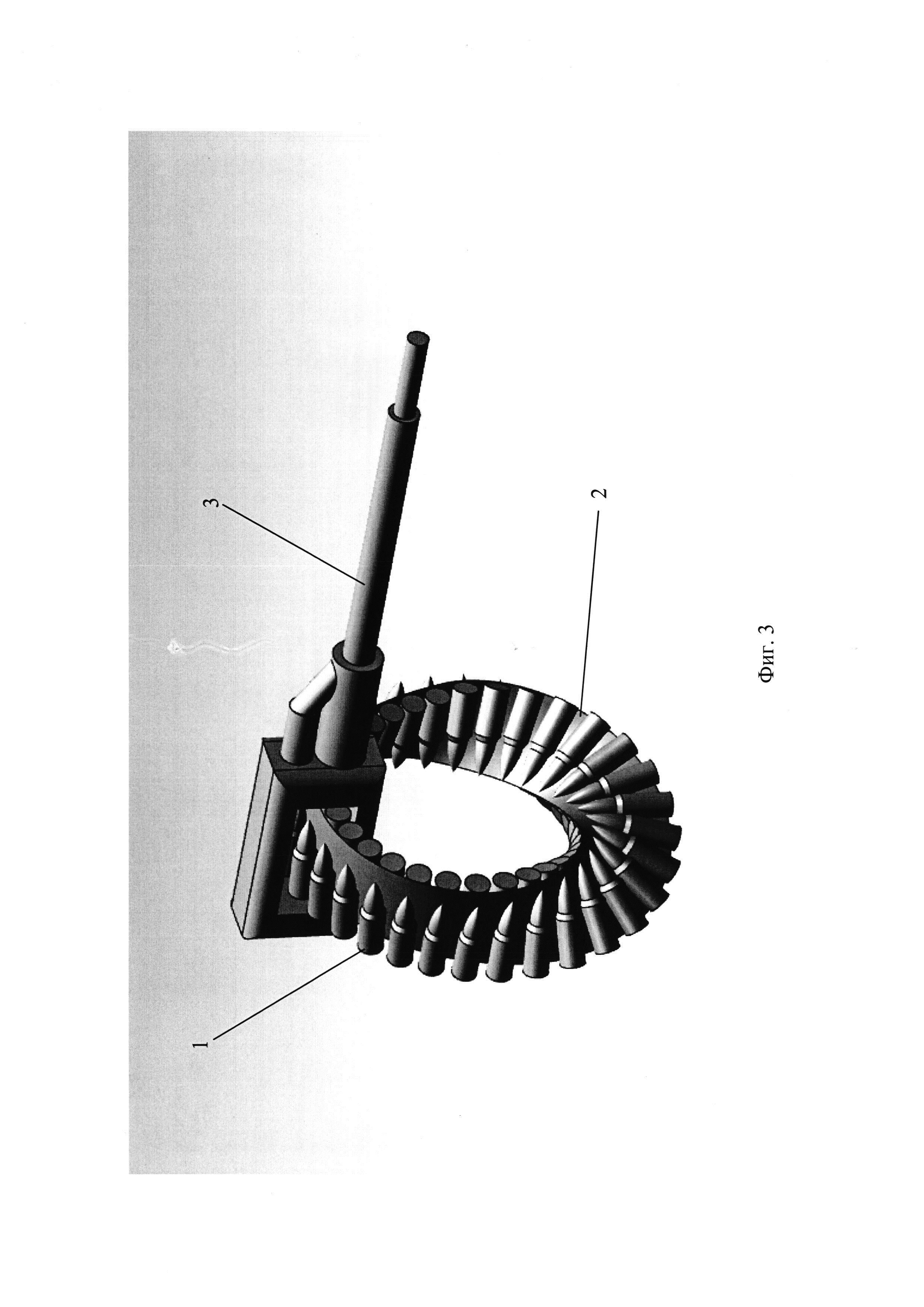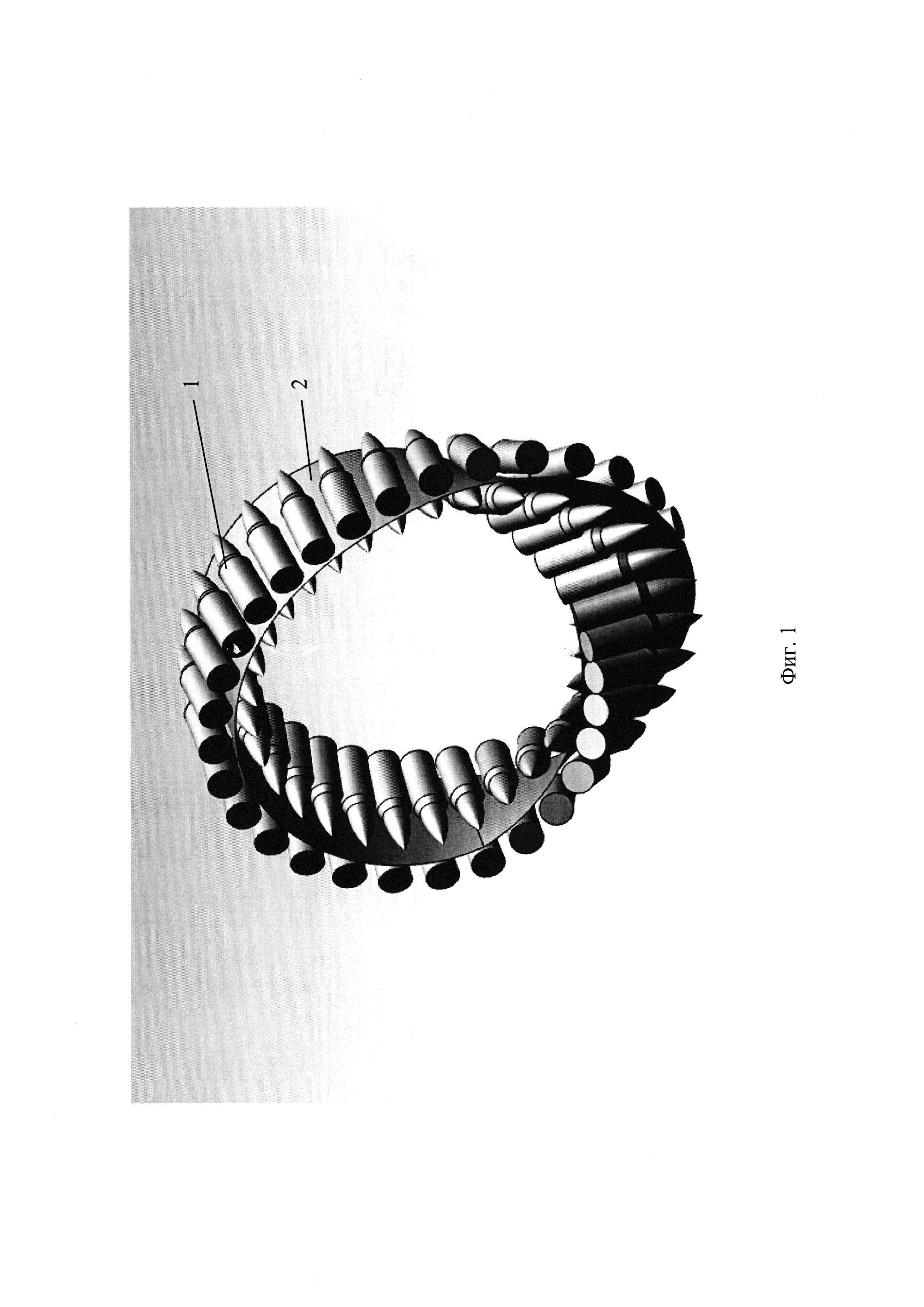 Изобретение относится к военной технике и может быть использовано при подаче боеприпасов в авиационное артиллерийское вооружение или другое огнестрельное оружие с ленточным питанием, например в пулеметы, гранатометы и автоматические пушки. Ленточное боепитание нашло широкое применение в конструкции огнестрельного оружия. При этом острой проблемой порой является недостаточный боекомплект. Особенно это актуально для авиационного артиллерийского вооружения, имеющего высокий темп стрельбы [1]. Целью изобретения является увеличение боекомплекта огнестрельного оружия с ленточным боепитанием. Известна патронная обойма из эластичного материала [2], представляющая собой рейку в форме желоба с загнутыми внутрь бортиками, в которую вставляются патроны. Недостатком данной обоймы является ее ограниченная вместимость боеприпасов. Известна ленточная подача патронов для автоматического огнестрельного оружия [3], представляющая собой патронную ленту, расположенную во входящих друг в друга усеченных пирамидах или конусах, размещенных в эластичном рукаве. Недостатком такого способа боепитания оружия является ограниченная вместимость боеприпасов ленты, большие масса и габариты. Наиболее близкой по технической сути и достигаемому техническому результату является патронная лента [4], содержащая удерживающие патроны звенья, выполненные в форме изогнутой пластины, и принятая нами за прототип разработанной нами патронной ленты повышенной вместимости. Однако недостатком патронной ленты [4] является ограниченная вместимость боеприпасов. Поставленная цель по увеличению боекомплекта огнестрельного оружия достигается применением патронной ленты повышенной вместимости, конструкция которой представлена на фиг. 1-3, где цифрами обозначены: 1 - боеприпас, основными элементами которого являются гильза и снаряд; 2 - патронная лента; 3 - ствол огнестрельного оружия. В предлагаемом нами техническом решении увеличения боекомплекта огнестрельного оружия боеприпасы располагаются на кольцевой односторонней патронной ленте (фиг. 1), концы которой при соединении между собой поворачиваются относительно друг друга на 180° так, что образуют так называемую ленту Мёбиуса [5]. Патронная лента является гибкой и может изготавливаться из хлопчатобумажных или синтетических тканей, пластмасс, металлических сплавов, композиционных или других, имеющих необходимую прочность, материалов и быть сплошной или состоять из соединенных между собой отдельных звеньев. Боеприпасы 1 (фиг. 2) в предлагаемой нами патронной ленте 2 до соединения ее концов располагаются в два ряда с обеих сторон ленты, причем направлены боеприпасы на разных сторонах ленты в противоположные стороны. После соединения концов патронная лента становится односторонней (фиг. 1). Боеприпасы на патронной ленте должны располагаться друг от друга на расстоянии, обеспечивающем перекручивание ленты при соединении ее концов. Кроме того, патронная лента должна иметь достаточно большую длину и малую ширину, необходимые для ее перекручивания и соединения ее концов. Патронная лента располагается в огнестрельном оружии так (фиг. 3), что при подаче боеприпаса 1 для выстрела снаряд в боеприпасе направлен в сторону ствола 3 огнестрельного оружия, из которого производится выстрел. Подаваемый в огнестрель