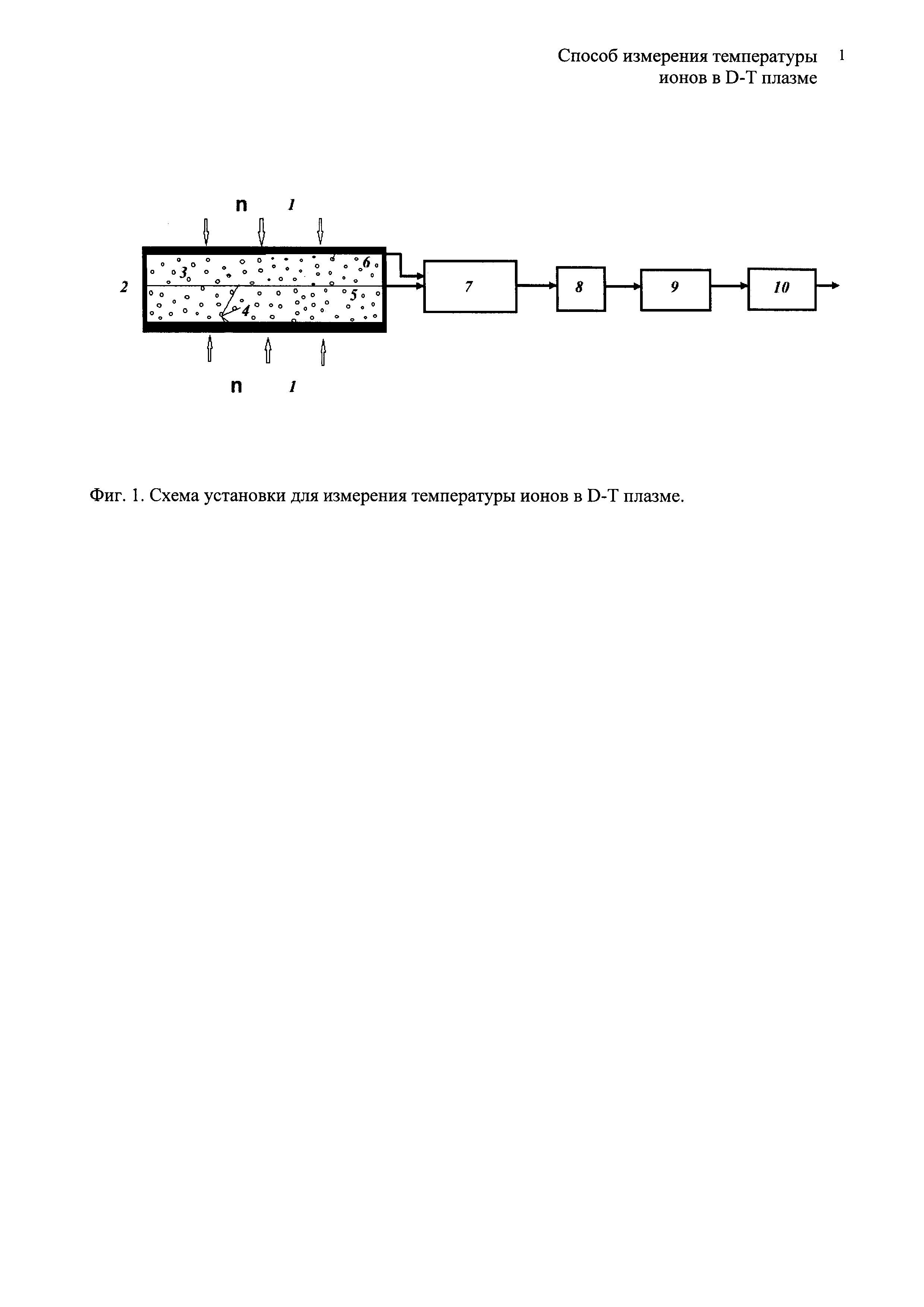 1. Способ измерения температуры ионов в D-T плазме, включающий регистрацию нейтронов из D-T плазмы нейтронным детектором, использование сигналов детектора для формирования энергетического спектра нейтронов, измерение его ширины на полувысоте ΔEn и вычисление по величине ΔEn температуры ионов Ti, отличающийся тем, что регистрацию нейтронов из D-T плазмы проводят газовым пропорциональным детектором, заполненным тормозным газом и спектрометрическим газом, для которого возможны реакции (n, α) на его изотопных составляющих под действием нейтронов с соответствующими энергиями из D-T плазмы, а для формирования энергетического спектра нейтронов используют токовые сигналы детектора, из которых отбирают только те сигналы, форма которых характеризуется двумя пиками от полностью затормозившихся в чувствительном газовом объеме детектора сильноионизирующих ядер-продуктов - α-частицы и тяжелого ядра из реакции (n, α) нейтронов со спектрометрическим газом. 2. Способ измерения температуры ионов в D-T плазме по п. 1, отличающийся тем, что в качестве спектрометрического газа используют СО2, N2, Ne или другие газы, для которых возможны реакции (n, α) на их изотопных составляющих под действием нейтронов с соответствующими энергиями из D-T плазмы, или их смеси. 3. Способ измерения температуры ионов в D-T плазме по п. 1, отличающийся тем, что в качестве тормозного газа используют Хе, или другой газ, или их смеси.