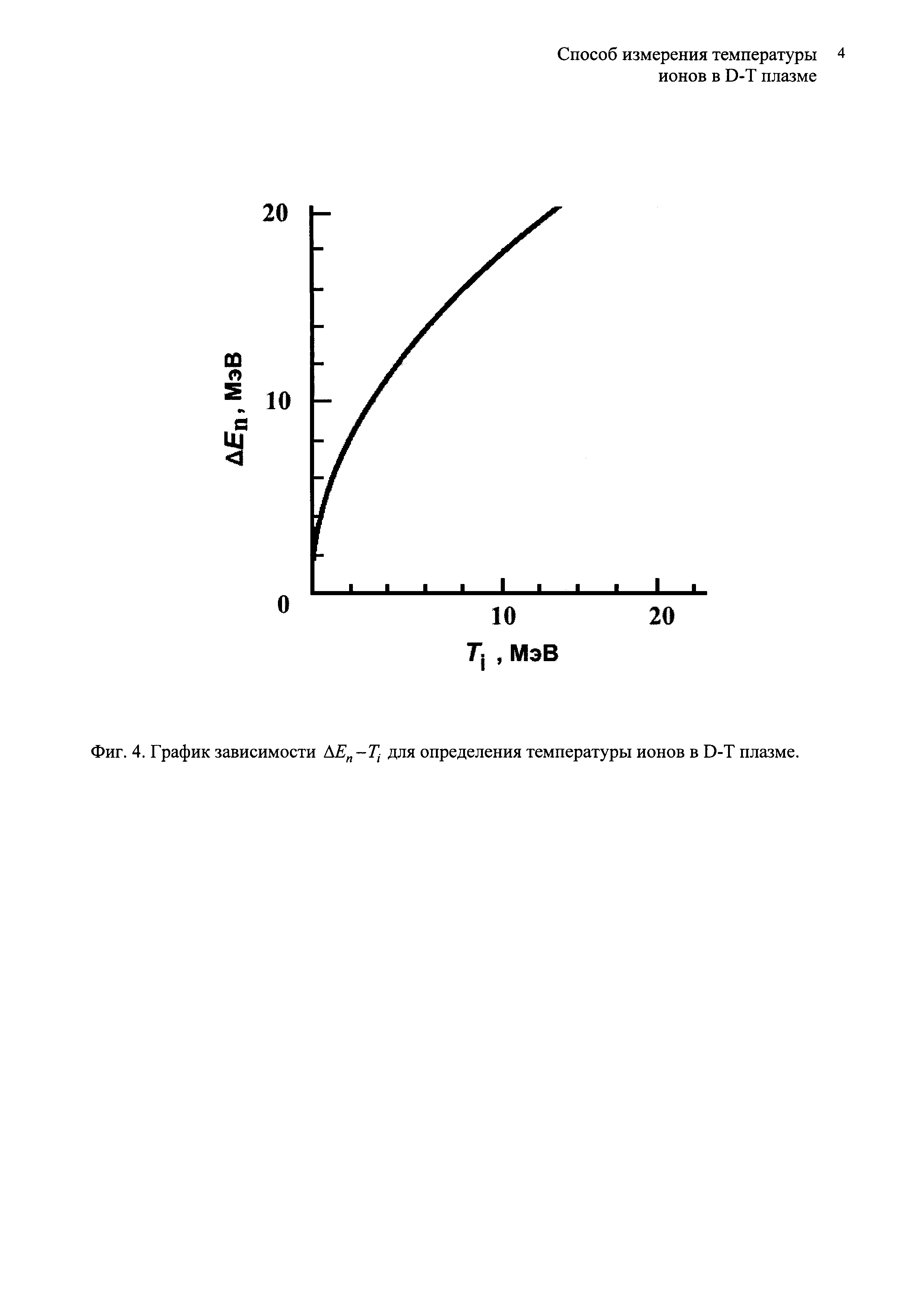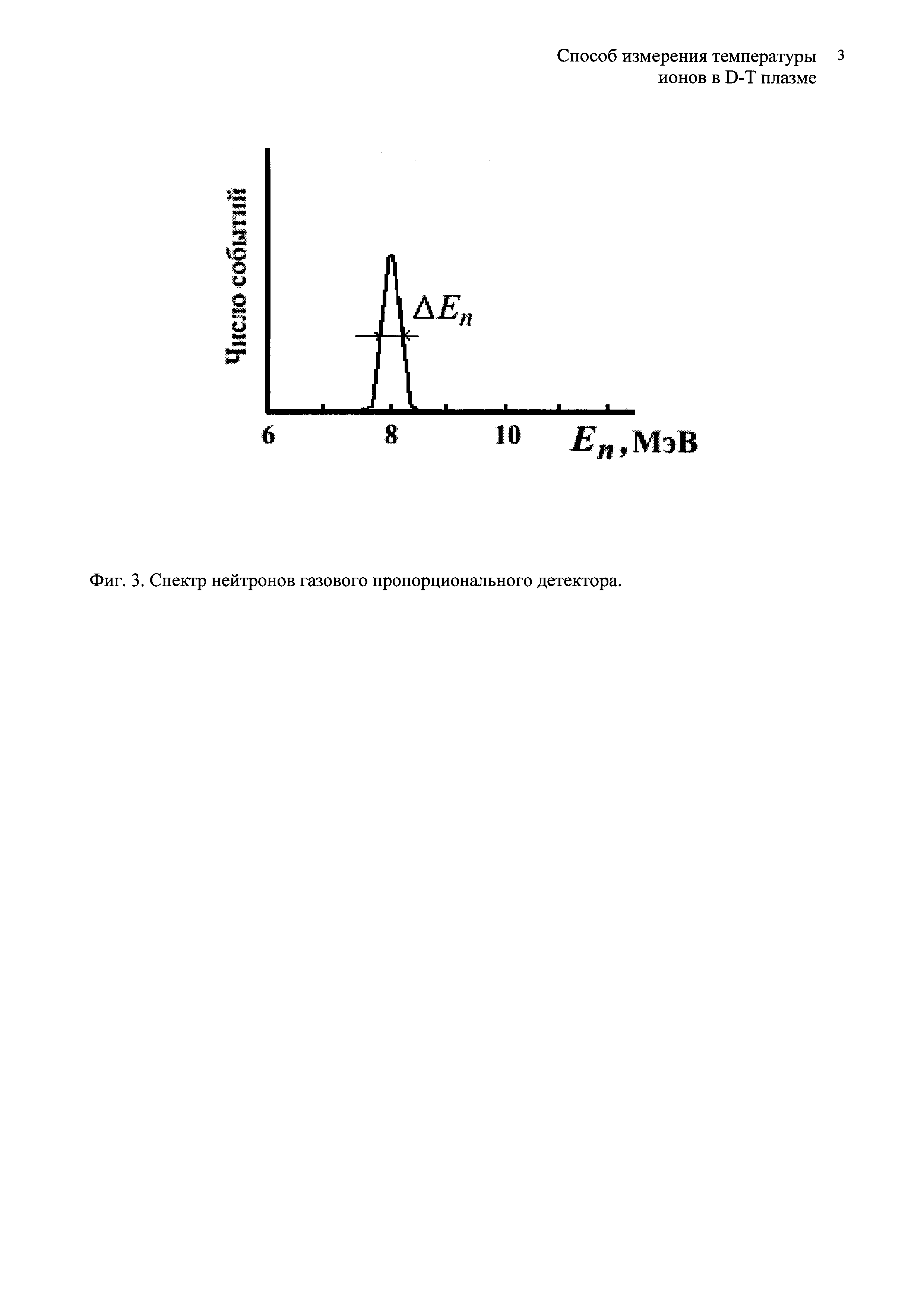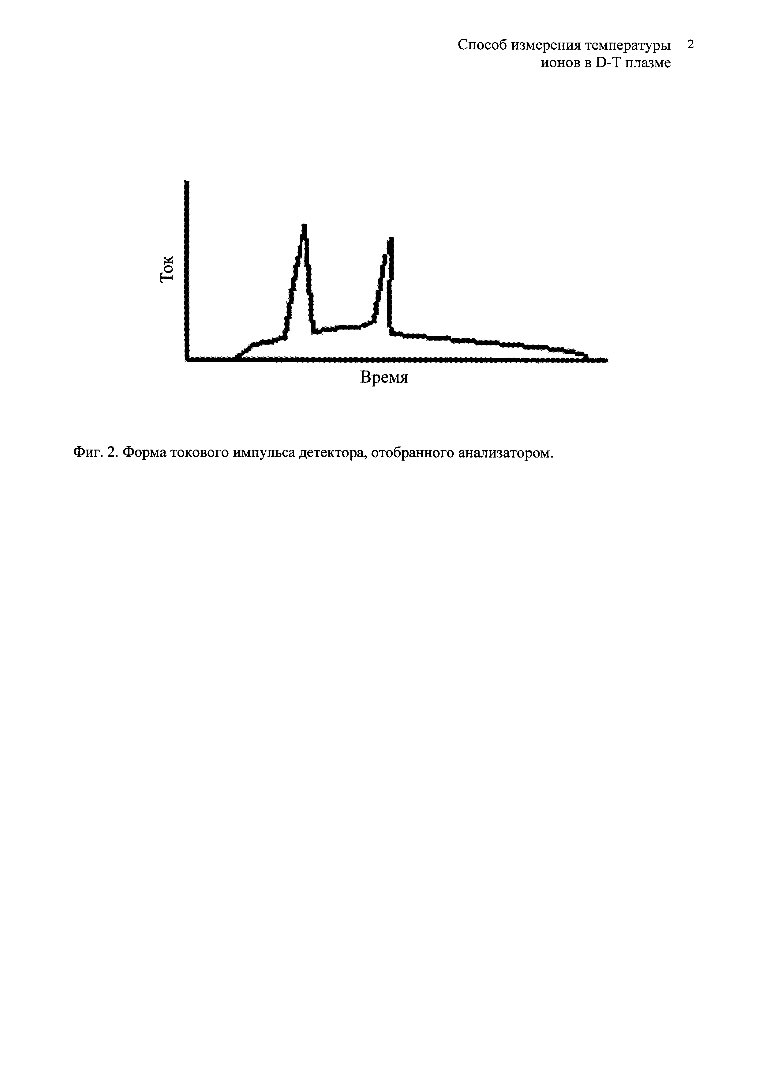Изобретение относится к ядерной физике и физике высокотемпературной плазмы. Способ измерения температуры ионов в D-T плазме включает регистрацию нейтронов из D-T плазмы нейтронным детектором, использование сигналов детектора для формирования энергетического спектра нейтронов, измерение его ширины на полувысоте ΔEи вычисление по величине ΔEтемпературы ионов T, при этом регистрацию нейтронов из D-T плазмы проводят газовым пропорциональным детектором, заполненным тормозным газом и спектрометрическим газом, для которого возможны реакции (n, α) на его изотопных составляющих под действием нейтронов с соответствующими энергиями из D-T плазмы, а для формирования энергетического спектра нейтронов используют токовые сигналы детектора, из которых отбирают только те сигналы, форма которых характеризуется двумя пиками от полностью затормозившихся в чувствительном газовом объеме детектора сильноионизирующих ядер-продуктов - α-частицы и тяжелого ядра из реакции (n, α) нейтронов со спектрометрическим газом. Технический результат – повышение точности измерения температуры ионов в D-T плазме. 2 з.п. ф-лы, 4 ил.