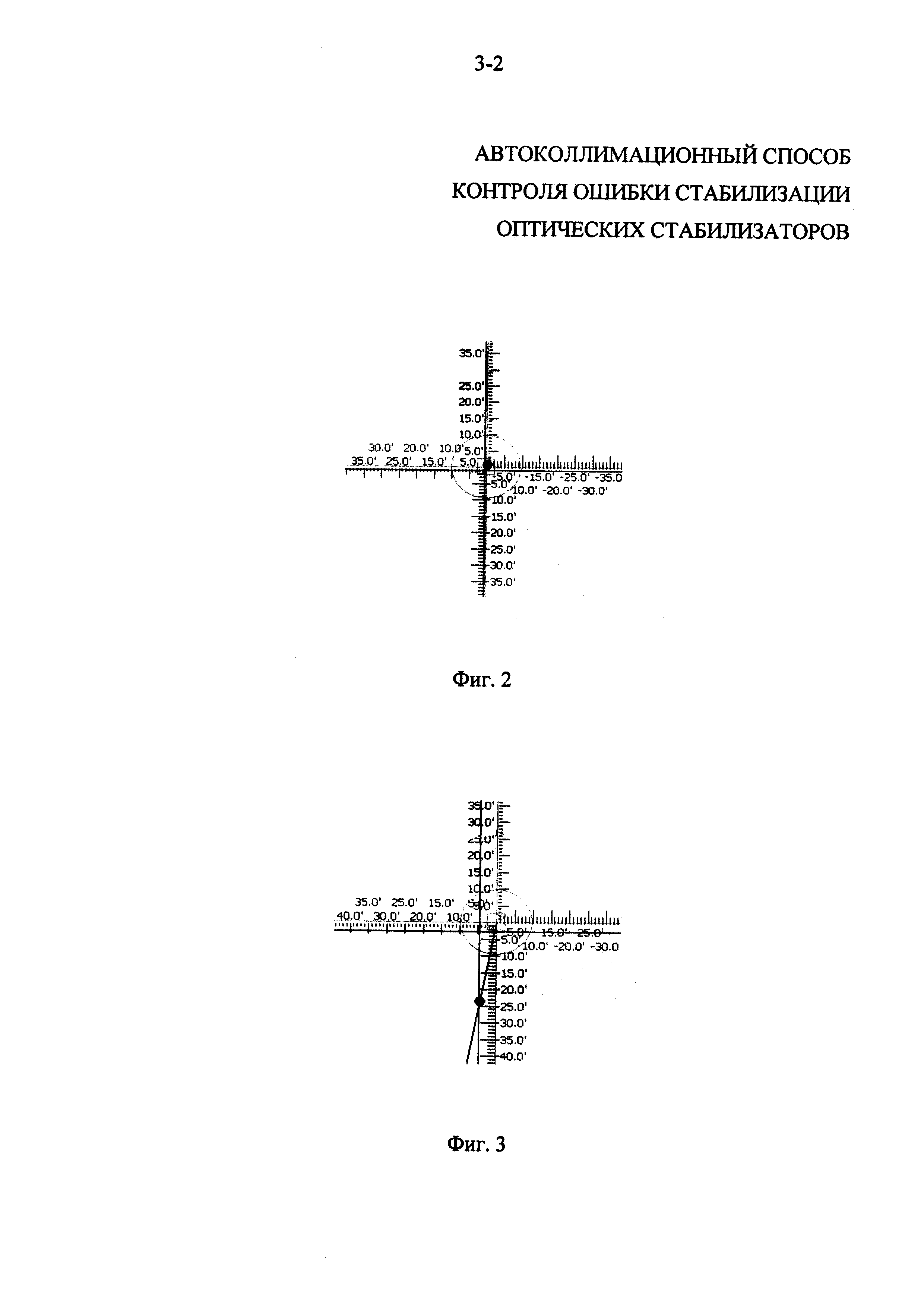 1. Автоколлимационный способ контроля ошибки стабилизатора оптических стабилизаторов, заключающийся в том, что на стенд устанавливают контролируемое изделие и технологическое зеркало, отдельно устанавливают автоколлиматор, причем контролируемое изделие устанавливают с возможностью поворота относительно стенда и жестко закрепляют на стенде технологическое зеркало, при этом обеспечивают оптическую связь автоколлиматора, контролируемого изделия и технологического зеркала, производят юстировку системы, для этого подают на головное зеркало контролируемого изделия пучок света от автоколлиматора, который отражается от головного зеркала контролируемого изделия, попадает на технологическое зеркало, отражается от него и возвращается в автоколлиматор, далее совмещают автоколлимационное изображение марки автоколлиматора с перекрестием в наблюдательном приборе и принимают это изображение за ноль, производят движение стенда по заданной программе, при этом стенд совершает колебательные движения, по крайней мере, в одной плоскости, стабилизатор компенсирует движения стенда, на наблюдательном приборе наблюдают смещение изображения автоколлимационной марки автоколлиматора, снимают координаты смещения в угловой мере, отличающийся тем, что стенд совершает сложные колебательные движения в двух взаимно перпендикулярных плоскостях, далее через заданные равные промежутки времени снимают координаты смещения автоколлимационной марки по одной из перпендикулярных составляющих перекрестия наблюдательного прибора, по полученным данным строят график временной характеристики колебаний стабилизатора, рассчитывают частоту колебаний для каждой координаты смещения изображения автоколлимационной марки, вычисляют амплитудные значения амплитудно-частотной характеристики для каждого значения частоты в частотно временном спектре, строят график амплитудно-частотной характеристики и повторяют операции для второй перпендикулярной составляющей перекрестия наблюдательного прибора. 2. Автоколлимационный способ контроля ошибки стабилизатора оптических стабилизаторов по п. 1, отличающийся тем, что для контроля выбирают цифровой лазерный скоростной автоколлиматор, что позволяет использовать в качестве наблюдательного прибора монитор ПК. 3. Автоколлимационный способ контроля ошибки стабилизатора оптических стабилизаторов по п. 2, отличающийся тем, что процесс контроля автоматизируют с помощью различных программ ЭВМ.