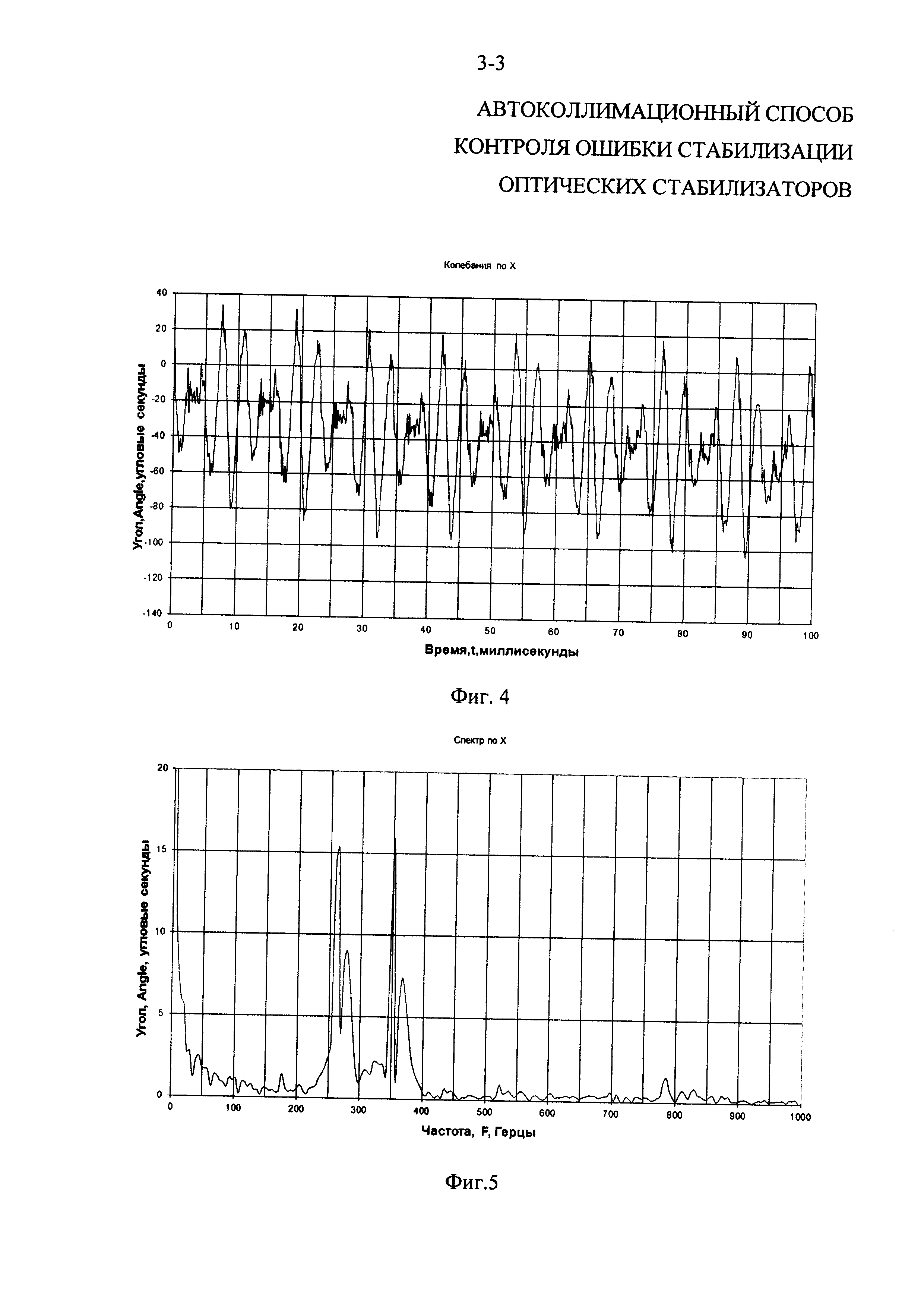 Автоколлимационный способ контроля ошибки стабилизации оптических стабилизаторов относится к области контроля параметров стабилизации и вибрации и может быть использован для проверки ошибки стабилизации и виброустойчивости стабилизаторов оптических систем прицельно-наводящих комплексов летательных аппаратов. Автоколлимационный способ контроля ошибки стабилизатора оптических стабилизаторов заключается в том, что на стенд устанавливают контролируемое изделие и технологическое зеркало, отдельно устанавливают цифровой лазерный скоростной автоколлиматор. Причем контролируемое изделие устанавливают с возможностью поворота относительно стенда и жестко закрепляют на стенде технологическое зеркало, при этом обеспечивают оптическую связь цифрового лазерного скоростного автоколлиматора, контролируемого изделия и технологического зеркала, производят юстировку системы, производят движение стенда по заданной программе, при этом стенд совершает колебательные движения, при этом стенд совершает колебательные движения, по крайней мере, в одной плоскости. Кроме того, стабилизатор компенсирует движения стенда, на наблюдательном приборе наблюдают смещение изображения автоколлимационной марки цифрового лазерного скоростного автоколлиматора, снимают координаты смещения в угловой мере, стенд совершает сложные колебательные движения в двух взаимно перпендикулярных плоскостях. Далее через заданные равные промежутки времени снимают координаты смещения автоколлимационной марки по одной из перпендикулярных составляющих перекрестия наблюдательного прибора, по полученным данным строят график временной характеристики колебаний стабилизатора, рассчитывают частоту колебаний для каждой точки смещения автоколлимационной марки, вычисляют амплитудные значения амплитудно-частотной характеристики для каждого значения частоты в частотно временном спектре, строят график амплитудно-частотной характеристики, съем данных, построение графиков и АЧХ для другой перпендикулярной составляющей перекрестия наблюдательного прибора выполняются аналогично. Технический результат – повышение точности, объективности и надежности контроля параметров стабилизации и вибрации системы. 2 з.п. ф-лы, 5 ил.