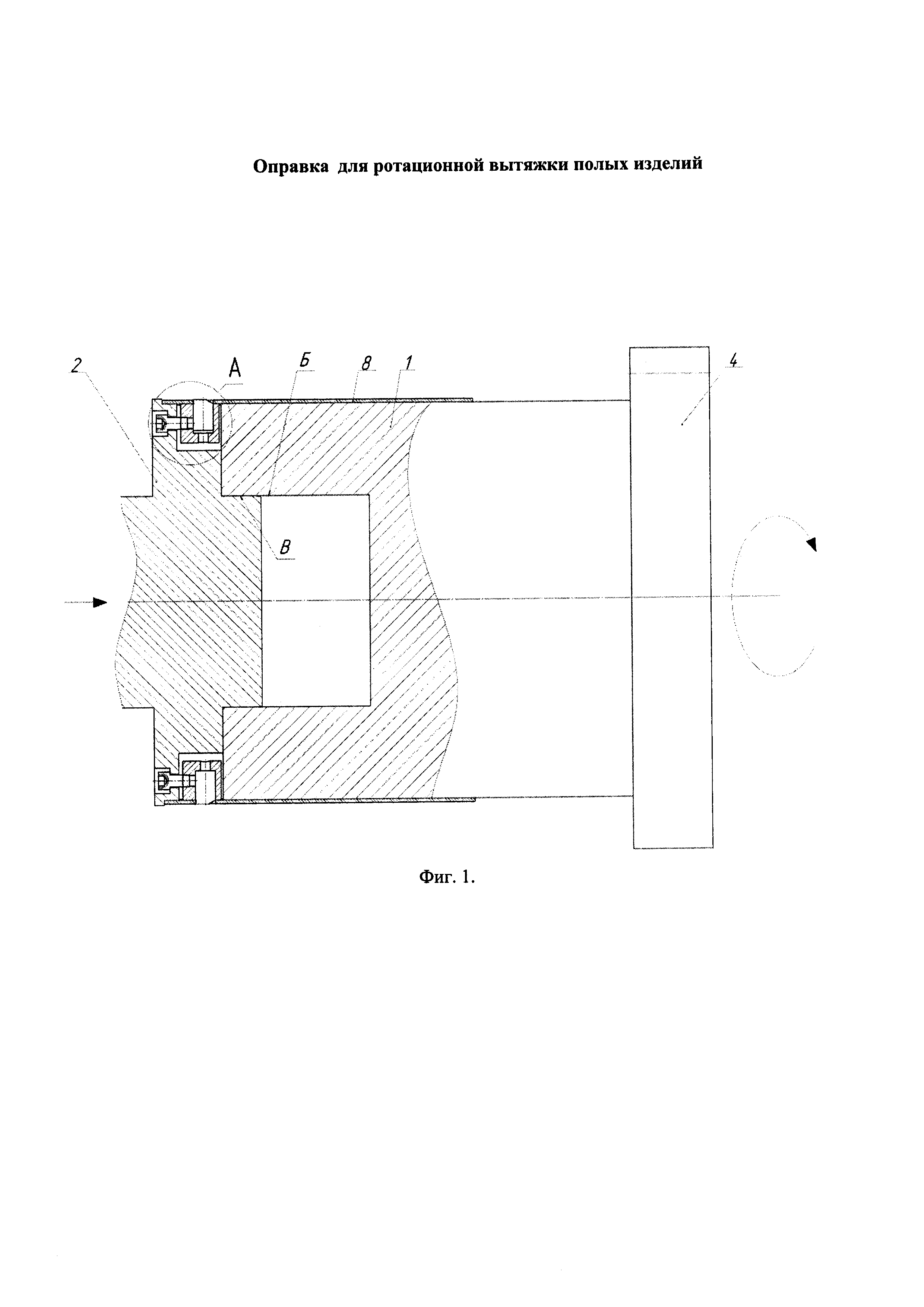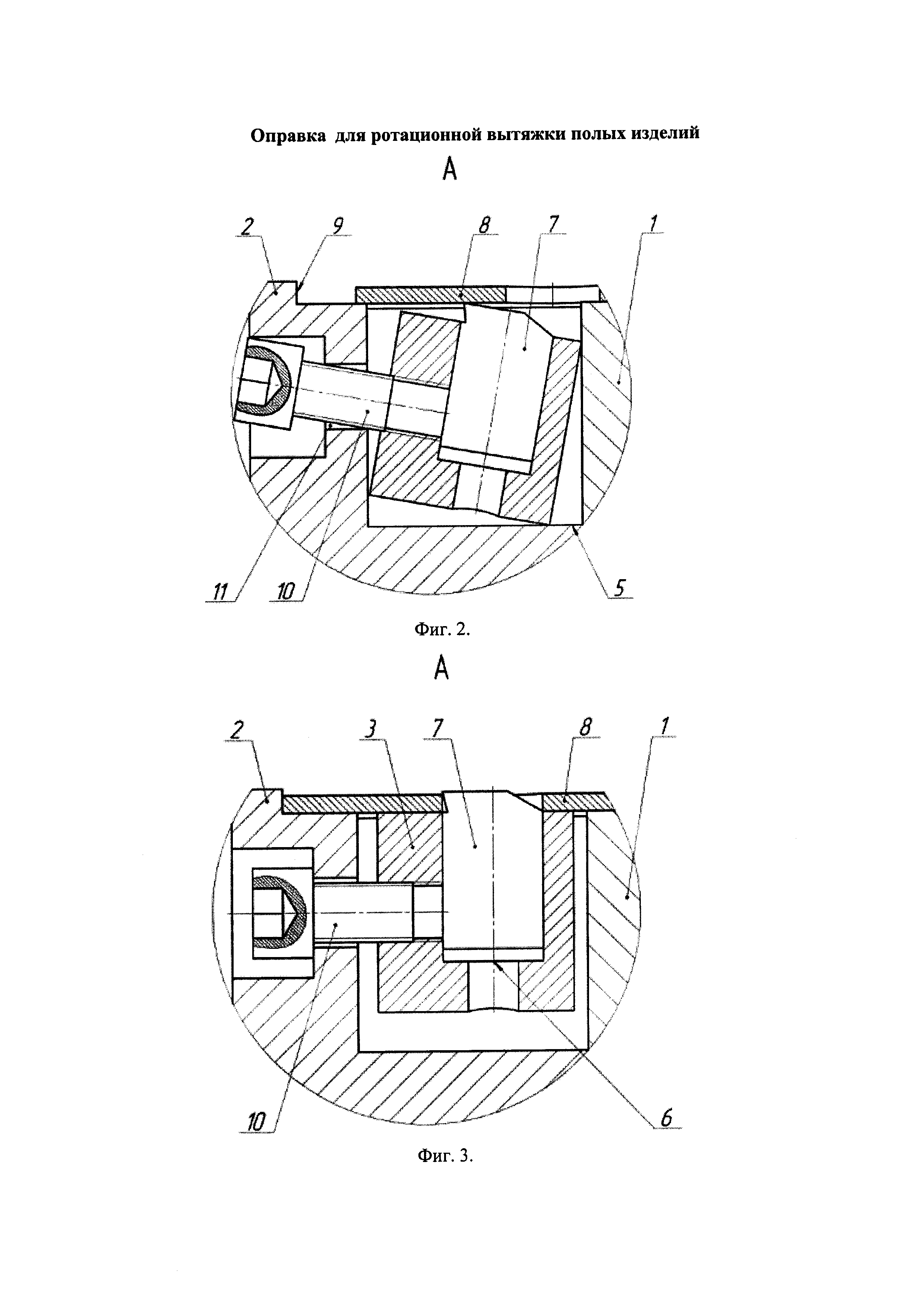 1. Оправка для ротационной вытяжки полых изделий, содержащая корпус, упор и прижимы для фиксации заготовки на корпусе оправки, отличающаяся тем, что упор имеет возможность установки на торце оправки с возможностью съема, на образующей упора со стороны, обращенной к торцу оправки, выполнены пазы, прижимы расположены с возможностью перемещения в пазах, каждый прижим оснащен прижимным элементом, имеющим возможность введения в технологическое отверстие заготовки для поджима ее торца к упору, при этом в прижиме выполнено резьбовое отверстие, в которое ввинчен затяжной элемент, пропущенный с зазором через отверстие, выполненное в упоре. 2. Оправка для ротационной вытяжки полых изделий по п. 1, отличающаяся тем, что прижимные элементы установлены на прижимах с возможностью съема.