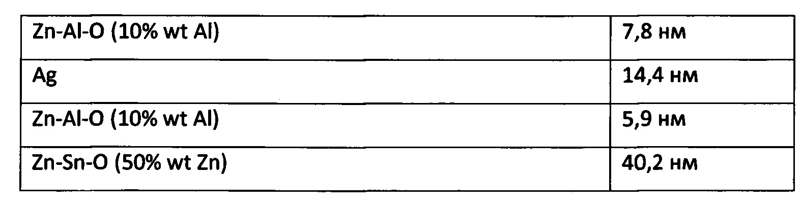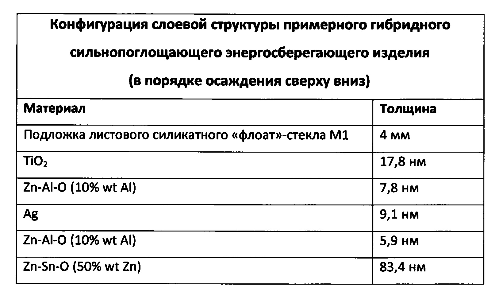 1. Изделие с гибридным сильнопоглощающим энергосберегающим покрытием на стеклянной подложке, включающее многослойное покрытие, содержащее непосредственно контактирующие между собой слои в следующем порядке от поверхности стеклянной подложки: первый слой, прилегающий к поверхности стеклянной подложки, содержащий диоксид титана TiO2, последующий слой, являющийся первым контактным слоем, который содержит оксид легированного алюминием цинка Zn-Al-O, за ним следует слой содержащий серебро Ag, являющийся первым слоем, отражающим инфракрасное излучение, следующий слой, который содержит оксид легированного алюминием цинка Zn-Al-O, является первым укрывным слоем, за ним следует промежуточный слой, содержащий оксид легированного цинком олова Zn-Sn-O, последующий слой является вторым контактным слоем и содержит оксид легированного алюминием цинка Zn-Al-O, за ним следует слой, содержащий серебро Ag, являющийся вторым слоем, отражающим инфракрасное излучение, следующий слой, который содержит оксид легированного алюминием цинка Zn-Al-O, является вторым укрывным слоем, следующий затем внешний слой для защиты всей ранее перечисленной структуры слоев, содержащий оксид легированного цинком олова Zn-Sn-O, отличающееся тем, что толщина промежуточного слоя, содержащего оксид легированного цинком олова Zn-Sn-O, составляет от 82 нм до 90 нм, а толщина слоя, содержащего диоксид титана TiO2, составляет от 12 нм до 18 нм, при этом отношение толщины слоя, содержащего диоксид титана TiO2, к толщине внешнего защитного слоя, содержащего оксид легированного цинком олова Zn-Sn-O, находится в пределе от 0,3 до 0,5, кроме того, совокупная толщина двух отражающих инфракрасное излучение слоев, содержащих серебро Ag, такова, что результирующее поверхностное омическое сопротивление изделия с гибридным энергосберегающим покрытием не превышает 3 Ом/квадрат, причем отношение толщины первого слоя, отражающего инфракрасное излучение, содержащего серебро Ag, к толщине второго слоя, отражающего инфракрасное излучение, содержащего серебро Ag, составляет от 0,3 до 0,7, при этом отношение толщины первого укрывного слоя, который содержит оксид легированного алюминием цинка Zn-Al-O, к толщине первого контактного слоя, содержащего оксид легированного алюминием цинка Zn-Al-O, и отношение толщины второго укрывного слоя, который содержит оксид легированного алюминием цинка Zn-Al-O, к толщине второго контактного слоя, содержащего оксид легированного алюминием цинка Zn-Al-O, равны и находятся в пределе от 0,45 до 1,15. 2. Изделие с гибридным сильнопоглощающим энергосберегающим покрытием на стеклянной подложке по п. 1, отличающееся тем, что стеклянная подложка с нанесенным на ее поверхность многослойным покрытием соединена с по меньшей мере одной дополнительной прозрачной подложкой, которая обращена к внешнему слою покрытия, содержащему оксид легированного цинком олова Zn-Sn-O.