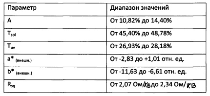 не превышающим 4%, и величиной коэффициента прямого пропускания солнечного излучения Tsol, составляющего не более 50%, в результате чего изделие обладает гибридными качествами, выражающимися в одновременном совокупном проявлении солнцезащитных свойств по отношению к избыточному тепловому солнечному воздействию и качеств энергоэффективности с точки зрения снижения излучательных теплопотерь в холодное время. При этом, отношение толщины первого слоя, отражающего ИК-излучение, содержащего серебро Ag, к толщине второго слоя, отражающего ИК-излучение, содержащего серебро Ag, должно быть в диапазоне от 0,3 до 0,7. Нижний из указанных пределов связан с тем, что, как было экспериментально показано, только при значениях отношения между толщиной первого слоя, отражающего ИК излучение, содержащего серебро Ag, и толщиной второго слоя, отражающего ИК излучение, содержащего серебро Ag, больше 0,3 противофазное резонансное затухание на длинах волн ближней ультрафиолетовой области будет обеспечивать заявленное в техническом результате настоящего изобретения снижение уровня прямого пропускания ультрафиолетового излучения ближней длинноволновой УФ-части спектра солнечного излучения по сравнению с прозрачной стеклянной подложкой без дополнительного тонкопленочного энергосберегающего оптического покрытия, характеризуемое коэффициентом пропускания ультрафиолетового излучения Tuv, составляющим менее 30%. Одновременно с этим, отношение толщины первого слоя, отражающего ИК излучение, содержащего серебро Ag, к толщине второго слоя, отражающего ИК излучение, содержащего серебро Ag, не должно превышать 0,7 с тем, чтобы интерференционный резонансный пик, приходящийся на видимую часть спектра электромагнитного излучения, при переизлучении между серебряными слоями высокоселективной платформы продукта с двумя отражающими ИК-излучение слоями наблюдался на длине волны не больше половины величины, кратной как минимум одной из длин волн излучения видимого диапазона спектра, соответствующих цветовому восприятию человеческого зрения, характеризуемому по оси b* цветовой дифференциации желтый/синий квазикоординой сетки международного стандарта CEILAB (D65/10°) значением, лежащим в пределе -12 до -2 относительных единиц, для обеспечения нейтрально-серого цвета отражения поверхности стеклянной подложки со стороны, противоположной стороне, на которую нанесено тонкопленочное энергоэффективное оптическое покрытие.