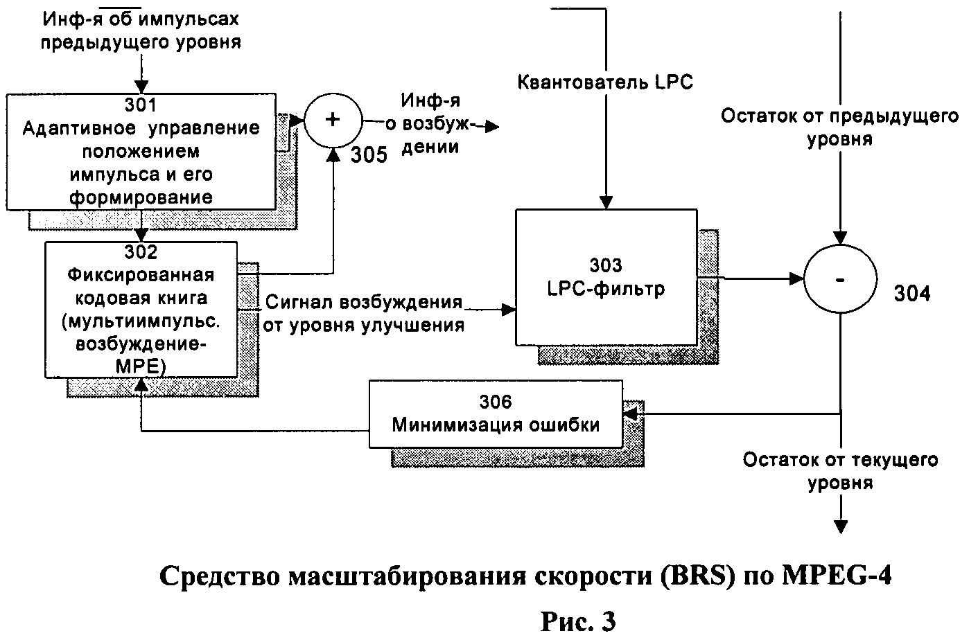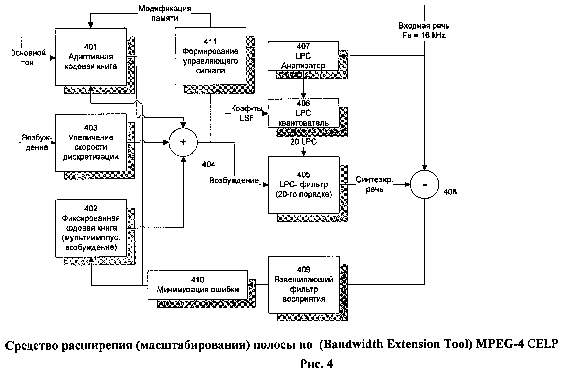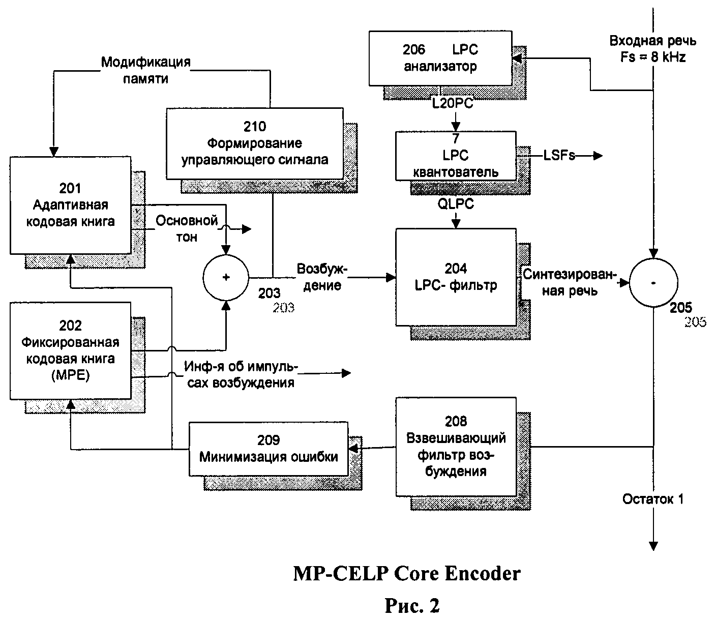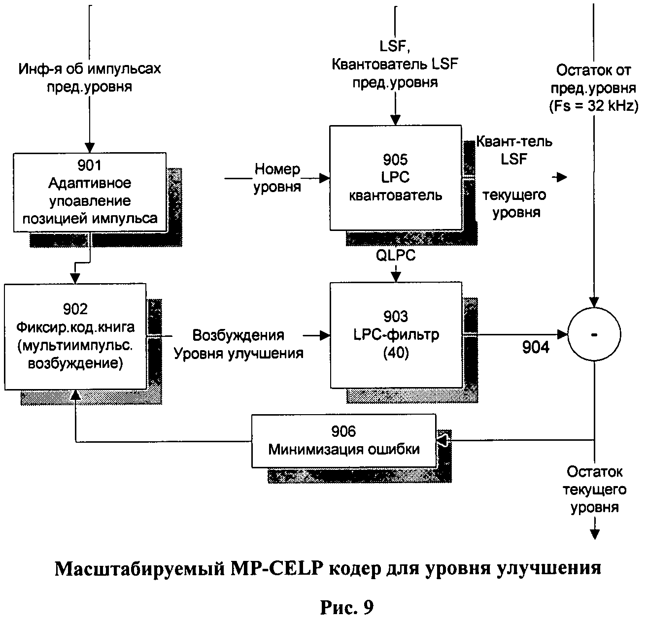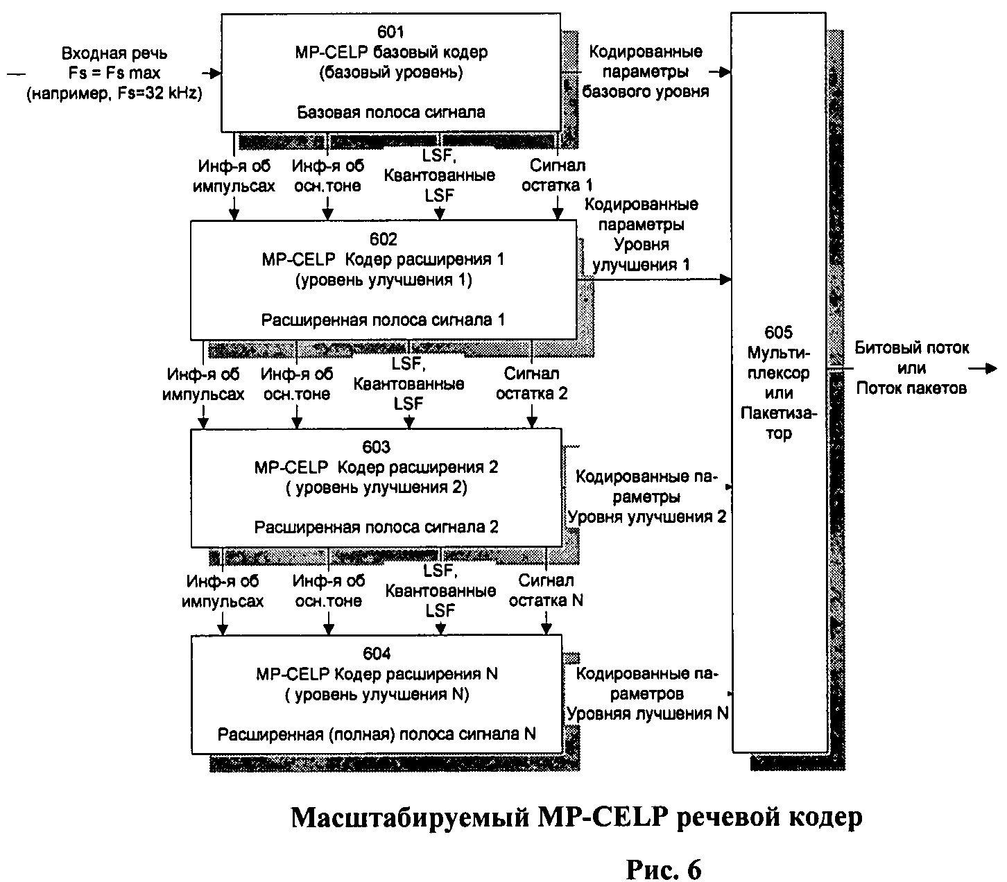 1. Способ многоуровневого масштабируемого по частотной полосе и скорости передачи кодирования речи на базе «анализа синтезом», в котором для каждого кадра или подкадра речи кодируют параметры источника многоимпульсного возбуждения и синтезирующего фильтра, включающий кодирование базового уровня и кодирование одного или более уровней улучшения, отличающийся тем, что для повышения качества речи и обеспечения устойчивости к потерям речевых кадров, передаваемых в сети пакетной коммутации, параметры вышеназванного синтезирующего фильтра определяют только один раз на этапе анализа при кодировании базового уровня, затем кодируют эти параметры таким образом, что только базовая часть речевого сигнала может быть восстановлена с заданным качеством в определенной ограниченной части частотной полосы сигнала, и хотя бы на одном последующем улучшающем уровне кодирования указанная часть частотной полосы расширяется. 2. Способ по п.1, где при кодировании очередного речевого кадра или подкадра текущие параметры вышеназванного синтезирующего фильтра кодируют на основе метода предиктивного кодирования, который опирается на ранее закодированные прошлые параметры синтезирующего фильтра, которые последними были закодированы без использования предсказания при кодировании одного из прошлых кадров или подкадров, если не выполнен заданный критерий отличия вышеназванных текущих параметров синтезирующего фильтра от вышеназванных прошлых параметров синтезирующего фильтра, а 3. Способ по п.1, в котором сигнал возбуждения синтезирующего фильтра формируют с помощью хотя бы одной фиксированной кодовой книги и с помощью адаптивной кодовой книги, если выполнен заданный критерий эффективности адаптивной кодовой книги, а 4. Способ по п.3, в котором память адаптивной кодовой книги обнуляется, если вышеназванный заданный критерий эффективности адаптивной кодовой книги не выполняется. 5. Способ по п.1, в котором к сигналу возбуждения синтезирующего фильтра дополнительно добавляют один или более импульсов возбуждения в том случае, если выполнен заданный критерий, характеризующий начало огласованного стационарного участка речевого сигнала. 6. Способ по п.1, или 2, или 3, или 4, или 5, в котором часть параметров или все параметры, представленные на одном или более уровнях кодирования, дополнительно защищают корректирующим кодом, и/или часть или все параметры базового уровня повторяются в следующем или следующих кадрах для повышения устойчивости к ошибкам и потерям кадров. 7. Способ по п.6, в котором корректирующее кодирование или повторение на базовом уровне в следующем или следующих кадрах применяют только к тем параметрам, которые были кодированы без использования предсказания. 8. Устройство, реализующие способ кодирования речи по п.1, или 2, или 3, или 4, или 5, или 7 и содержащее последовательно соединенные базовый кодер, на вход которого поступает речевой сигнал с максимальной частотой дискретизации, а выход подсоединен к первому входу блока мультиплексирования или пакетизации и канального кодирования непредиктивных параметров речевого сигнала, выход которого представляет собой битовый поток или поток пакетов, и серию кодеров расширения 1, 2,…,N, выходы которых подключены соответственно ко второму, третьему,…, (N+1)-му входам указанного блок