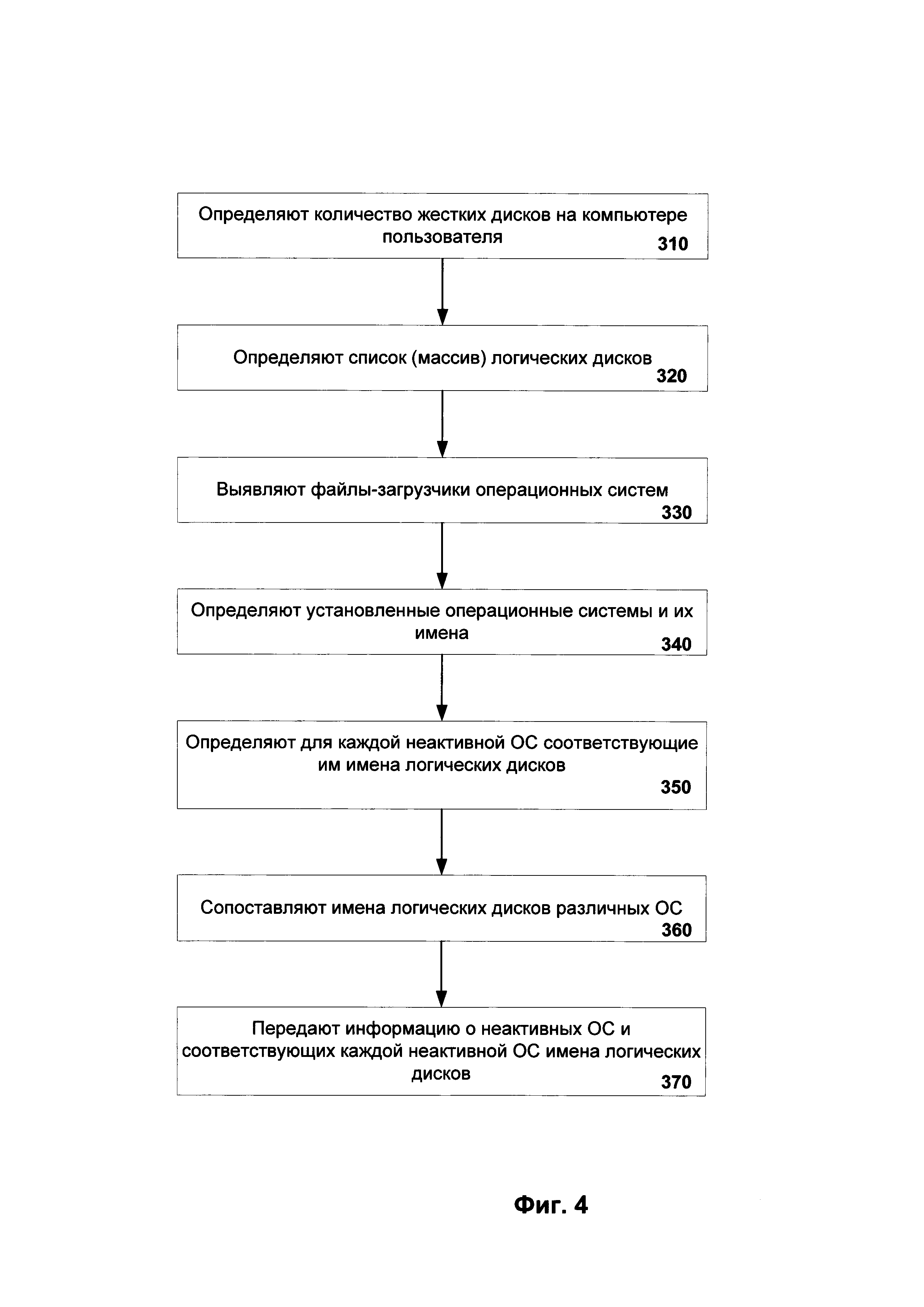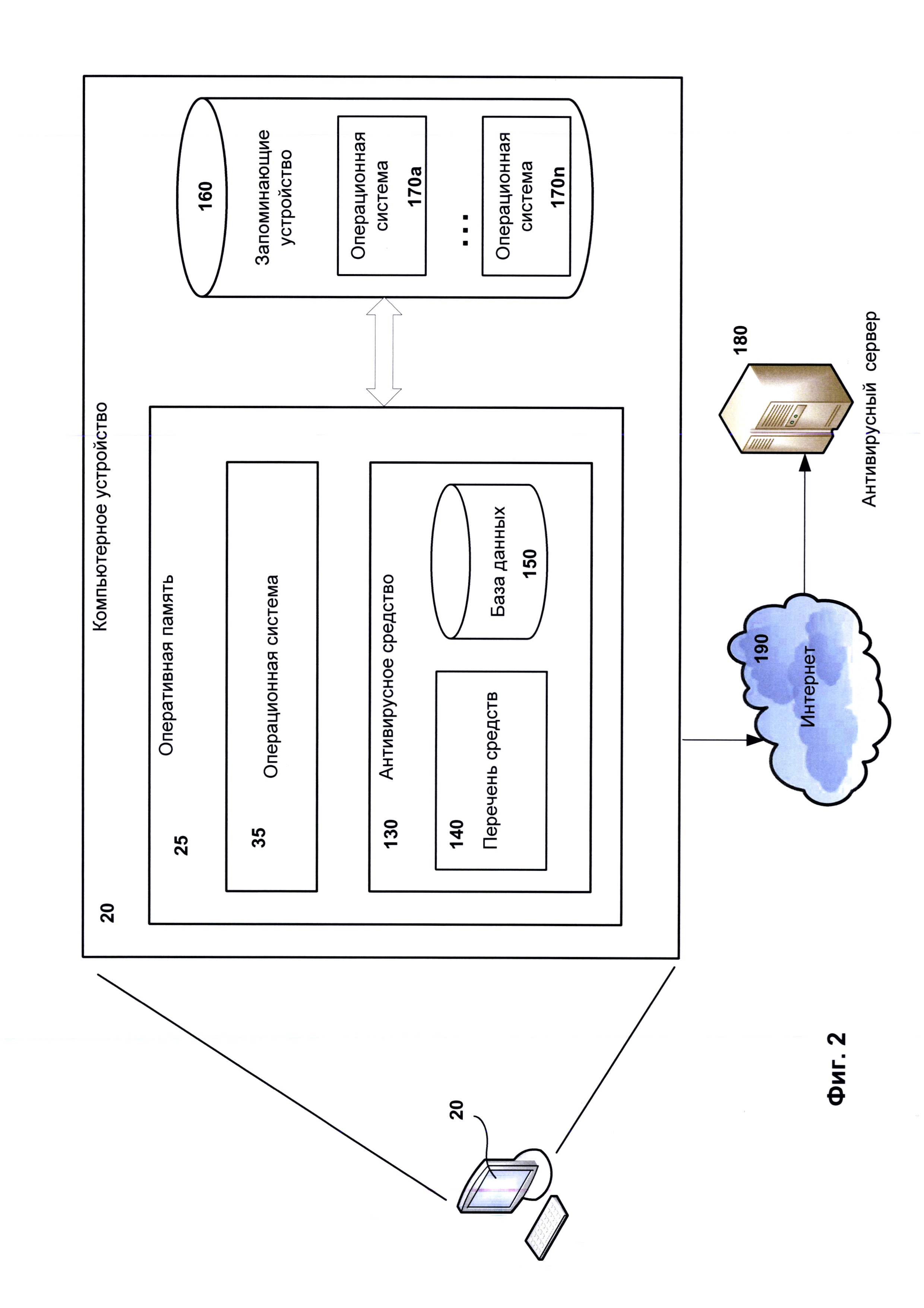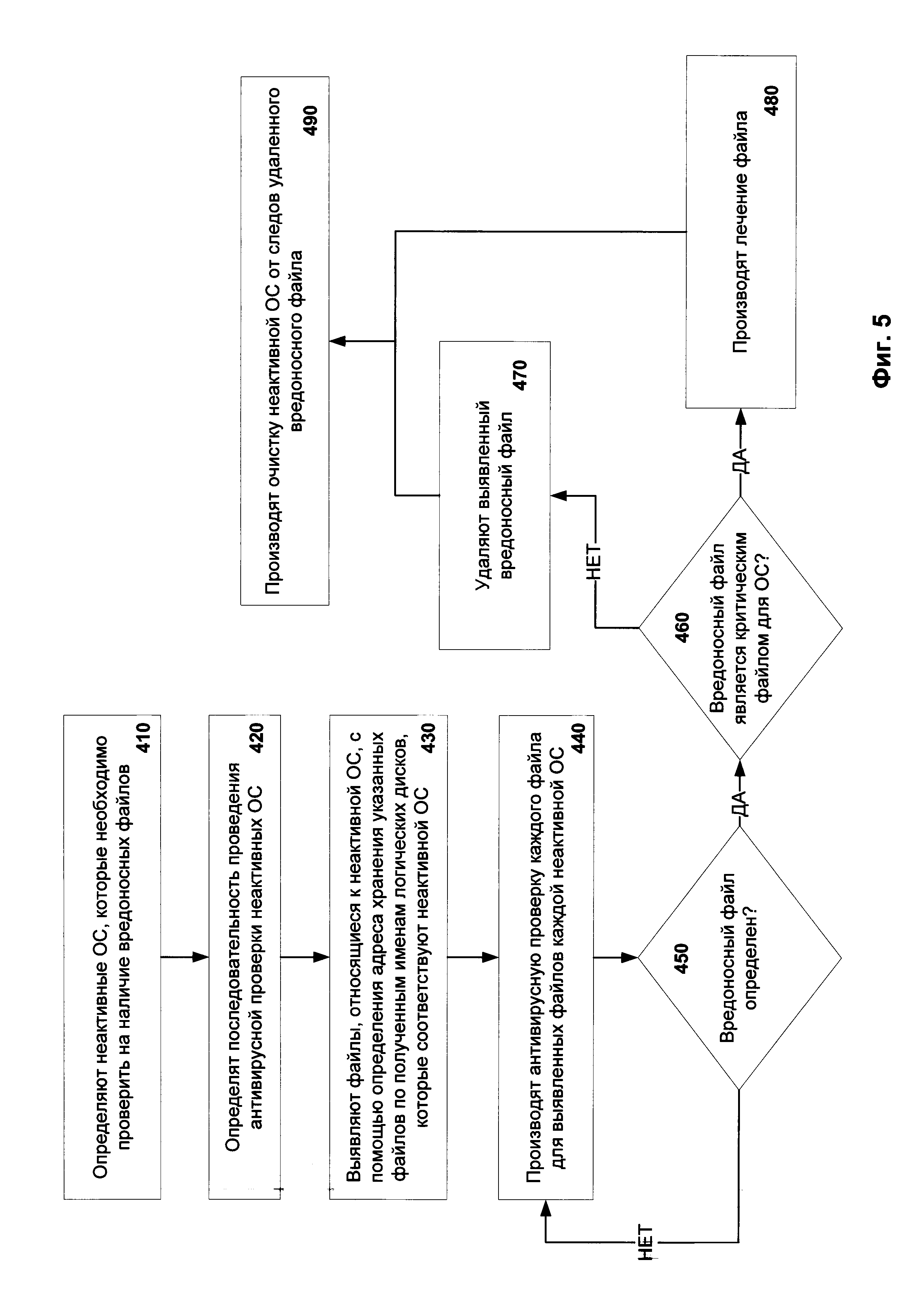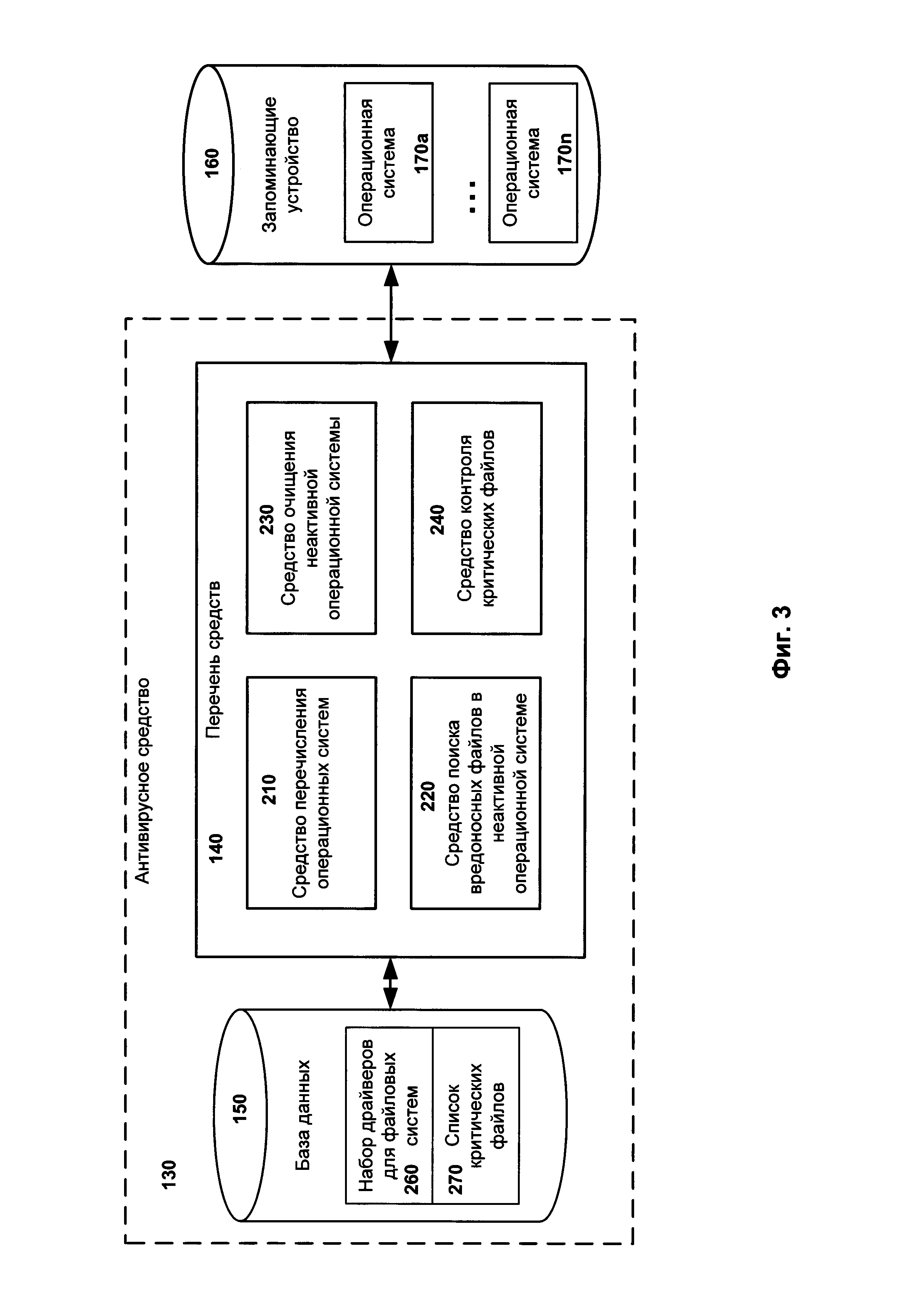 1. Система антивирусной проверки файлов операционной системы, которая установлена на компьютере и не запущена в момент проведения указанной проверки, т.е. неактивная операционная система, при этом заявленная система содержит: а) базу данных, связанную со средством перечисления операционных систем (ОС) и средством поиска файлов, предназначенную для хранения по крайней мере набора драйверов для различных файловых систем и информации, предназначенной для выполнения антивирусной проверки неактивных ОС; б) средство перечисления ОС, предназначенное для поиска по крайней мере одной установленной на компьютере неактивной ОС, определения идентификаторов логических дисков для каждой установленной неактивной ОС и передачи информации о каждой неактивной ОС и определенных идентификаторах логических дисков, соответствующих каждой неактивной ОС, средству поиска файлов, при этом средство перечисления ОС: - определяет все жесткие диски, установленные на компьютере; - производит разбор структуры каждого жесткого диска, установленного на компьютере, с помощью набора драйверов для различных файловых систем; - определяет список логических дисков; - выявляет файлы, выполняющие загрузку ОС (файлы-загрузчики) на определенных логических дисках; - производит анализ структуры каждого выявленного файла-загрузчика, во время которого определяется тип ОС, к которой относится файл-загрузчик, и места размещения ОС на логических дисках; - формирует список неактивных ОС, который содержит по крайней мере одну неактивную ОС; и - определяет идентификаторы логических дисков для каждой неактивной ОС; в) средство поиска файлов, предназначенное для определения по крайней мере одной неактивной ОС, которую необходимо проверить на наличие вредоносных файлов, и проведения антивирусной проверки файлов по крайней мере одной неактивной ОС, причем при наличии нескольких установленных неактивных ОС производится выбор неактивной ОС для антивирусной проверки, при этом во время антивирусной проверки неактивной ОС средство поиска файлов: - сопоставляет идентификаторы логических дисков, относящиеся к неактивной ОС, с идентификаторами логических дисков, относящимися к активной ОС, где под активной ОС понимается ОС, которая запущена в момент проведения указанной проверки; - определяет файлы, которые относятся к неактивной ОС, в активной ОС согласно полному пути хранения указанных файлов в неактивной ОС через сопоставленные идентификаторы логических дисков; - производит антивирусную проверку определенных файлов по определенным адресам хранения; - выявляет и удаляет по крайней мере один вредоносный файл. 2. Система по п. 1, в которой средство перечисления ОС дополнительно при анализе структуры выявленного файла-загрузчика определяет полный адрес месторасположения файлов. 3. Система по п. 1, в которой средство перечисления ОС во время анализа структуры каждого выявленного файла-загрузчика дополнительно включает анализ косвенных признаков, согласно которым определяет идентификатор операционной системы. 4. Система по п. 1, в которой под идентификаторами логических дисков для ОС «Microsoft Windows» понимаются по крайней мере имена логических дисков. 5. Система по п. 1, в которой под информацией об неактивных ОС понимается по крайней мере одно или более из следующих сведен