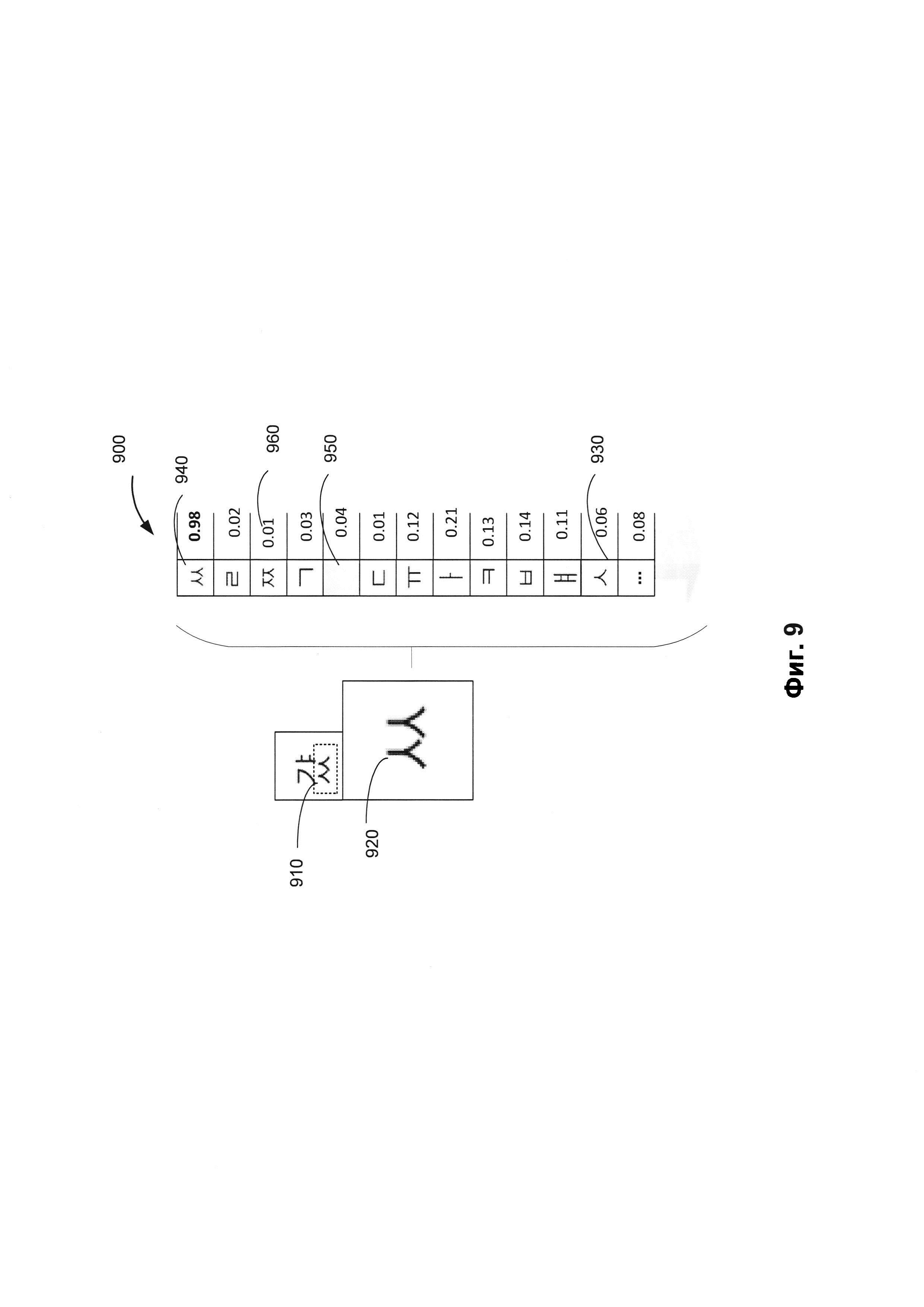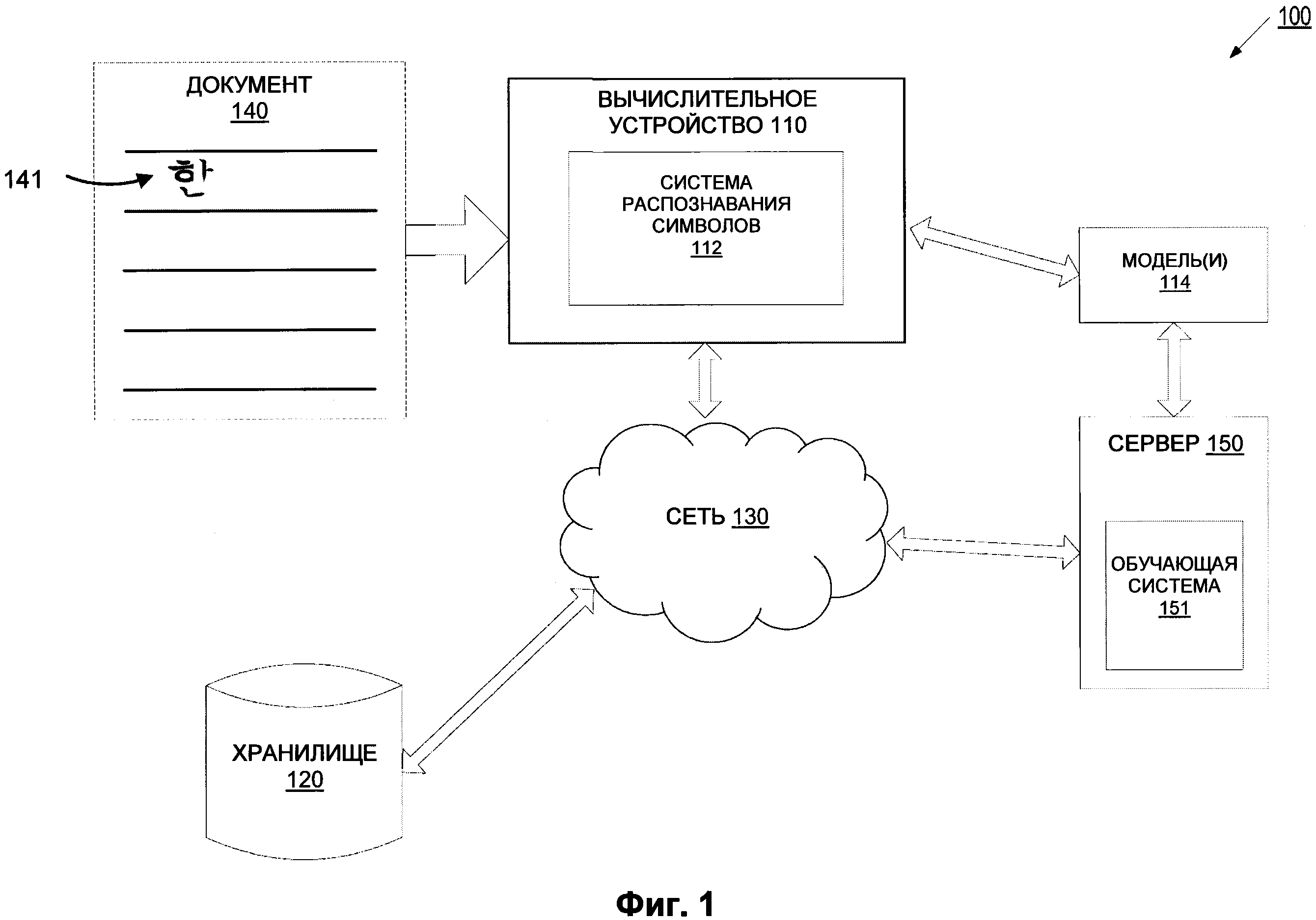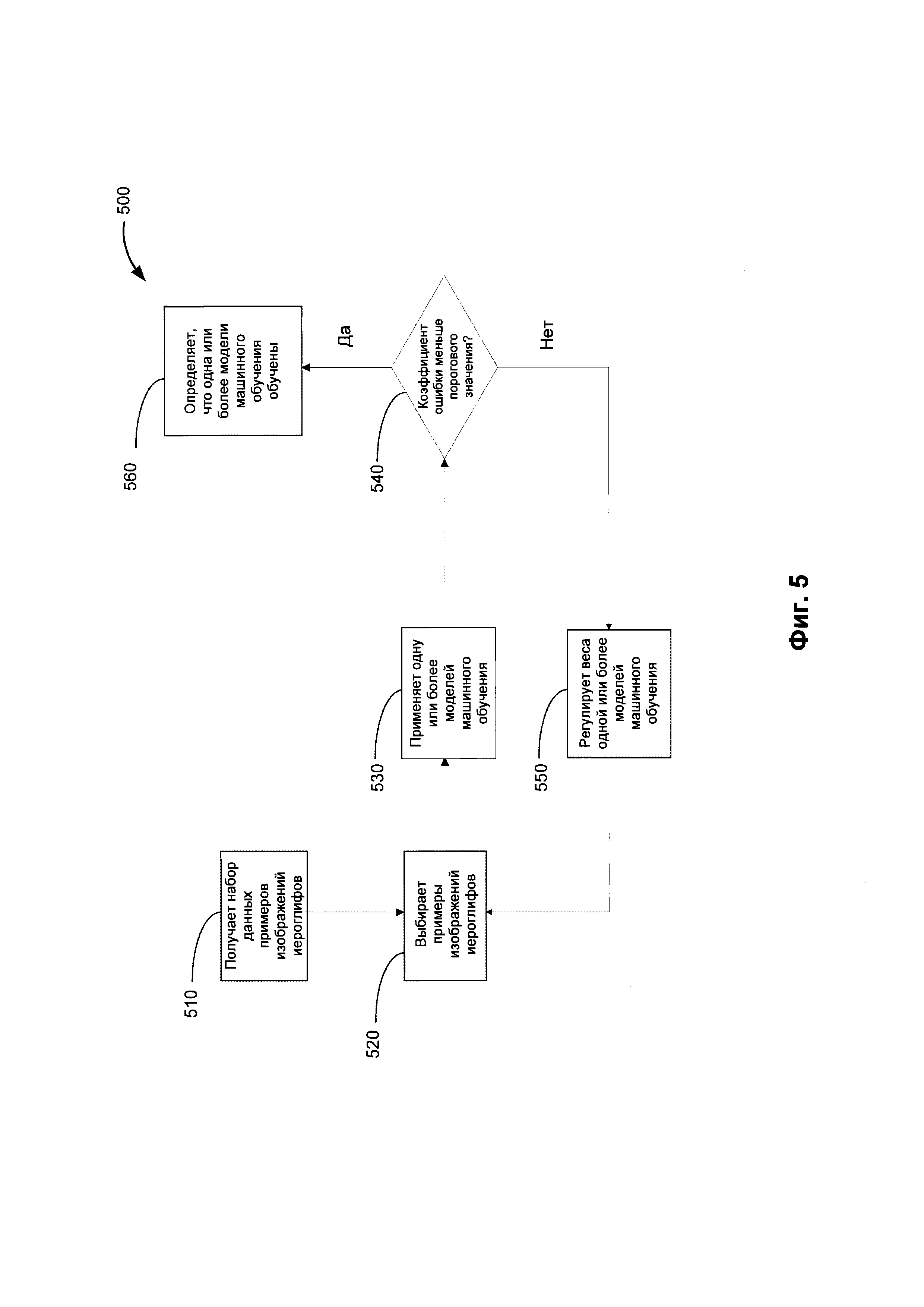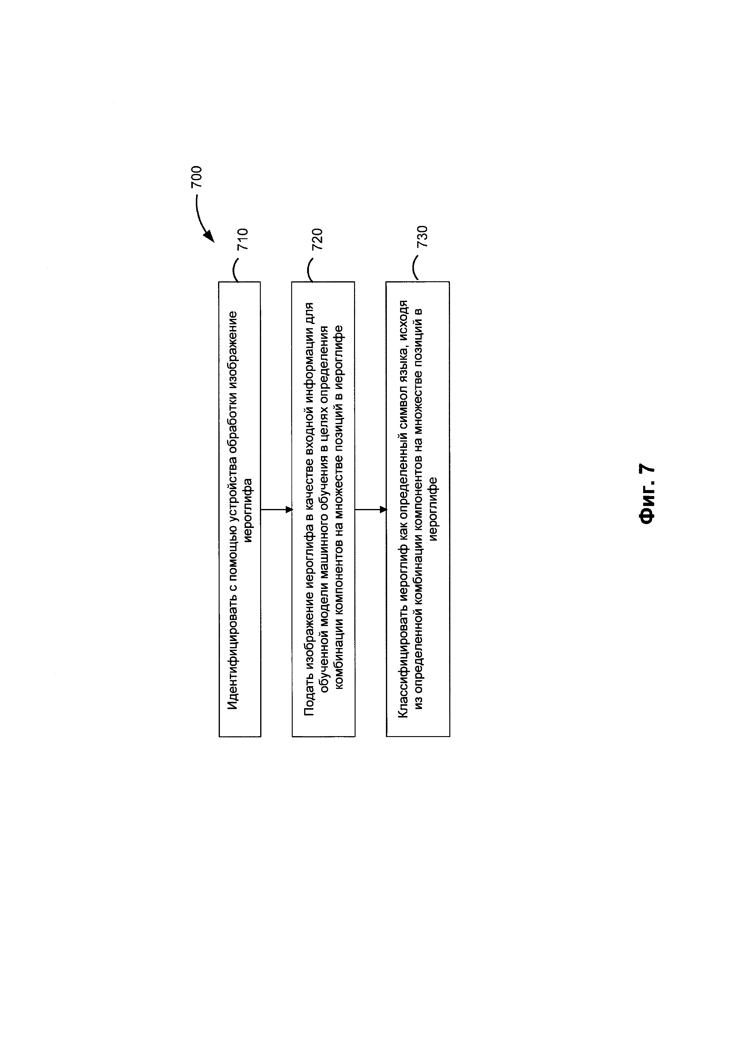 1. Способ распознавания иероглифов, включающий: получение изображения иероглифа устройством обработки; подачу изображения иероглифа в качестве входной информации для обученной модели машинного обучения для определения комбинации компонентов на множестве позиций в иероглифе; и классификацию иероглифа как определенного символа языка, исходя из определенной комбинации компонентов на множестве позиций в изображении. 2. Способ по п. 1, отличающийся тем, что модель машинного обучения включает множество моделей машинного обучения, указанное множество моделей машинного обучения включает соответствующую модель машинного обучения для каждой позиции из множества позиций для определения наличия компонента в каждой позиции. 3. Способ по п. 1, включающий перед подачей изображения иероглифа в качестве входной информации для модели машинного обучения обучение модели машинного обучения для определения комбинации компонентов на множестве позиций в иероглифе и отличающийся тем, что обучение модели машинного обучения включает: предоставление модели машинного обучения первой части примеров изображений иероглифов в качестве исходных данных; и вычисление первого коэффициента ошибки для выходных данных модели машинного обучения для первой части примеров изображений иероглифов. 4. Способ по п. 3, отличающийся тем, что обучение модели машинного обучения дополнительно включает: в ответ на обнаружение того, что первый коэффициент ошибки меньше порогового значения, объявление модели машинного обучения обученной; или в ответ на обнаружение того, что первый коэффициент ошибки больше или равен пороговому значению: объявление модели машинного обучения необученной; и подстройку весов модели машинного обучения. 5. Способ по п. 4, отличающийся тем, что обучение модели машинного обучения дополнительно включает: в ответ на объявление модели машинного обучения обученной использование в качестве входных данных модели машинного обучения второй части примеров изображений иероглифов, отличающийся тем, что вторая часть примеров изображений иероглифов является неразмеченной и не была ранее обработана моделью машинного обучения; вычисление второго коэффициента ошибки для выходных данных модели машинного обучения для второй части примеров изображений иероглифов; и в ответ на обнаружение того, что второй коэффициент ошибки меньше порогового значения, объявление модели машинного обучения обученной; или в ответ на обнаружение того, что второй коэффициент ошибки больше или равен пороговому значению: объявление модели машинного обучения необученной; и подстройку весов модели машинного обучения. 6. Способ по п. 3, отличающийся тем, что обучение модели машинного обучения также включает связывание кода Unicode с иероглифом. 7. Способ по п. 1, отличающийся тем, что классификация иероглифа как определенного символа языка, которая основывается на определенной комбинации компонентов на множестве позиций в иероглифе, дополнительно включает: в ответ на обнаружение того, что комбинация компонентов на множестве позиций соответствует множеству иероглифов, создание каждой комбинации компонентов в каждой из множества позиций для множества иероглифов; вычисление для каждой из комбинаций произведения значений вероятности компонентов в векторах вероятност