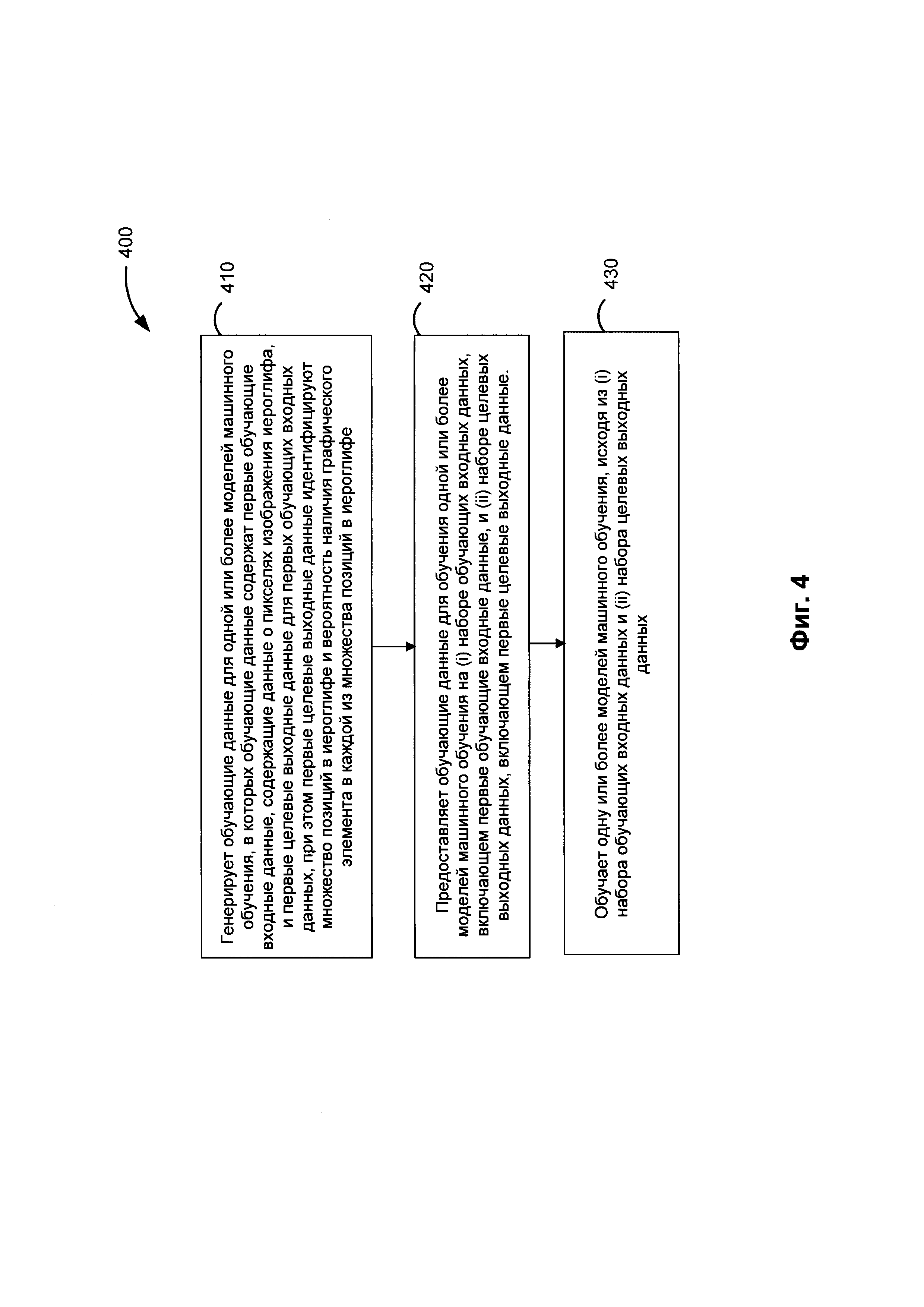 ОБЛАСТЬ ИЗОБРЕТЕНИЯ [001] Настоящее изобретение в общем относится к вычислительным системам, а в частности - к системам и способам распознавания символов с использованием искусственного интеллекта. УРОВЕНЬ ТЕХНИКИ [002] Средства оптического распознавания символов (OCR) могут варьироваться в зависимости от рассматриваемого языка. Например, распознавание символов в тексте, написанном на азиатских языках (Chinese, Japanese, Korean (CJK)), ставит задачи, отличающиеся от задач распознавания текста, написанного на европейских языках. Базовым изображением в CJK языках является иероглиф (т.е. стилизованное изображение символа, фразы, слова, буквы, слога, звука и т.д.). Вместе взятые CJK языки могут содержать более пятидесяти тысяч графически уникальных иероглифов. Таким образом, при применении некоторых способов для распознавания пятидесяти тысяч иероглифов с помощью искусственного интеллекта в CJK языках могут потребоваться сотни миллионов примеров изображений иероглифов. Сбор массива высококачественных изображений иероглифов - задача неэффективная и сложно реализуемая. РАСКРЫТИЕ ИЗОБРЕТЕНИЯ [003] В одном варианте реализации способ включает идентификацию изображения иероглифа устройством обработки, подачу изображения иероглифа в качестве входной информации для обученной модели машинного обучения в целях определения комбинации компонентов на множестве позиций в иероглифе и классификацию иероглифа как определенного символа языка, исходя из определенной комбинации компонентов на множестве позиций в иероглифе. [004] В другом варианте реализации способ обучения одной или более моделей машинного обучения для определения наличия или отсутствия графических элементов в иероглифе включает генерацию обучающих данных для одной или более моделей машинного обучения. Обучающие данные содержат первые обучающие входные данные, включая данные о пикселях изображения иероглифа, и первые целевые выходные данные для первых обучающих входных данных. Первые целевые выходные данные идентифицируют множество позиций в иероглифе и вероятность наличия графического элемента в каждой из множества позиций в иероглифе. Способ также включает предоставление обучающих данных для обучения одной или более моделей машинного обучения на (i) выборке обучающих входных данных, содержащей первые обучающие входные данные, и (ii) выборке целевых выходных данных, содержащей первые целевые выходные данные. КРАТКОЕ ОПИСАНИЕ ЧЕРТЕЖЕЙ [005] Для более полного понимания настоящего изобретения ниже приводится подробное описание, в котором для примера, а не с целью ограничения, оно иллюстрируется со ссылкой на чертежи, на которых: [006] На Фиг. 1 изображена схема компонентов верхнего уровня для примера архитектуры системы в соответствии с одним или более вариантами реализации настоящего изобретения. [007] На Фиг. 2А изображен пример графического элемента в соответствии с одним или более вариантами реализации настоящего изобретения. [008] На Фиг. 2В изображен пример иероглифа, содержащего графический элемент с Фиг. 2А, в соответствии с одним или более вариантами реализации настоящего изобретения. [009] На Фиг. 3А изображен пример трех графических элементов, соответствующих буквам, в соответствии с одним или более вариантами реализации настоящего изобретения. [0010] На Фиг. 3В изображен пример з