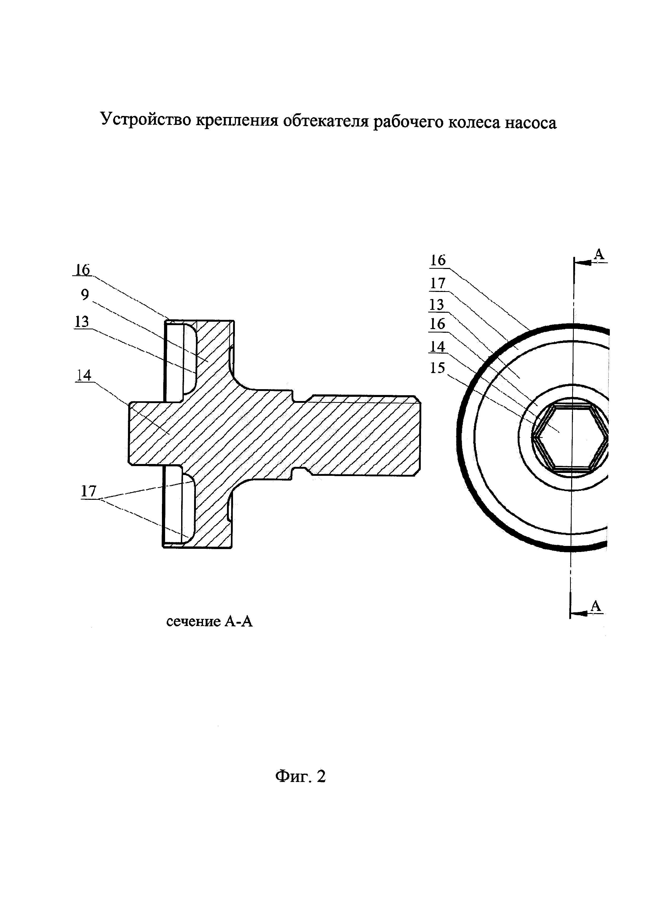 1. Устройство крепления рабочего колеса насоса, содержащее обтекатель, выполненный с фиксирующим кольцевым выступом для сопряжения с ответной поверхностью рабочего колеса, крепежный болт с резьбой для закрепления обтекателя соосно на рабочем колесе, отличающееся тем, что во внутренней центральной полости обтекателя выполнен стакан, обращенный донной частью к рабочему колесу, донная часть стакана снабжена центральным отверстием для размещения резьбовой части крепежного болта и цилиндрическим упором, взаимодействующим с опорной поверхностью головки крепежного болта, которая выполнена с кольцевой торцевой проточкой и галтельным переходом между ней и цилиндрической поверхностью крепежного болта, внешняя сторона головки крепежного болта выполнена с кольцевой проточкой и выступом, ограненным для взаимодействия с монтажным инструментом в виде ключа, между выступом и кольцевой проточкой выполнен галтельный переход, а обтекатель дополнительно снабжен крышкой. 2. Устройство крепления рабочего колеса насоса по п. 1, отличающееся тем, что в кольцевой донной части стакана выполнены симметрично по кругу сквозные отверстия для центровки и крепления обтекателя к рабочему колесу. 3. Устройство крепления рабочего колеса насоса по п. 1, отличающееся тем, что крепление крышки к обтекателю осуществляется при помощи винтовых соединений с фиксацией от отворачивания кернением. 4. Устройство крепления рабочего колеса насоса по п. 1, отличающееся тем, что в центральной торцевой части головки крепежного болта выполнен выступающий шестигранник для взаимодействия с монтажным инструментом.