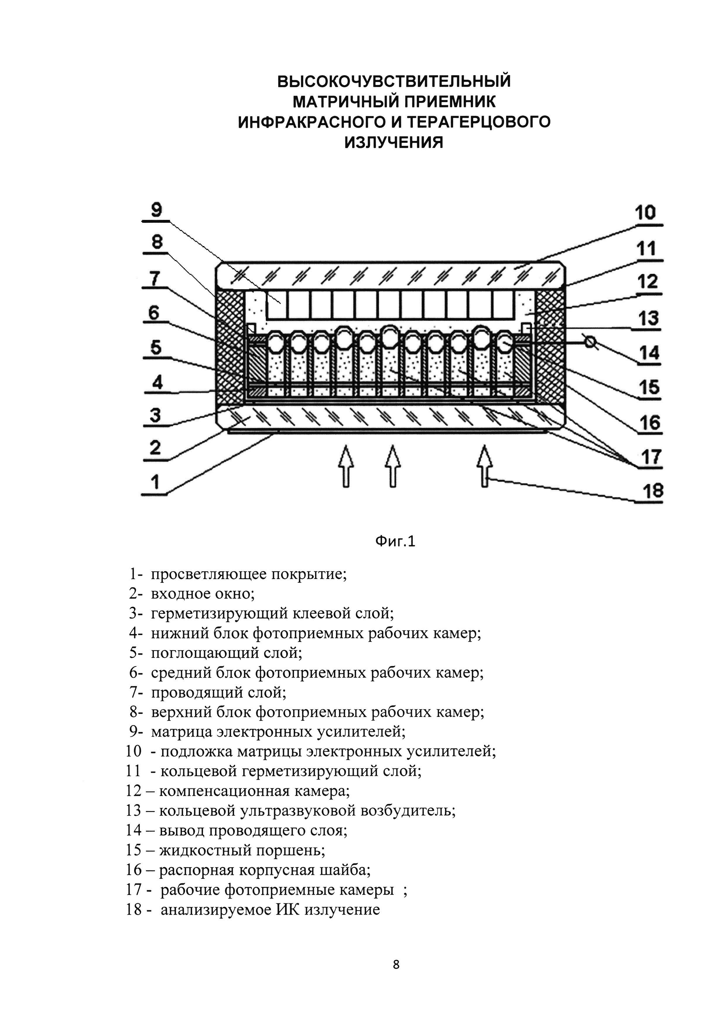 Высокочувствительный матричный приемник инфракрасного и терагерцового излучения, содержащий корпусную шайбу, закрытую с одной стороны входным, прозрачным для ИК излучения, окном, а с противоположной стороны - выходным окном, в которой расположена матрица плотноупакованных трубчатых элементов, содержащих поглощающую металлическую пленку, отличающийся тем, что выходным окном является подложка матрицы интегральных электронных усилителей, матрица трубчатых элементов, служащих газовыми рабочими камерами, выполнена в виде трех блоков из фотоситала, а выход каждой камеры закрыт подвижным жидкостным поршнем, несущим электрический заряд, и согласован с затвором электронного усилителя, металлический поглощающий слой расположен между нижним и средним блоками матрицы, пространство между поверхностями жидкостных поршней и матрицей усилителей образует компенсационную камеру, заполненную подобно матрице газом, в которой по внутреннему периметру шайбы установлен ультразвуковой возбудитель.