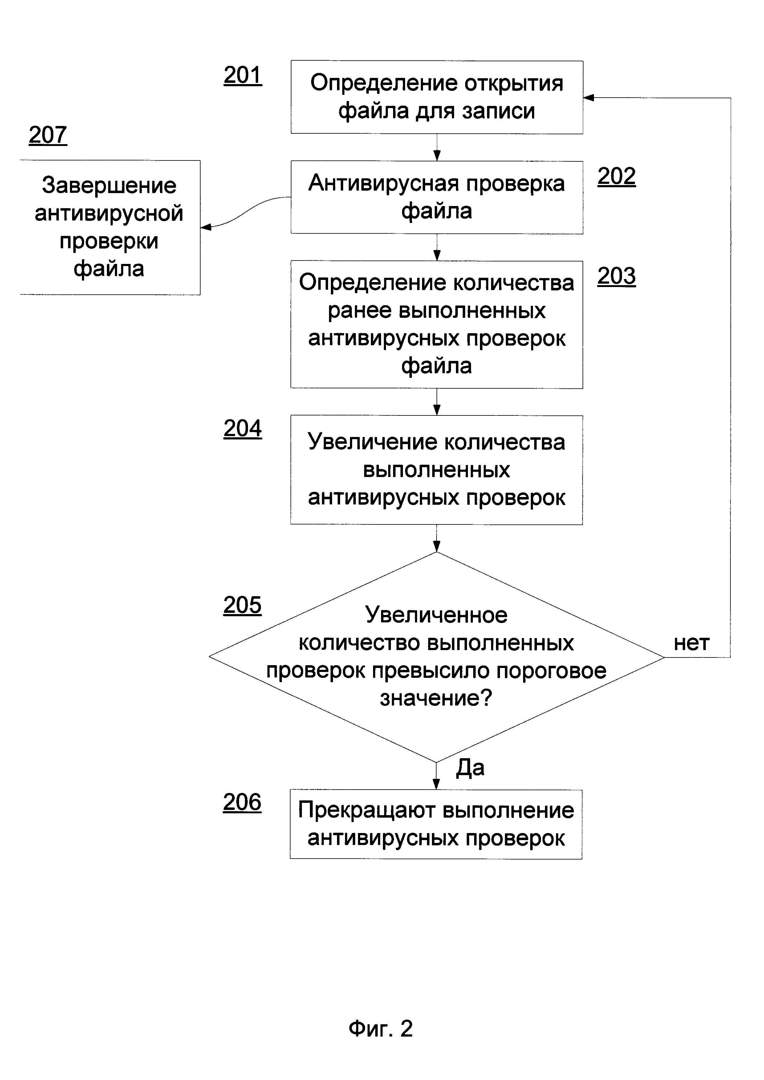 1. Реализуемый компьютером способ прекращения выполнения антивирусных проверок файла в процессе записи упомянутого файла на диск, в котором а) определяют с помощью антивирусного приложения операцию открытия файла приложением пользователя для записи данных; б) выполняют антивирусную проверку упомянутого файла на наличие вредоносного кода после закрытия упомянутого файла; в) определяют при отсутствии вредоносного кода в файле количество ранее выполненных антивирусных проверок упомянутого файла с использованием антивирусной таблицы, при этом упомянутая антивирусная таблица связана с антивирусным приложением и содержит: количество выполненных антивирусных проверок упомянутого файла; пороговое значение, равное максимальному количеству антивирусных проверок упомянутого файла; г) увеличивают количество выполненных антивирусных проверок на единицу в антивирусной таблице для упомянутого файла; д) выполняют этапы а) - г) до тех пор, пока увеличенное количество выполненных антивирусных проверок не превысит упомянутое пороговое значение; е) когда увеличенное количество выполненных антивирусных проверок превысило упомянутое пороговое значение, прекращают выполнение антивирусных проверок файла. 2. Способ по п. 1, в котором на шаге в) в зависимости от выполненной антивирусной проверки файла и количества ранее выполненных антивирусных проверок файла задают уровень антивирусной проверки, при этом упомянутый уровень антивирусной проверки определяет используемые методы обнаружения вредоносного кода при проведении антивирусной проверки, при этом упомянутые методы обнаружения включают по меньшей мере один из методов: сигнатурный анализ; эвристический анализ; эмуляцию; анализ с использованием облачного сервиса. 3. Способ по п. 2, в котором сохраняют уровень антивирусной проверки в антивирусную таблицу. 4. Способ по п. 3, в котором уровень антивирусной проверки изменяют в зависимости от уровня по меньшей мере одной выполненной антивирусной проверки. 5. Способ по п. 1, в котором для упомянутого файла антивирусная таблица дополнительно содержит размер упомянутого файла после каждой выполненной антивирусной проверки. 6. Способ по п. 5, в котором дополнительно изменяют пороговое значение в зависимости от изменения размера файла между двумя последовательными антивирусными проверками. 7. Способ по п. 5, в котором пороговое значение обратно пропорционально изменению в размере файла между двумя последовательными антивирусными проверками. 8. Способ по п. 1, в котором на шаге б) выполняют асинхронную антивирусную проверку файла. 9. Способ по п. 1, в котором на шаге б) выполняют синхронную антивирусную проверку файла; после окончания проведения антивирусной проверки файла передают управление приложению.