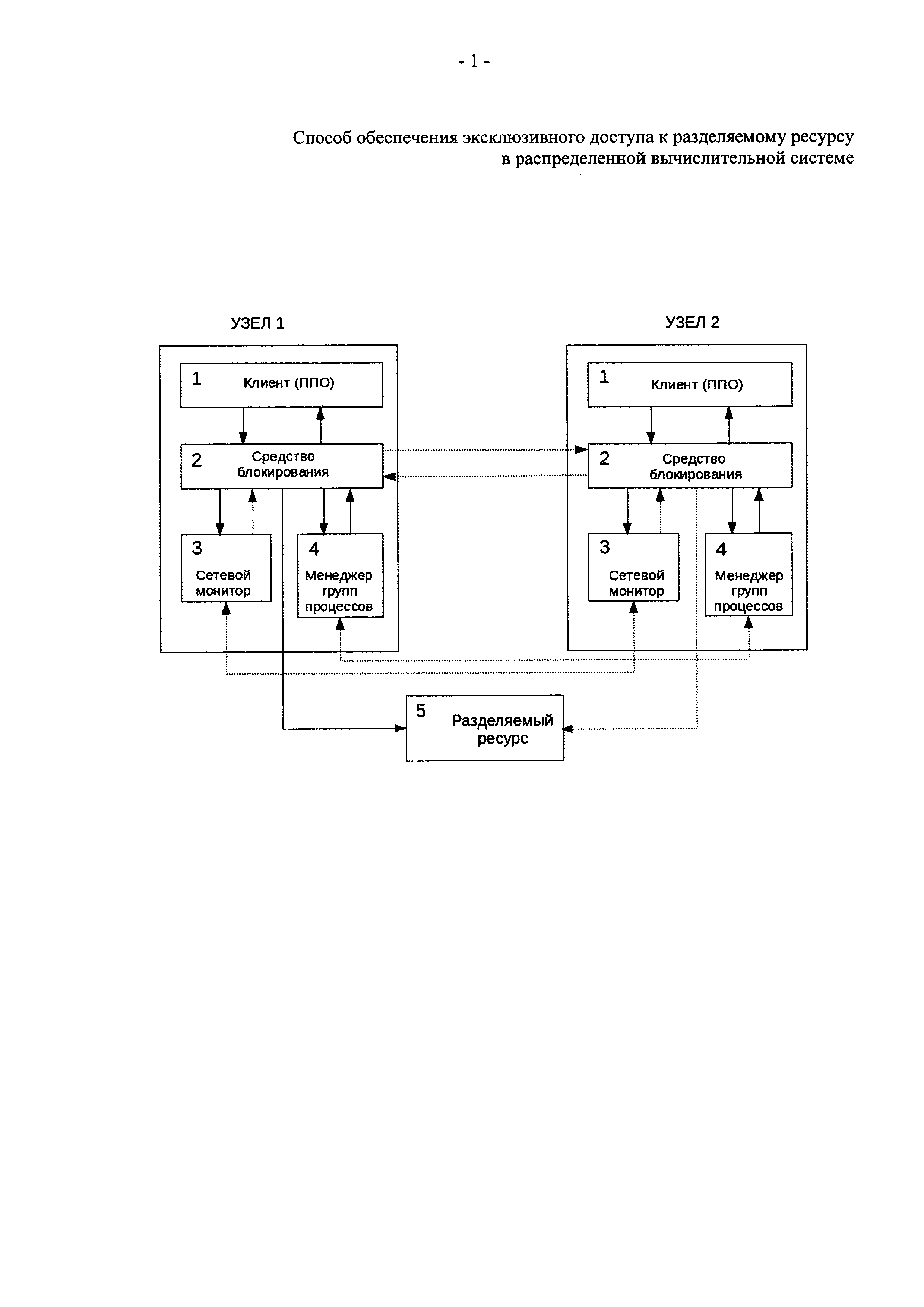 Способ обеспечения доступа к разделяемому ресурсу в распределенной вычислительной системе, причем система содержит по крайней мере два узла, соединенных между собой посредством цифровой сети передачи данных; разделяемый ресурс; прикладное программно-аппаратное обеспечение, используемое на каждом узле и формирующее по крайней мере один программный процесс (процесс-клиент), в ходе работы которого может потребоваться доступ к разделяемому ресурсу; средство мониторинга (СМ) состояния процессов в системе, расположенное на каждом узле и выполненное с возможностью информировать процессы в системе об отказе какого-либо процесса посредством отправки сообщения; средство организации списка процессов-участников какой-либо группы процессов (менеджер групп процессов, МГП), расположенное на каждом узле, связанное с СМ и выполненное с возможностью формировать актуальный список процессов-участников группы, отвечать на внешние запросы о текущем составе группы; средство формирования уникальных для системы идентификаторов процессов, расположенное на каждом узле; средство блокирования (СБ) доступа к разделяемому ресурсу, расположенное на каждом узле, связанное с МГП и СМ и выполненное с возможностью разрешать или блокировать доступ к разделяемому ресурсу, формировать и посылать сообщения процессу-клиенту и другим СБ; причем прикладное программно-аппаратное обеспечение выполнено с возможностью формировать запрос на получение доступа к разделяемому ресурсу в СБ, останавливать действия процесса-клиента, связанные с доступом к разделяемому ресурсу, до получения ответа от СБ; способ, заключающийся в том, что если узел впервые обращается за доступом к разделяемому ресурсу и/или узел восстанавливается после временного прекращения работоспособности, то выполняют следующие действия: назначают уникальный идентификатор для каждого активного процесса в системе с учетом возможности сравнения идентификаторов через отношение "меньше - больше"; при необходимости получения доступа к разделяемому ресурсу посылают запрос от процесса-клиента к СБ, причем процесс-клиент остается заблокированным до тех пор, пока СБ не даст процессу-клиенту разрешение на доступ к разделяемому ресурсу; при необходимости освободить полученный ранее доступ к разделяемому ресурсу посылают запрос от процесса-клиента к СБ на освобождение доступа к разделяемому ресурсу, причем процесс-клиент остается заблокированным до тех пор, пока СБ не выполнит действия, связанные с освобождением доступа к разделяемому ресурсу; формируют в СБ список процессов-претендентов на доступ к разделяемому ресурсу, изначально пустой; формируют в СБ список ожидания доступа к разделяемому ресурсу, изначально пустой; формируют в СБ список отложенных запросов на доступ к разделяемому ресурсу, изначально пустой; обнуляют в СБ значение N счетчика собственных запросов; обнуляют в СБ значение М счетчика входящих запросов; иначе переходят к этапу А; (А) при необходимости получения доступа к разделяемому ресурсу посылают запрос на получение доступа к разделяемому ресурсу от процесса-клиента в СБ; посылают запрос из СБ в МГП на добавление идентификатора процесса СБ в группу процессов-претендентов на доступ к разделяемому ресурсу; дожидаются ответа в СБ на запрос в МГП о добавление идентиф
