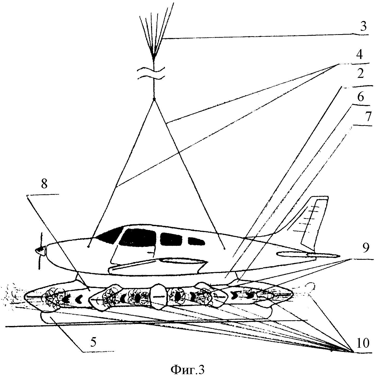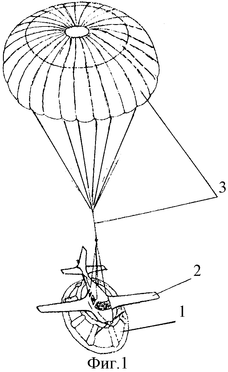 1. Быстродействующая система амортизации для аварийного приземления летательного аппарата, преимущественно оснащенного быстродействующей парашютной системой, содержащая, по меньшей мере, один источник газа и оболочку с надуваемым элементом, одно из оснований которой прикреплено к нижней части фюзеляжа летательного аппарата, отличающаяся тем, что оболочка с надуваемым элементом выполнена в виде основного надувного устройства, представляющего собой замкнутый пневмокаркасный амортизирующий контур, связанный с источником газа и состоящий из нижнего и верхнего надувных торообразных оснований, связанных между собой надувными спицами, и дополнительного демпфирующего элемента, представляющего собой свободно наполняемую оболочку, связанную и размещенную между указанными выше торообразными основаниями и спицами, а на внешней боковой поверхности оболочки демпфирующего элемента выполнены перепускные отверстия, при этом верхнее основание пневмокаркасного амортизирующего контура выполнено меньшего диаметра, чем нижнее основание, и прикреплено к нижней части фюзеляжа летательного аппарата преимущественно в районе его центра тяжести. 2. Система по п.1, отличающаяся тем, что источник газа для основного надувного устройства выполнен в виде активируемой автоматически или вручную системы газонаполнения с одним или несколькими воздушными эжекторами. 3. Система по п.2, отличающаяся тем, что воздушные эжекторы системы газонаполнения размещены в полостях верхнего и нижнего оснований и/или стоек замкнутого пневмокаркасного амортизирующего контура, выполненного однообъемным или многосекционным. 4. Система по п.1, отличающаяся тем, что дополнительный свободно наполняемый демпфирующий элемент выполнен однообъемным или многосекционным с полостями, образованными сплошными мягкими радиально расположенными вертикальными перегородками. 5. Система по п.4, отличающаяся тем, что полости, образованные горизонтальными и вертикальными мягкими перегородками, выполнены в виде сот и имеют перепускные отверстия. 6. Система по п.4, отличающаяся тем, что дополнительный демпфирующий элемент в виде замкнутой оболочки, размещенной внутри пневмокаркасного амортизирующего контура и связанной с ним, заполняется при помощи сообщающегося с ней пенообразующего механизма быстро затвердевающей или иной пеной. 7. Система по п.1, отличающаяся тем, что верхнее основание пневмокаркасного амортизирующего контура прикреплено к нижней части фюзеляжа летательного аппарата посредством опорного элемента, выполненного по форме обшивки нижнего обвода фюзеляжа для обеспечения равномерного распределения нагрузки в момент приземления.