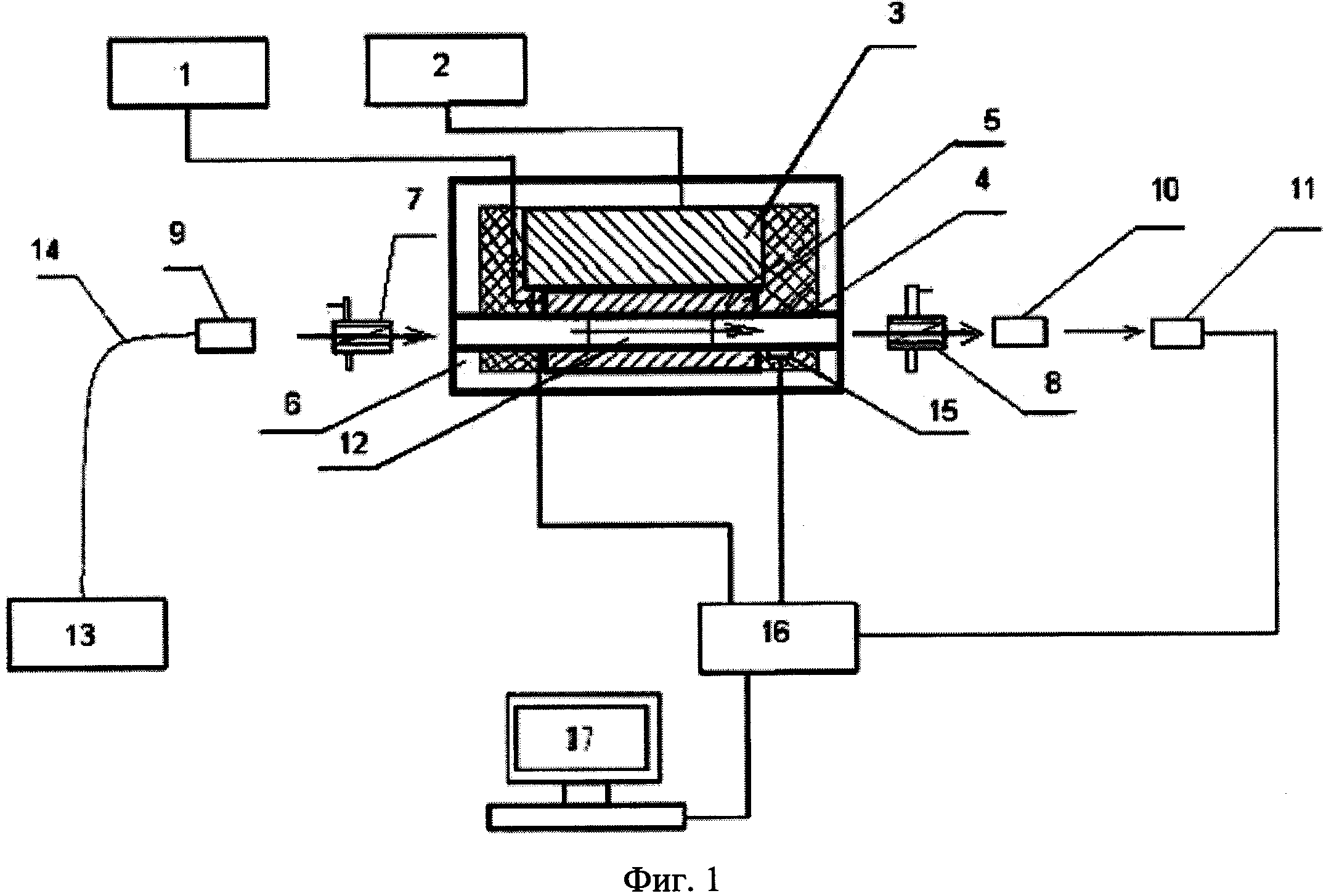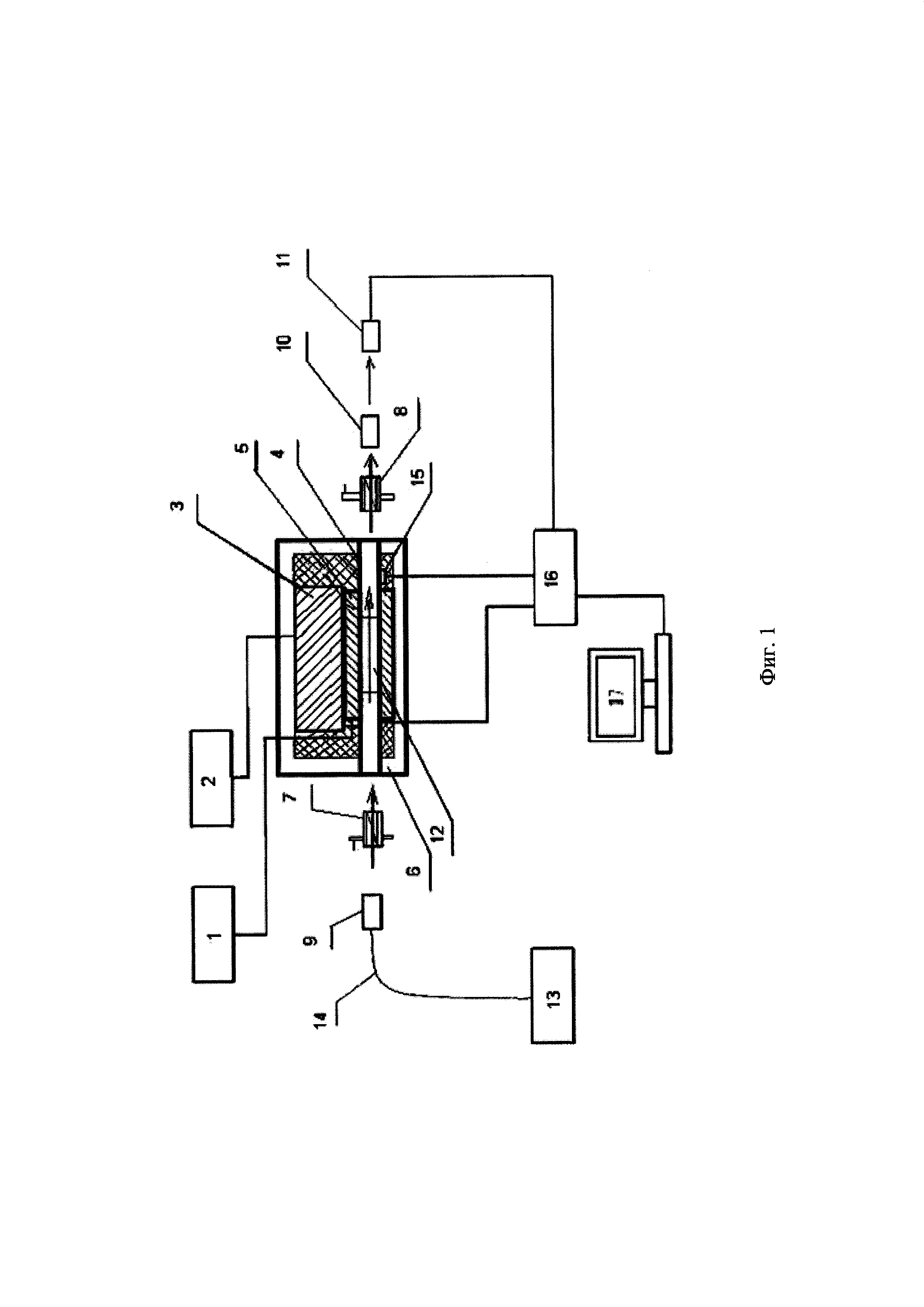 Изобретение относится к устройствам для градуировки бесконтактных датчиков электрического тока и может быть использовано при градуировке и контроле характеристик бесконтактных волоконно-оптических датчиков электрического тока (ВОДТ) на основе кристаллов BSO, в частности, Bi12SiO20, Bi12GeO20. Известен стенд для градуировки волоконно-оптических датчиков электрического тока на основе кристаллов BSO, описанный в статье «Fiber optic current sensors for high current surge measurements» // In Proceedings of the Sensor Conference 2007. - Указанный стенд для градуировки ВОДТ на основе кристаллов BSO содержит конденсатор большой емкости, образцовый шунт, устройство управления разрядом конденсатора через токопровод с шунтом, источник оптического излучения, фотоприемник, устройство синхронизации работы оптической и электроразрядной частей стенда, устройство сравнения и регистрации напряжения с выхода датчика и напряжения на шунте. Стенд для градуировки работает следующим образом. Кристалл BSO датчика размещается рядом с токопроводом таким образом, что силовые линии магнитного поля от протекающего по токопроводу импульсного тока совпадают с осью чувствительности датчика, что обеспечивает максимальную чувствительность датчика. При градуировке датчика разрядный ток конденсатора протекает через мощный токопровод, вокруг которого формируется магнитное поле. Свет постоянной интенсивности направляется по оптическому волокну от источника оптического излучения к датчику на основе оптически активного кристалла BSO. Пройдя через поляризатор, световое излучение приобретает линейную поляризацию. Линейно поляризованное излучение направляется в кристалл BSO, где происходит вращение плоскости поляризации светового луча под действием внешнего (измеряемого) магнитного поля от протекающего импульсного электрического тока в токопроводе и собственного кругового двулучепреломления кристалла. Угол поворота плоскости поляризации светового излучения можно записать как где ΨA - угол поворота вследствие эффекта Фарадея; ΨF - угол поворота вследствие собственного кругового двулучепреломления; V - константа Верде материала; H - приложенное магнитное поле; L - длина кристалла; Θ - собственное круговое двулучепреломление кристалла. После выхода светового излучения из кристалла, оно проходит через анализатор. После анализатора по оптическому волокну световое излучение поступает на фотоприемное устройство. Напряжение с выхода фотоприемного устройства регистрируется и запоминается совместно с величиной напряжения на образцовом шунте с помощью устройства регистрации и запоминания. Калибровка волоконно-оптического датчика BSO производится на основе сравнения сигналов с образцового шунта и с выхода фотоприемного устройства. Недостатком описанного стенда является низкая точность калибровки. Указанное обусловлено необходимостью калибровки на больших по амплитуде импульсных токах (величины которых соответствует рабочим измеряемым токам), отличных от прямоугольной формы, упрощенной схемой измерения с помощью шунта, невозможностью проведения термокомпенсации датчика при его градуировке. Из известных устройств наиболее близким по технической сущности к заявляемому является устройство, описанное в статье «Методика исследования магнитооптического эффекта в кристаллах BSO (Bi12SiO20, Bi12GeO20) для дат