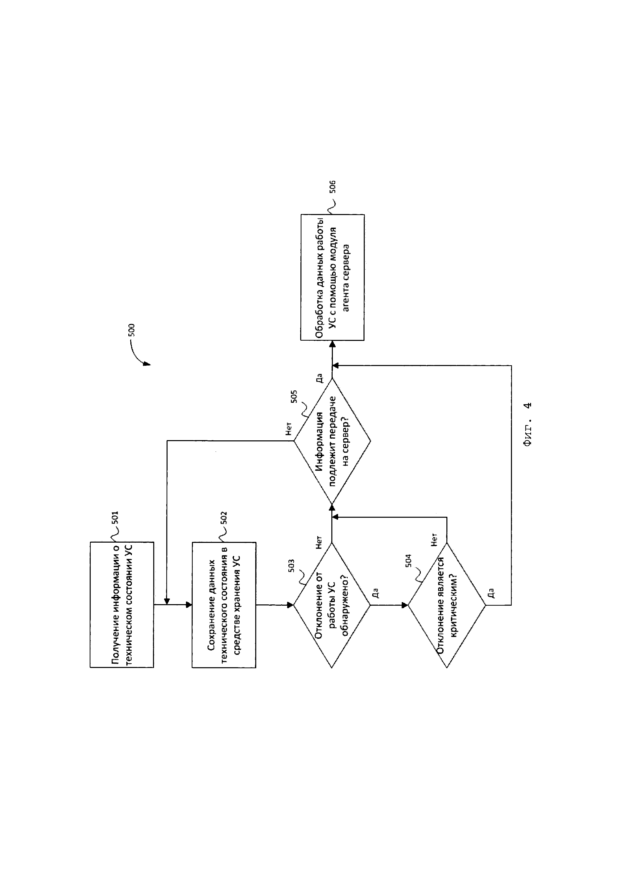 1. Система мониторинга сети устройств самообслуживания (УС), содержащая: по меньшей мере одно УС, связанное с по меньшей мере одним сервером, причем УС содержит по меньшей мере вычислительное устройство, по меньшей мере одно запоминающее устройство и средство сетевой передачи данных, причем по меньшей мере одно запоминающее устройство содержит функционирующие посредством обработки вычислительным устройством: модуль агента, выполненный с возможностью мониторинга и сбора данных о техническом состоянии УС, фиксации наступления критических событий в работе УС и уведомлении сервера о наступлении данных событий, модуль диспетчера, выполненный с возможностью запроса у модуля агента данных о состоянии УС и передачи упомянутых данных на по меньшей мере один сервер с помощью средства сетевой передачи данных; сервер содержит по меньшей мере вычислительное устройство, по меньшей одно запоминающее устройство и средство сетевой передачи данных, причем сервер содержит модуль агента, модуль диспетчера и модуль хранения данных технического состояния УС, причем модуль агента выполнен с возможностью запроса через модуль диспетчера сервера данных о техническом состоянии УС, модуль диспетчера сервера выполнен с возможностью обмена данными с модулем диспетчера УС, и модуль хранения данных о техническом состоянии УС выполнен с возможностью записи получаемой информации о техническом состоянии УС, причем модуль агента сервера также обеспечивает на основании полученных данных технического состояния от УС: - выявление по меньшей мере одного типа данных, соответствующих сбою УС для по меньшей мере одной функции УС; - осуществление классификации полученных данных по типу нарушений функционирования УС; - формировании отчета на основании выполненной классификации по техническому состоянию УС; и - на основании сформированного отчета инициировать процедуру устранения технических нарушений в работе УС, которая включает в себя идентификацию требуемого действия на основании классификации параметров технического состояния УС, при этом упомянутая процедура включает в себя удаленное соединение с УС для устранения программной ошибки и/или формирование заявки на технические работы для обслуживающего персонала. 2. Система по п. 1, характеризующаяся тем, что с помощью модуля агента УС техническое отклонение фиксируется для работы УС и/или его функциональной части. 3. Система по п. 2, характеризующаяся тем, что каждое техническое отклонение работы УС содержит уникальный идентификатор (УИД) и время его фиксации. 4. Система по п. 2, характеризующаяся тем, что с помощью модуля агента УС дополнительно фиксируется работа УС и/или его функциональной части на каждом стейте осуществления процедуры транзакции. 5. Система по п. 1, характеризующаяся тем, что с помощью модуля агента УС для каждого технического сбоя в работе УС фиксируется цепочка событий технического состояния работы УС, предшествующего данному событию. 6. Система по п. 4, характеризующаяся тем, что также фиксируют данные пользователя УС в момент выполнения транзакции. 7. Система по п. 6, характеризующаяся тем, что данные пользователя УС дополнительно включают в себя фотоизображение пользователя и/или видеозапись пользователя. 8. Система по п. 1, характеризующаяся тем, что модуль агента сервер