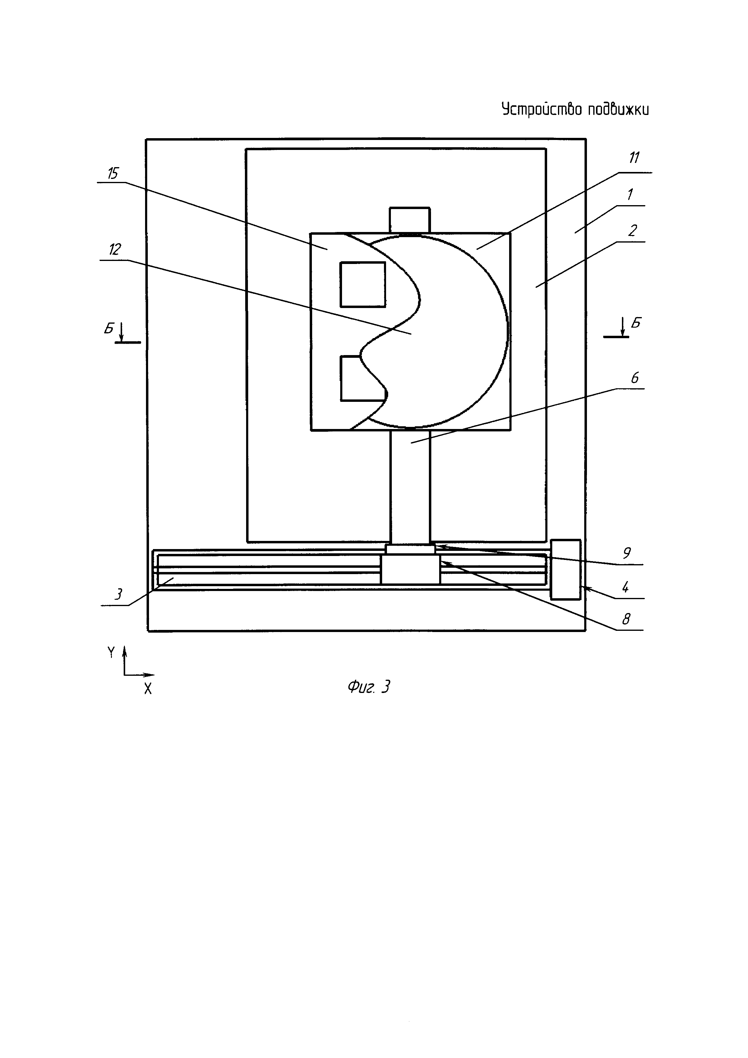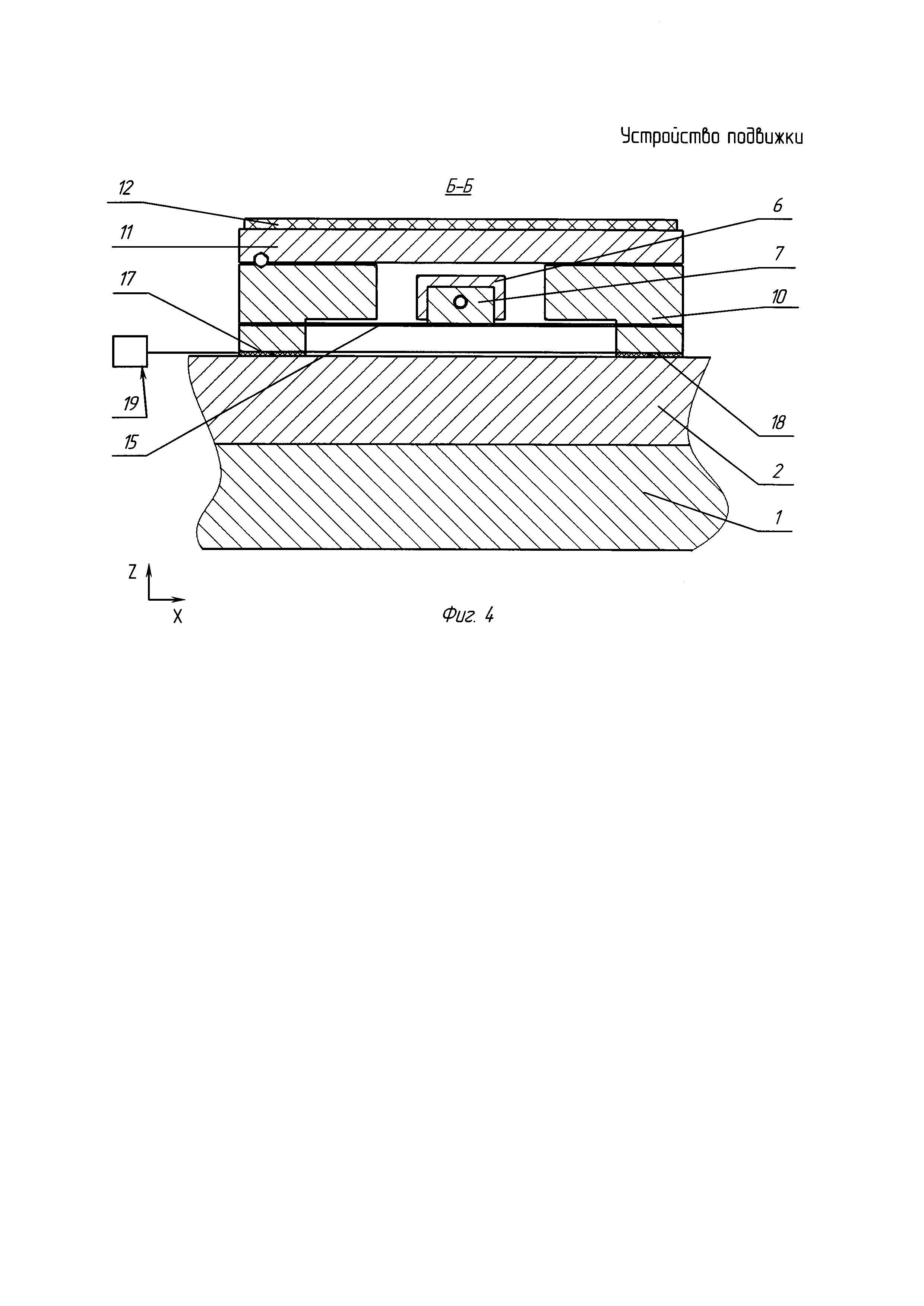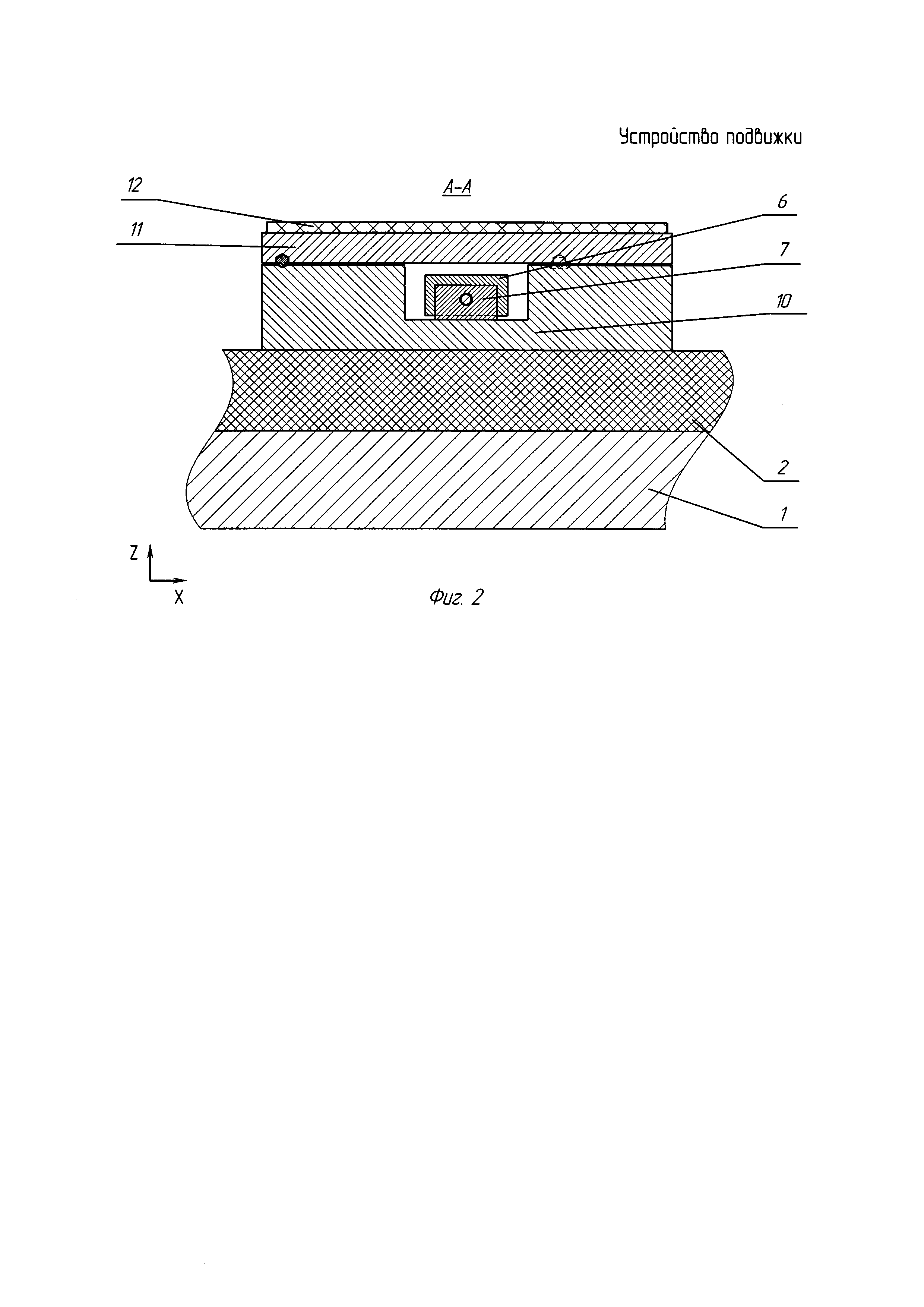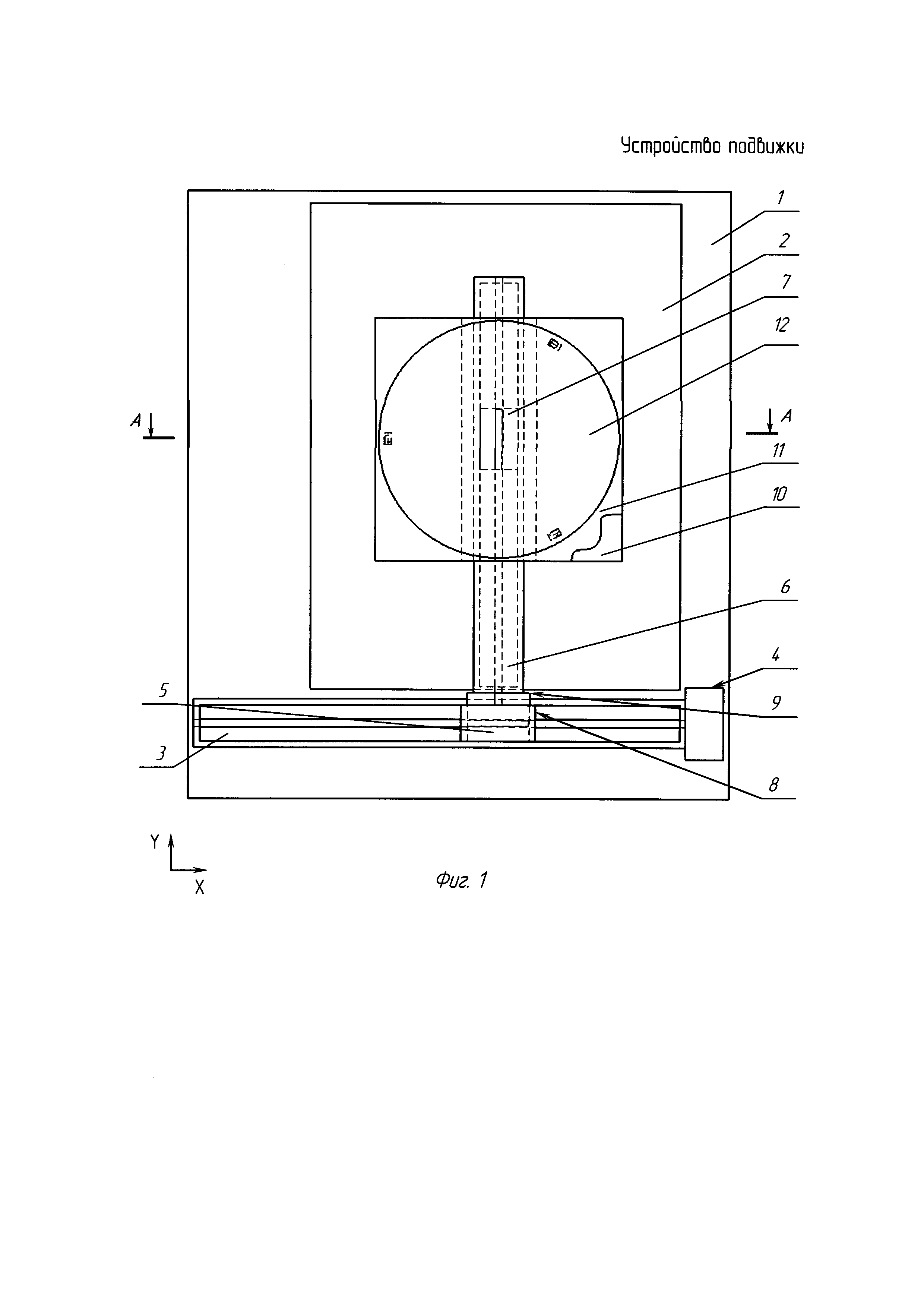 Устройство подвижки относится к точной механике и может быть использовано для перемещения образцов по двум или трем координатам, например, в зондовой микроскопии. Известно устройство подвижки, включающее в себя основание, на котором установлен базовый элемент, также установлен первый передаточный элемент с первым приводом по координате X и первым подвижным элементом, сопряженный со вторым передаточным элементом, на котором расположен второй подвижный элемент и второй привод по координате Y, посредством переходного элемента, включающее также каретку, расположенную на базовом элементе с возможностью перемещения по координатам X, Y, и держатель образца, сопряженный с кареткой [Патент RU 2306621]. Это устройство выбрано в качестве прототипа предложенного решения. Недостаток этого устройства заключается в том, что в нем отсутствует кинематическая развязка каретки и основания по координате Z. Это снижает точностные характеристики устройства и его функциональные возможности. Технический результат изобретения заключается в повышении точностных характеристик устройства и расширении его функциональных возможностей. Указанный технический результат достигается тем, что в устройстве, включающем в себя основание, на котором установлен базовый элемент, также установлен первый передаточный элемент с первым приводом по координате X и первым подвижным элементом, сопряженный со вторым передаточным элементом, на котором расположен второй подвижный элемент и второй привод по координате Y, посредством переходного элемента, включающее также каретку, расположенную на базовом элементе с возможностью перемещения по координатам X, Y, и держатель образца, сопряженный с кареткой, каретка упруго сопряжена с переходным элементом. Существует вариант, в котором упругое сопряжение каретки и переходного элемента осуществлено посредством второго передаточного элемента. Существует вариант, в котором упругое сопряжение каретки и переходного элемента осуществляется посредством плоской пружины. Существует вариант, в котором упругое сопряжение каретки и переходного элемента выполнено в виде плоской перфорированной пружины. Существует вариант, в котором переходной элемент выполнен в виде рельсовой направляющей. Существует вариант, в котором переходной элемент выполнен в виде плоской пружины. Существует вариант, в котором каретка установлена на базовом элементе посредством первого промежуточного элемента и второго промежуточного элемента, подключенных к модулю контроля давления и обеспечивающих вакуумный прижим. Существует вариант, в котором каретка установлена на базовом элементе посредством первого промежуточного элемента и второго промежуточного элемента, подключенных к модулю контроля давления и обеспечивающих аэростатический эффект. Существует вариант, в котором каретка установлена на базовом элемент посредством трех приводов по координате Z. Существует вариант, в котором первый привод включает первый переходной элемент, сопряженный со вторым переходным элементом и третьим переходным элементом, включает также первый двигатель и второй двигатель, при этом первый переходной элемент соединен с первым подвижным элементом, второй переходной элемент соединен с первым двигателем с возможностью отсоединения от него, третий пер