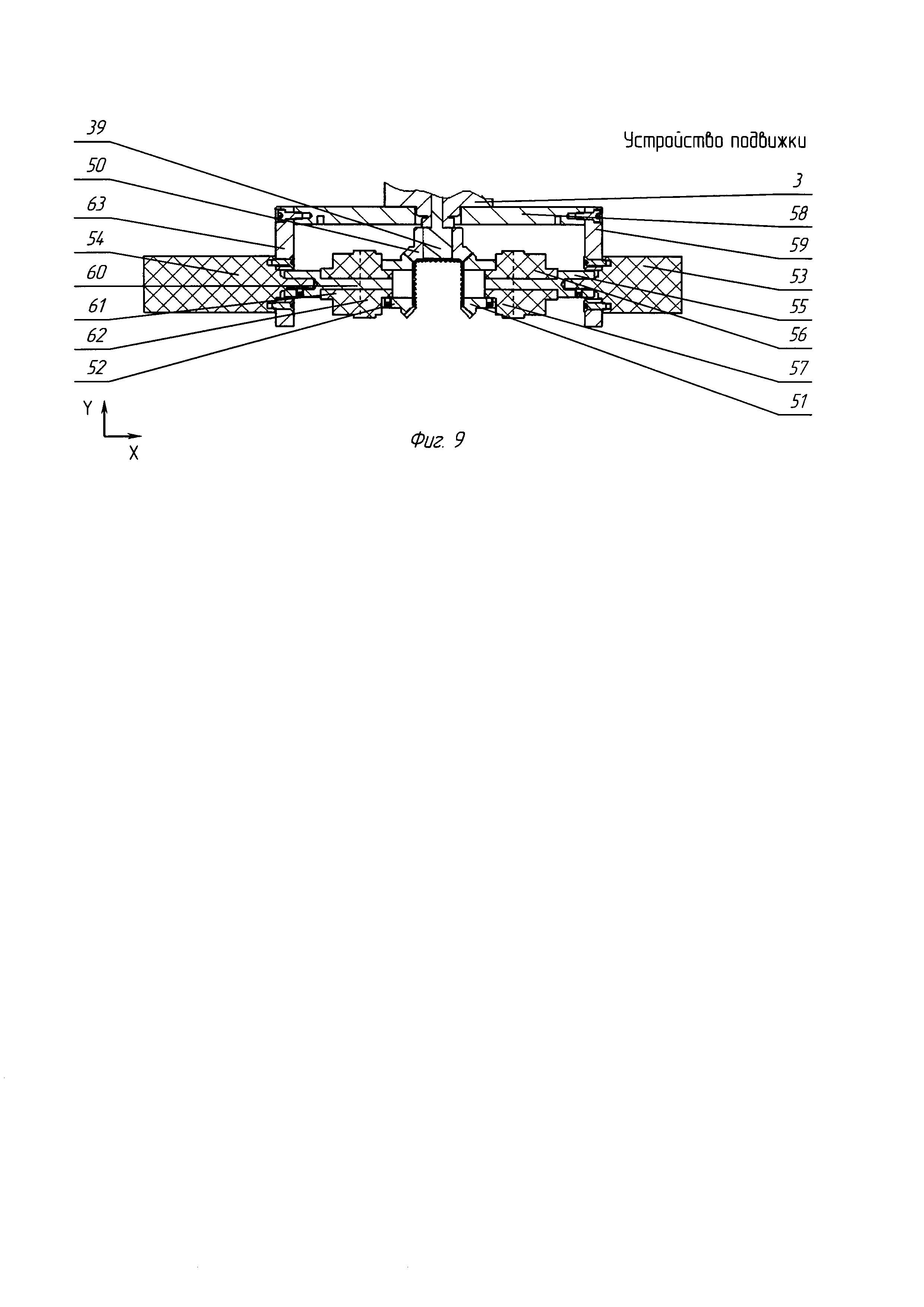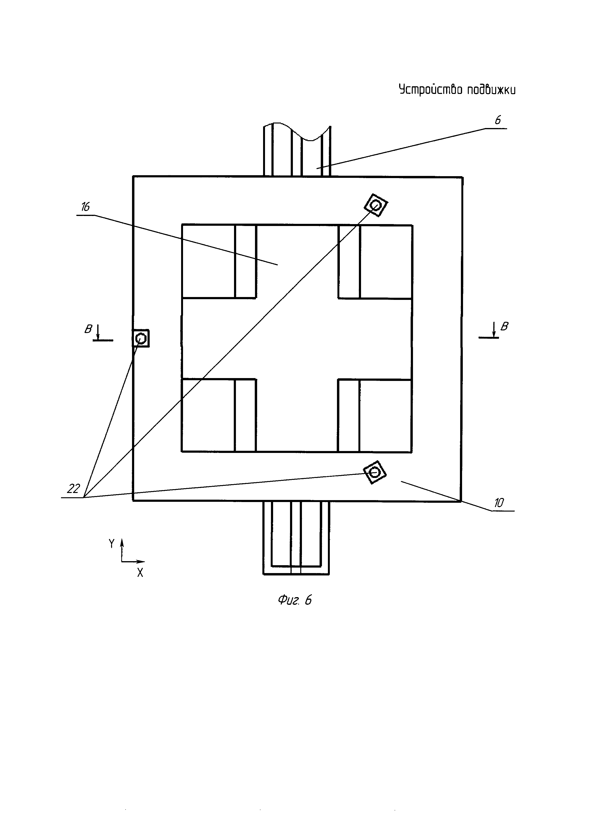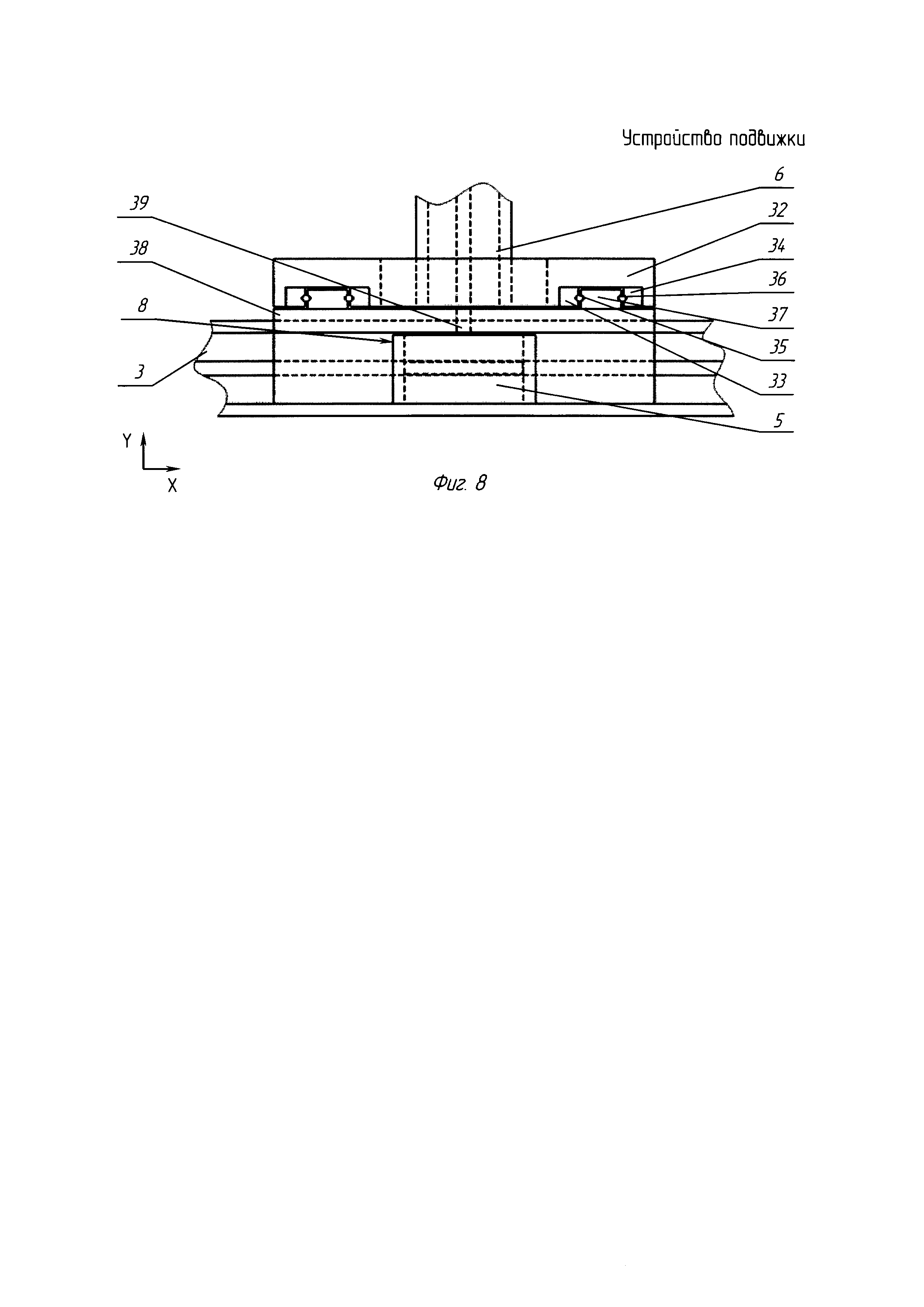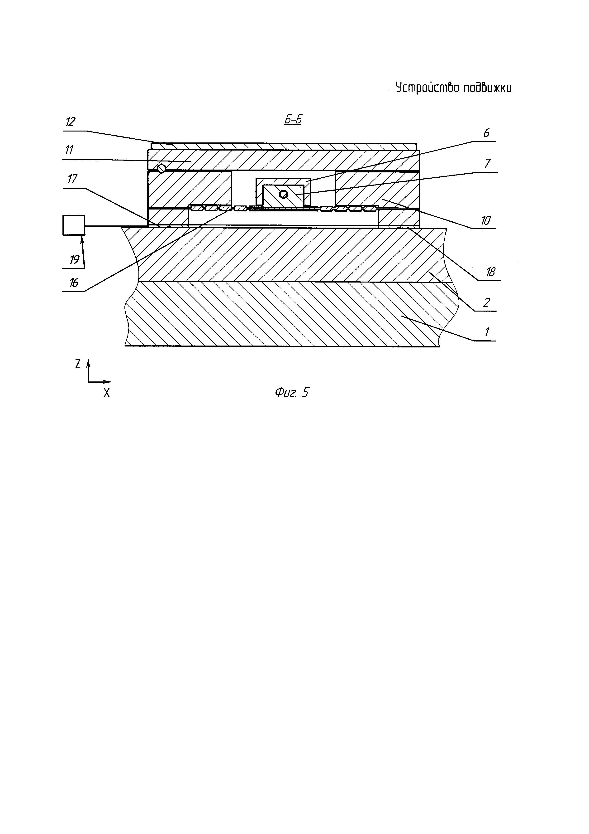 Устройство подвижки относится к точной механике и может быть использовано для перемещения образцов по двум или трем координатам, например, в зондовой микроскопии. Известно устройство подвижки, включающее в себя основание, на котором установлен базовый элемент, также установлен первый передаточный элемент с первым приводом по координате X и первым подвижным элементом, сопряженный со вторым передаточным элементом, на котором расположен второй подвижный элемент и второй привод по координате Y, посредством переходного элемента, включающее также каретку, расположенную на базовом элементе с возможностью перемещения по координатам X, Y, и держатель образца, сопряженный с кареткой [Патент RU 2306621]. Это устройство выбрано в качестве прототипа предложенного решения. Недостаток этого устройства заключается в том, что в нем отсутствует кинематическая развязка каретки и основания по координате Z. Это снижает точностные характеристики устройства и его функциональные возможности. Технический результат изобретения заключается в повышении точностных характеристик устройства и расширении его функциональных возможностей. Указанный технический результат достигается тем, что в устройстве, включающем в себя основание, на котором установлен базовый элемент, также установлен первый передаточный элемент с первым приводом по координате X и первым подвижным элементом, сопряженный со вторым передаточным элементом, на котором расположен второй подвижный элемент и второй привод по координате Y, посредством переходного элемента, включающее также каретку, расположенную на базовом элементе с возможностью перемещения по координатам X, Y, и держатель образца, сопряженный с кареткой, каретка упруго сопряжена с переходным элементом. Существует вариант, в котором упругое сопряжение каретки и переходного элемента осуществлено посредством второго передаточного элемента. Существует вариант, в котором упругое сопряжение каретки и переходного элемента осуществляется посредством плоской пружины. Существует вариант, в котором упругое сопряжение каретки и переходного элемента выполнено в виде плоской перфорированной пружины. Существует вариант, в котором переходной элемент выполнен в виде рельсовой направляющей. Существует вариант, в котором переходной элемент выполнен в виде плоской пружины. Существует вариант, в котором каретка установлена на базовом элементе посредством первого промежуточного элемента и второго промежуточного элемента, подключенных к модулю контроля давления и обеспечивающих вакуумный прижим. Существует вариант, в котором каретка установлена на базовом элементе посредством первого промежуточного элемента и второго промежуточного элемента, подключенных к модулю контроля давления и обеспечивающих аэростатический эффект. Существует вариант, в котором каретка установлена на базовом элемент посредством трех приводов по координате Z. Существует вариант, в котором первый привод включает первый переходной элемент, сопряженный со вторым переходным элементом и третьим переходным элементом, включает также первый двигатель и второй двигатель, при этом первый переходной элемент соединен с первым подвижным элементом, второй переходной элемент соединен с первым двигателем с возможностью отсоединения от него, третий пер
