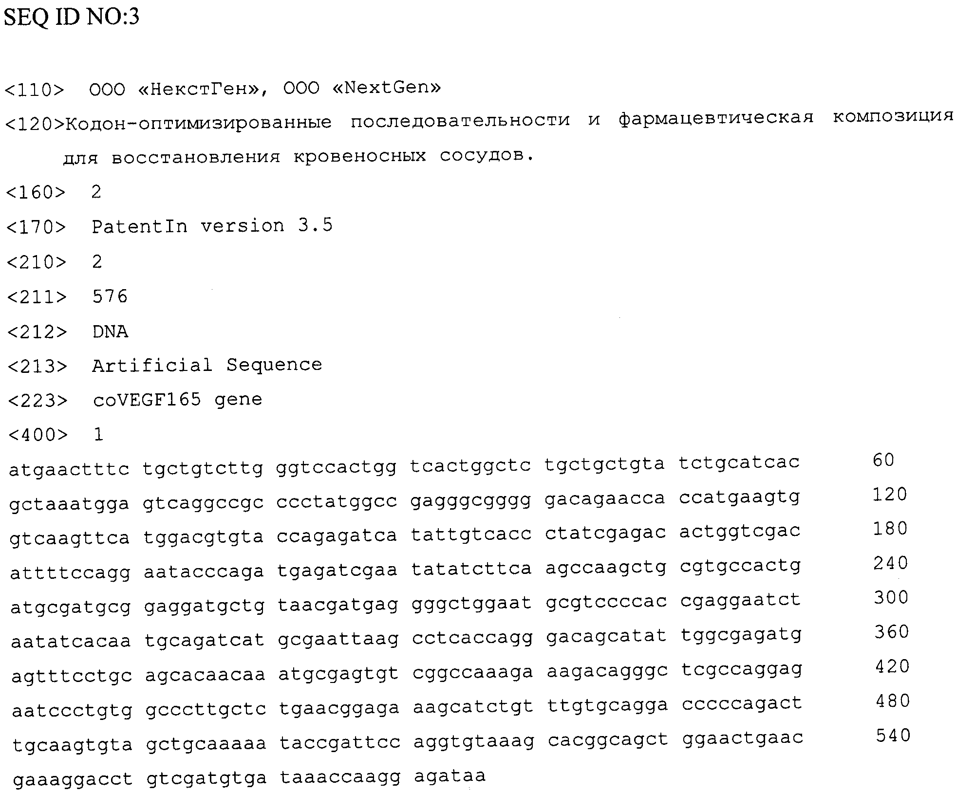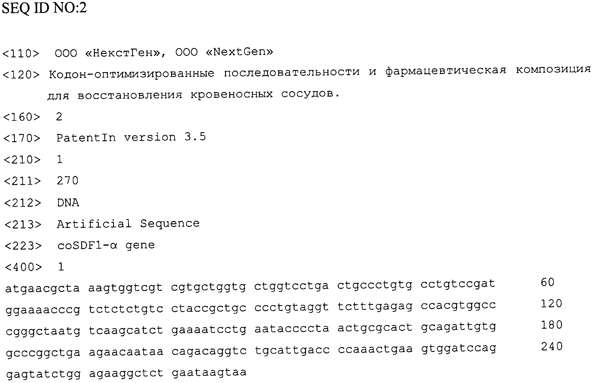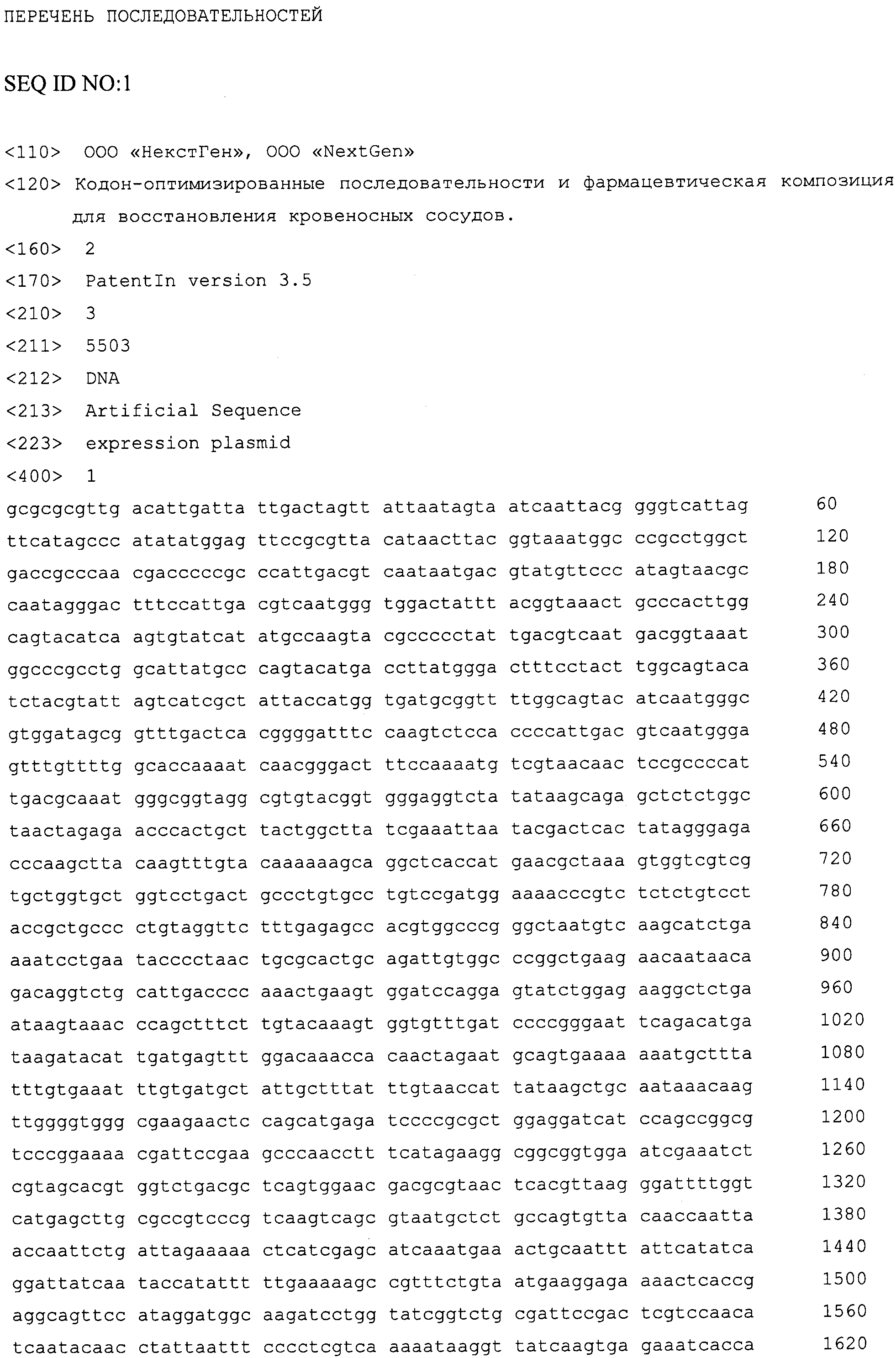 Изобретение относится к области биохимии, в частности к кодон-оптимизированным последовательностям ДНК. Заявлены кодон-оптимизированные кДНК, кодирующие фактор стромальных клеток 1 альфа и сосудистый эндотелиальный фактор роста изоформы 165, а также содержащая их рекомбинантная плазмида. Рекомбинантную плазмиду можно использовать в составе фармацевтической композиции для восстановления кровеносных сосудов и улучшения кровоснабжения в поврежденных тканях или органах. Изобретение позволяет повысить эффективность использования генных препаратов. 4 н.п. ф-лы, 5 ил.