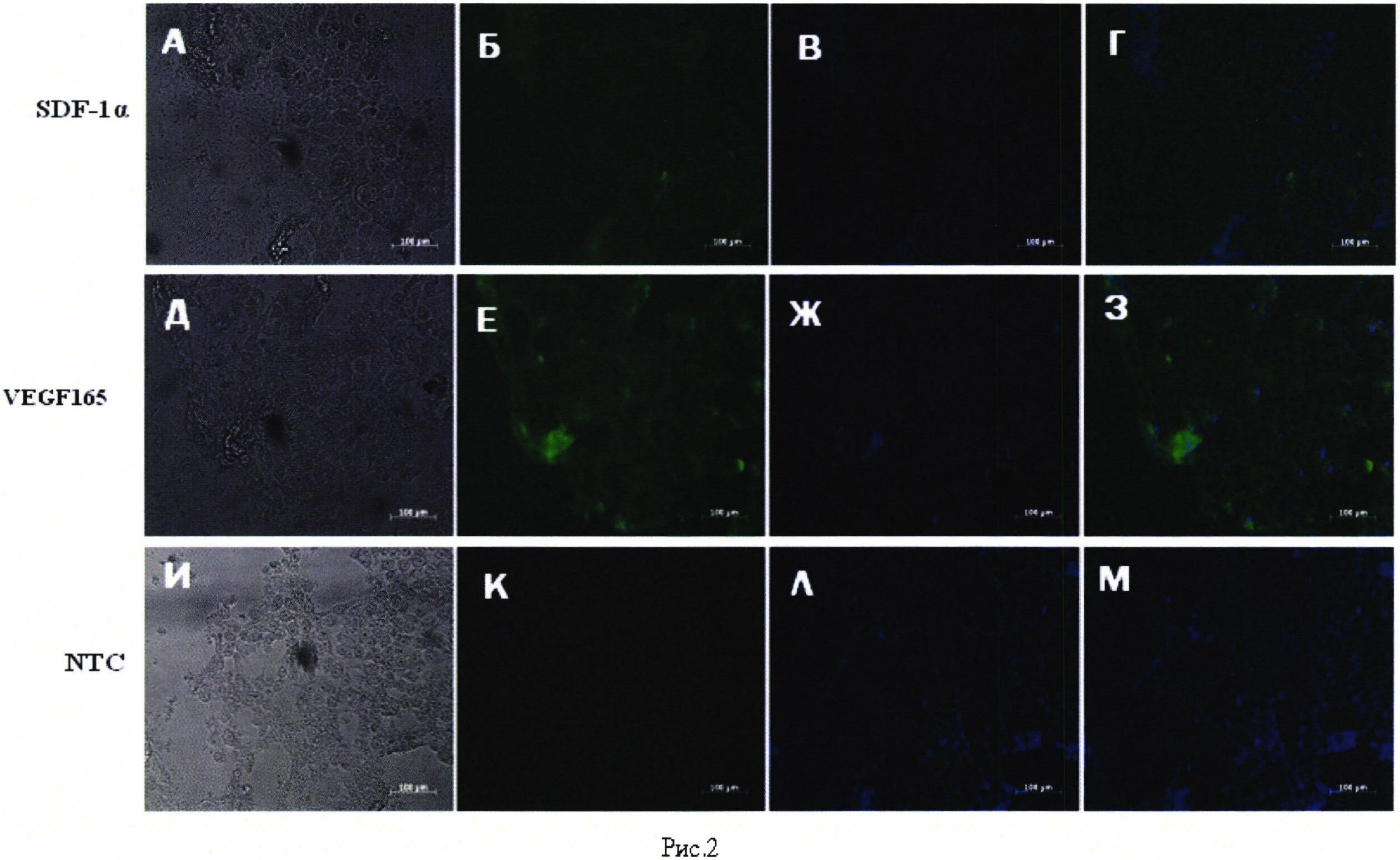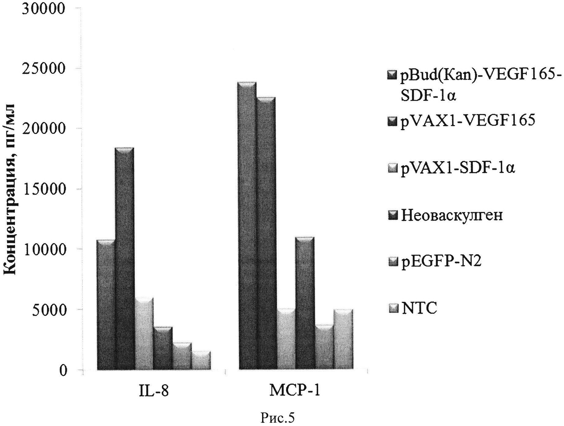 Изобретение относится к биотехнологии, а именно к генной инженерии и может быть использовано в создании генно-терапевтических средств. Разработана генетическая конструкция, которая позволяет одновременно экспрессировать несколько рекомбинантных генов, которая может быть использована в создании лекарственных средств. На базе генетической конструкции pBud(Kan) создана рекомбинантная плазмида, включающая оптимизированные по кодонному составу нуклеотидные последовательности генов сосудистого эндотелиального фактора роста изоформы 165 (англ. Vascular endothelial growth factor 165, VEGF165) и фактора стромальных клеток 1α (англ. Stromal cell-derived factor-1, SDF1-α), Сосудистый эндотелиальный фактор роста VEGF-A, впервые описанный как сосудистый фактор проницаемости (англ. Vascular permeability factor, VPF), является основным регулятором ангиогенеза и васкулогенеза. VEGF-A - это димерный 34-42 кДа дисульфид-связанный гликопротеин. VEGF-A является специфичным митогеном для сосудистых эндотелиальных клеток. VEGF-A индуцирует пролиферацию эндотелиальных клеток (ЭК), их прорастание и формирование каппилярных трубочек. Он также является мощным фактором выживания для ЭК и индуцирует экспрессию антиапоптозных белков в этих клетках. Делеции генов, кодирующих VEGF-A, приводят к серьезным дефектам и неправильному развитию сердечно-сосудистой системы. Ген VEGF-A человека расположен в хромосомном локусе 6р21.3. Кодирующая область охватывает около 14 т.п.н. VEGF-A существует в нескольких изоформах: VEGF121, VEGF145, VEGF148, VEGF165, VEGF183, VEGF189, VEGF206, образуемых в результате альтернативного сплайсинга мРНК, которая состоит из 8-ми экзонов. Каждой изоформе VEGF соответствует определенная внеклеточная локализация, основанная на их биохимических различиях в способности связывать гепарин- и гепаран-сульфат. Так, все транскрипты гена VEGF-A у человека содержат экзоны 1-5 и 8, различия же обусловлены альтернативным сплайсингом экзонов 6 и 7. VEGF165 - изоформа, преобладающая в большинстве тканей и являющаяся наиболее биологически активной, она представляет собой основной белок, способный связывать гепарин, и, хотя значительная доля его остается связанной с клеткой, большая часть свободно секретируется. У данной изоформы отсутствуют аминокислотные остатки, включение которых в белковую молекулу кодируется экзоном 6. Данная изоформа является физиологически самой часто встречающейся и биологически наиболее активной. VEGF165 обычно секретируется в виде 46 кДа гомодимера, обе субъединицы которого имеют массу 23 кДа. Фактор стромальных клеток 1 альфа (англ. Stromal cell-derived factor-1 alpha, SDF-1 alpha) - небольшой цитокин, принадлежащий к семейству хемокинов, который также называется лиганд хемокина 12 (Chemokine ligand 12, CXCL12 alpha). SDF-1 alpha и beta активируют противовоспалительные процессы. CXCL12 вызывает хемотаксис лимфоцитов. CXCL12 является лигандом рецептора CXCR4. Передача сигналов CXCR4-CXCL12 вызывает хемотаксис, увеличение пролиферации и снижение апоптоза. Во время эмбриогенеза он управляет миграцией кроветворных клеток из печени плода в костный мозг и формированием крупных кровеносных сосудов. В зрелом возрасте CXCL12 играет важную роль в ангиогенезе путем привлечения эндотелиальных клеток-предшественников (англ. Endothelial progenitor cells, EPCs) из костного мозга через СХС114-зависимый механизм. Пример применения генно-инженерной конструкции pBud(Kan) заключается в создании рекомбинантной плазми